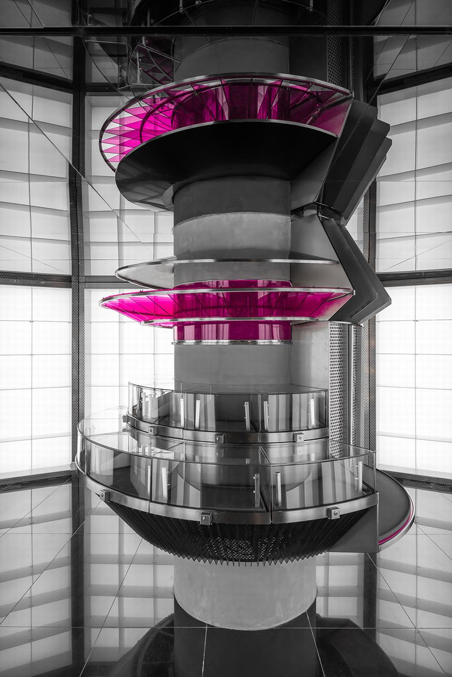 顶部破碎的装置就像一个爆炸的能量板,聚集和集中在粗壮的光源圆柱体中。两侧的架子是对称的,一层一层的,像小山一样上升。进入数据仓库,这个被光源包围的神秘空间就像一个宝库。空间的中心是象征时间和空间的数据传输塔,就像连接线上和线下的精密仪器。发光的墙壁产生了一个虚拟的图像,通过上下镜子无限延伸,暗示着虚拟世界。