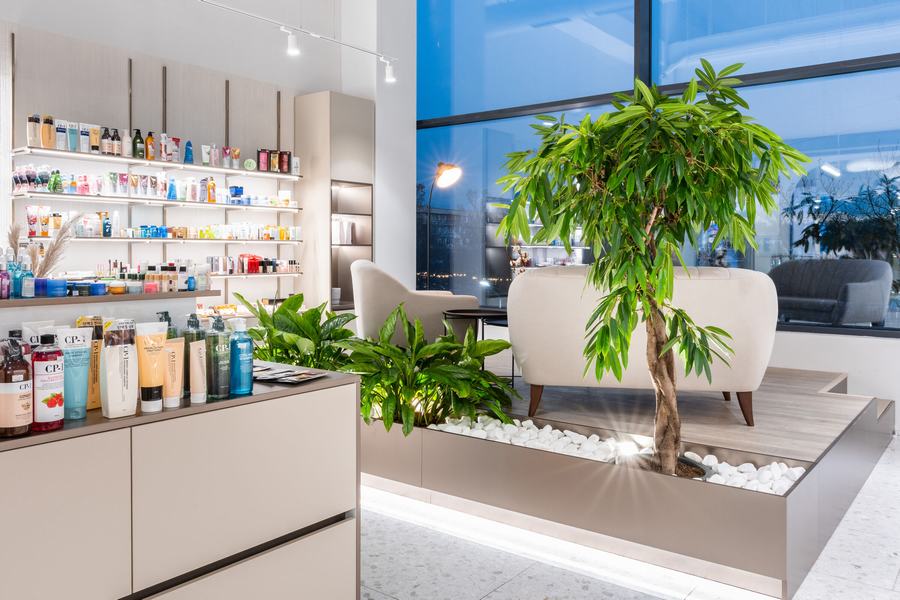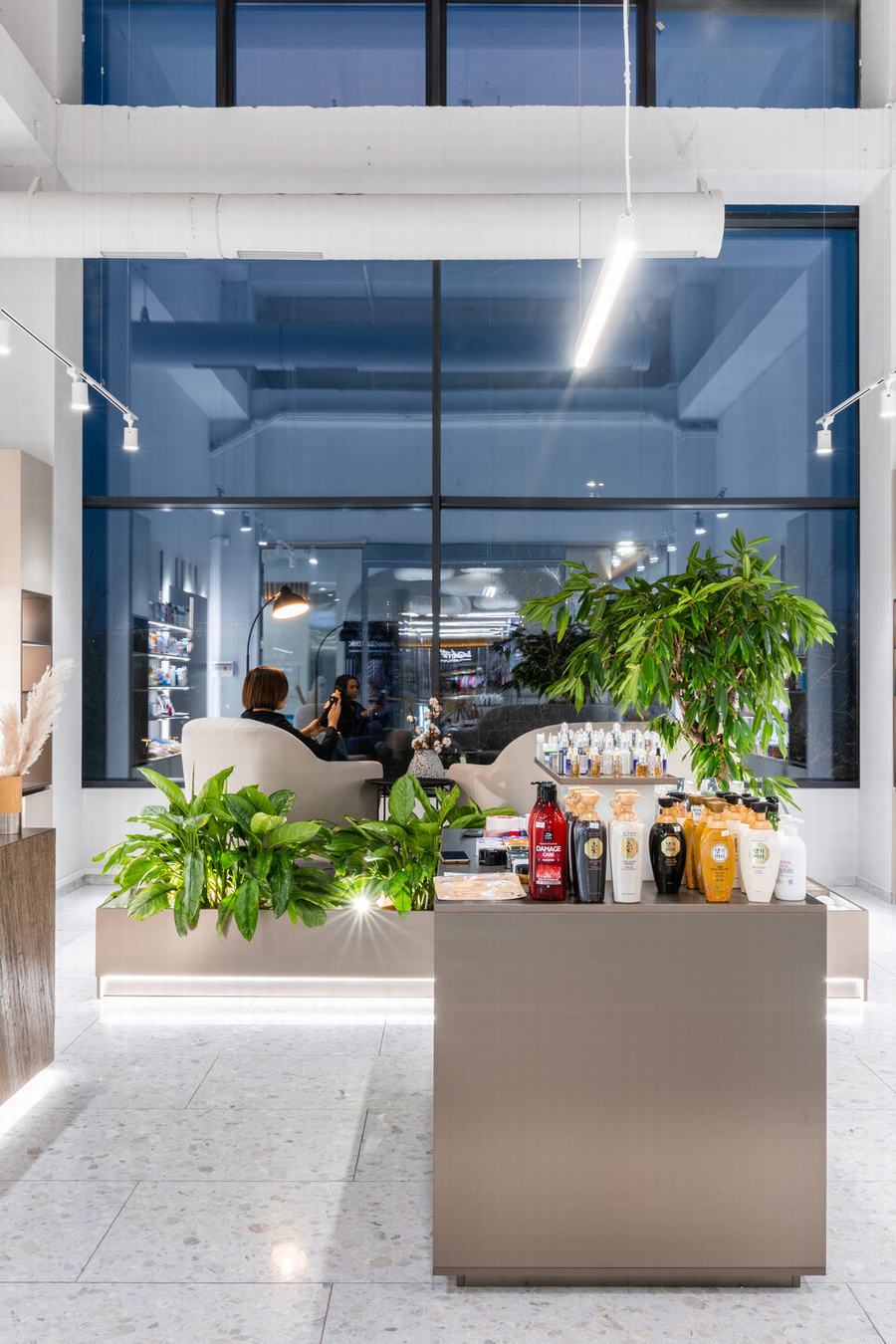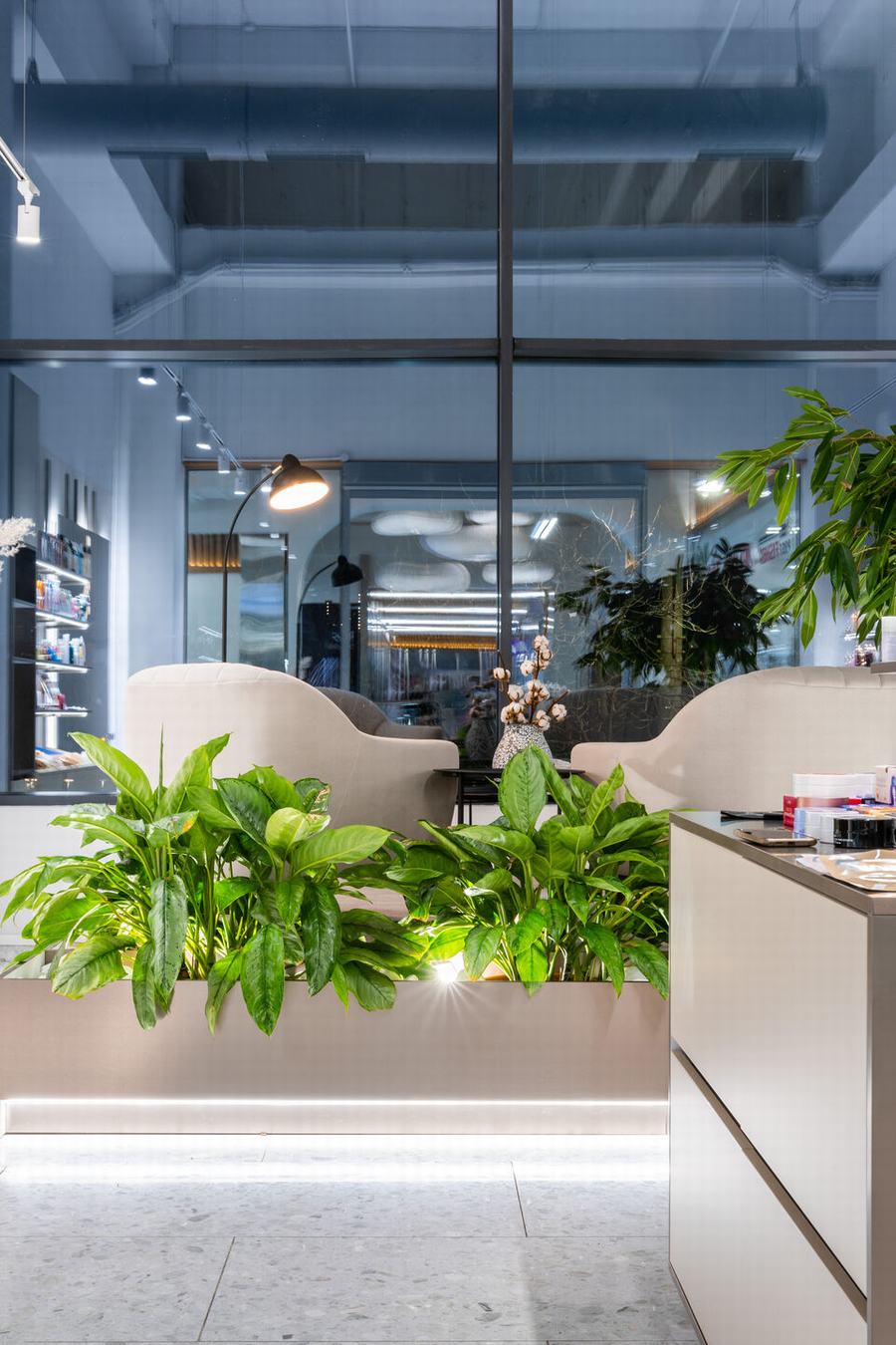 全景窗户让我们创造了一个明亮的室内空间,而中性色调在这方面帮助了我们。设计以白色、灰色和金属细节为主,这些细节以简洁的几何形状结合在一起。接待处也是收银机的地方,是个性化的。标志和名称出现在后墙上,家具模仿石头的坚硬结构。