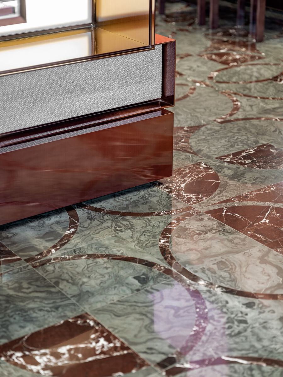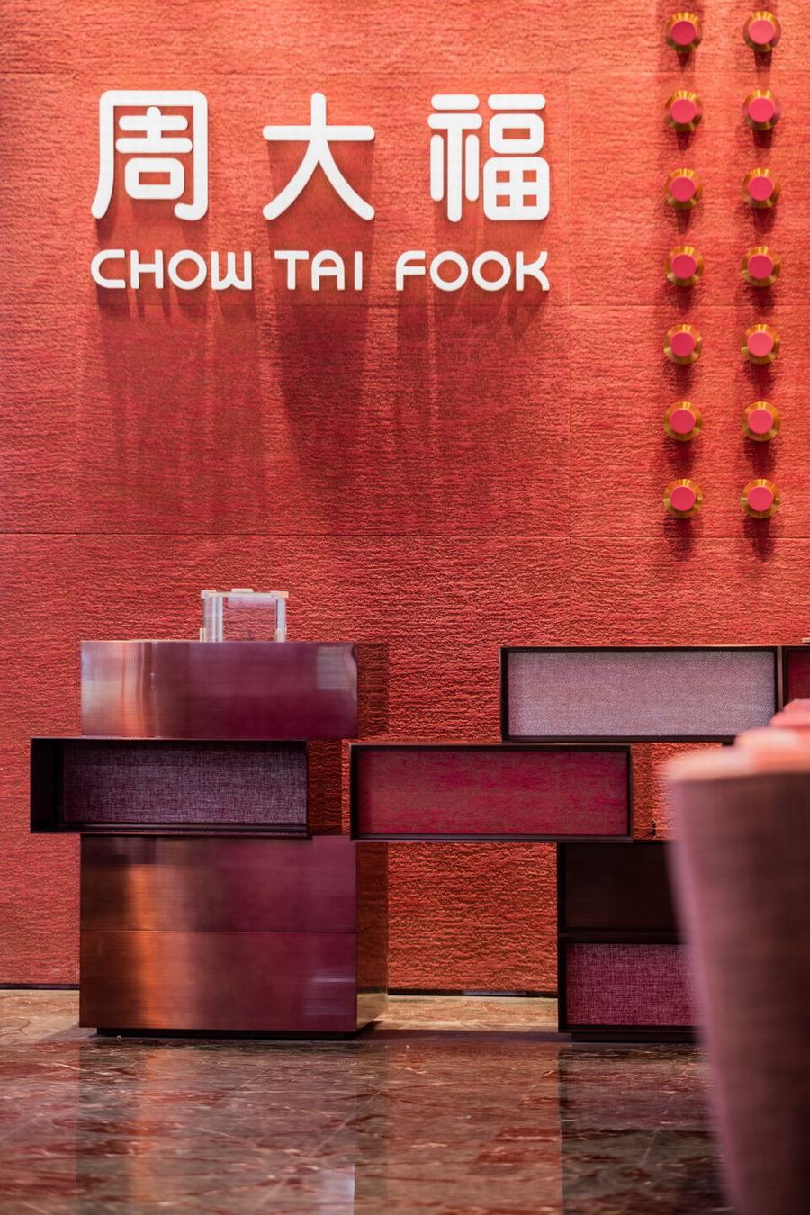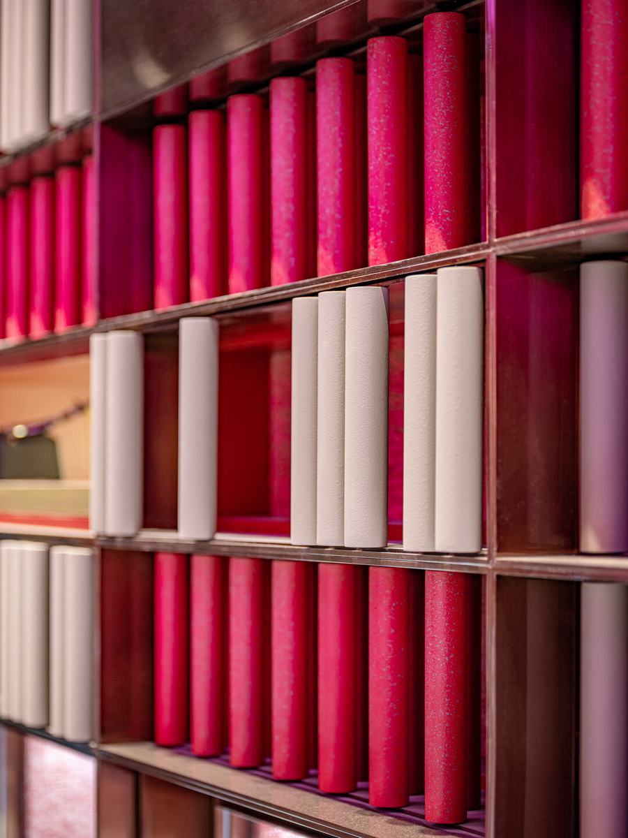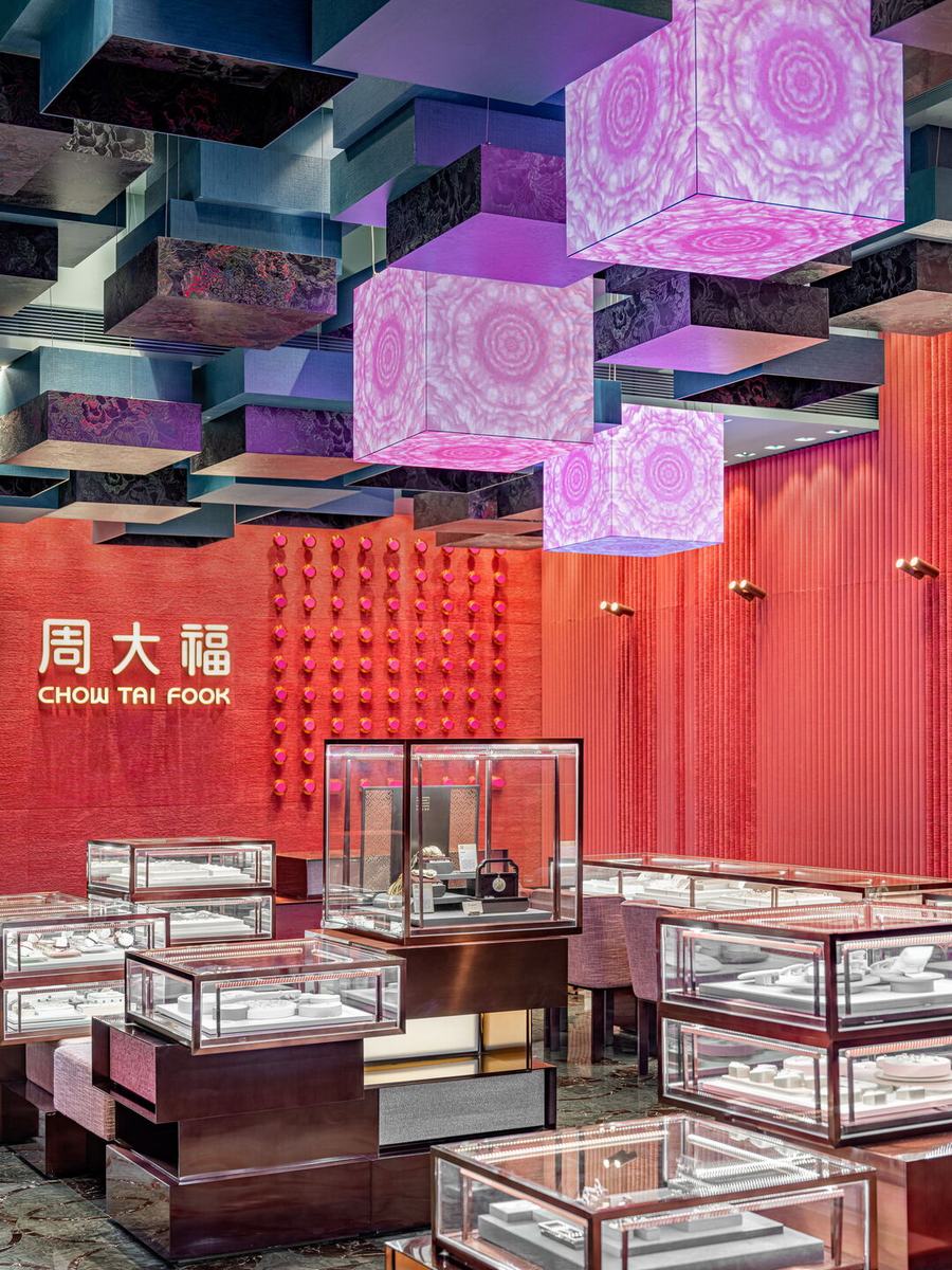 红墙是根据礼品盒和宫殿柱子的形状设计的。你还可以看到红色的柜子和柱子在店里随意的分布。墙面采用了不同深浅的颜色,营造出动态而生动的视觉效果。