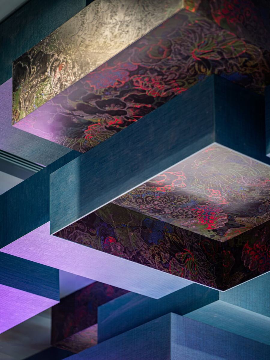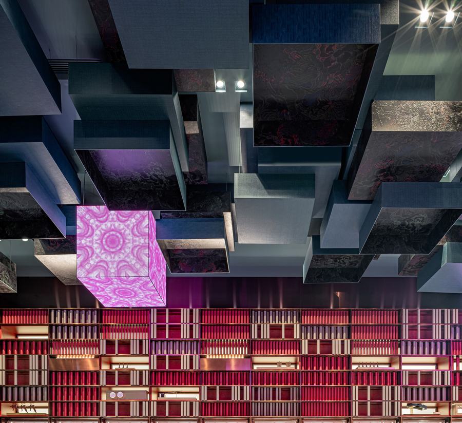 红色被选为主要的配色方案,象征荣誉。天花板上的绿色盒子呼应了“礼物”的设计主题。红色和绿色的组合相当引人注目。除了增强视觉效果外,还可以吸引参观者对天花板上的盒子设计的注意。