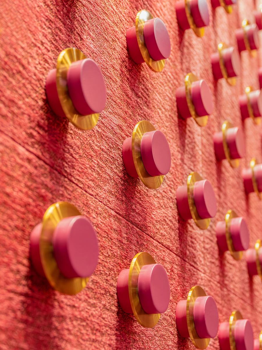 紫禁城是明清两代皇帝的住所和办公室。因此,它无疑是北京最重要的地标之一。大门上的圆柱和螺柱绝对不是紫禁城的主要设计特征。在店铺的背景墙上,我们仔细地重新设计了粉色和金色的饰钉。耳钉按9根排列,代表长寿和力量。
