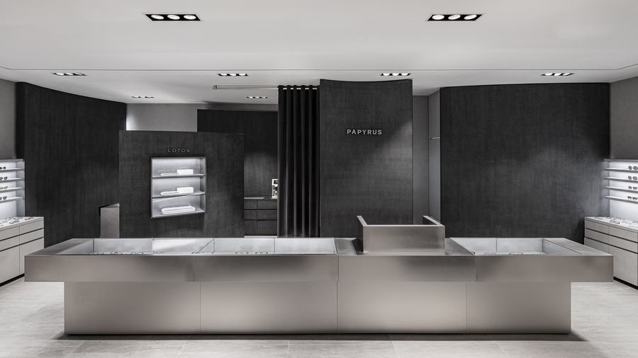 WGNB的设计师参考了20世纪70年代韩国的一种以单色调色板为中心的绘画运动——来形象化60平方米的零售空间。“Papyrus”是首尔百货商店“Galleria”西厅的“高级租户”之一。除了同名品牌,该店还提供Thom Browne、Anne et Valentin和Linda Farrow等奢侈品牌的眼镜系列。