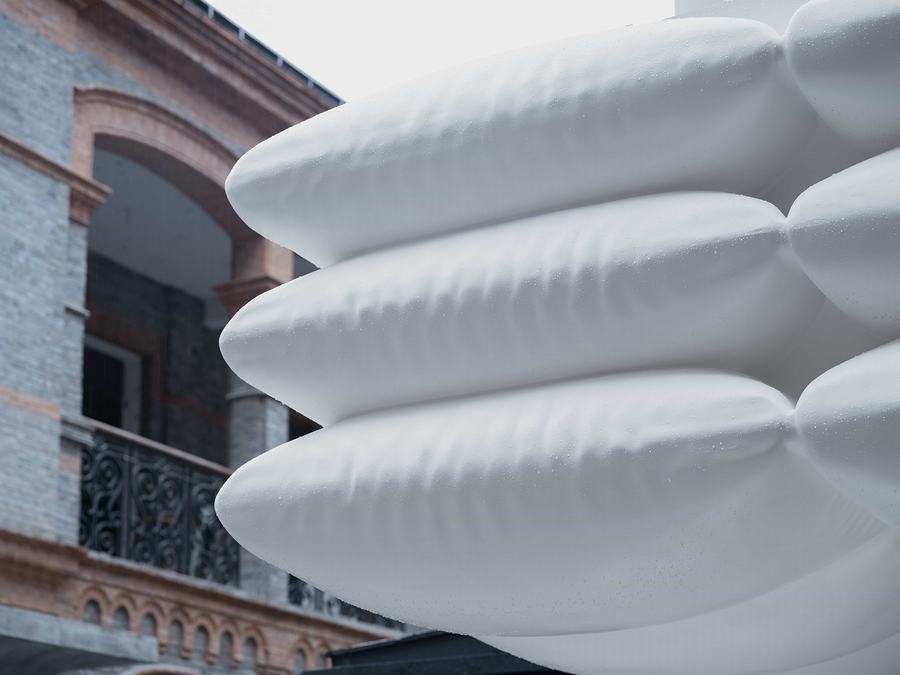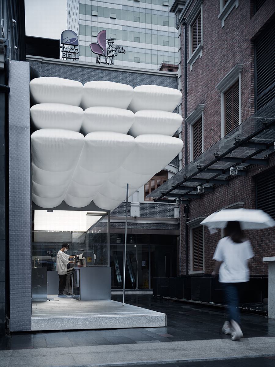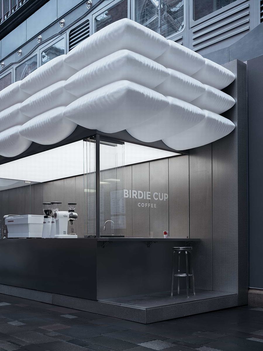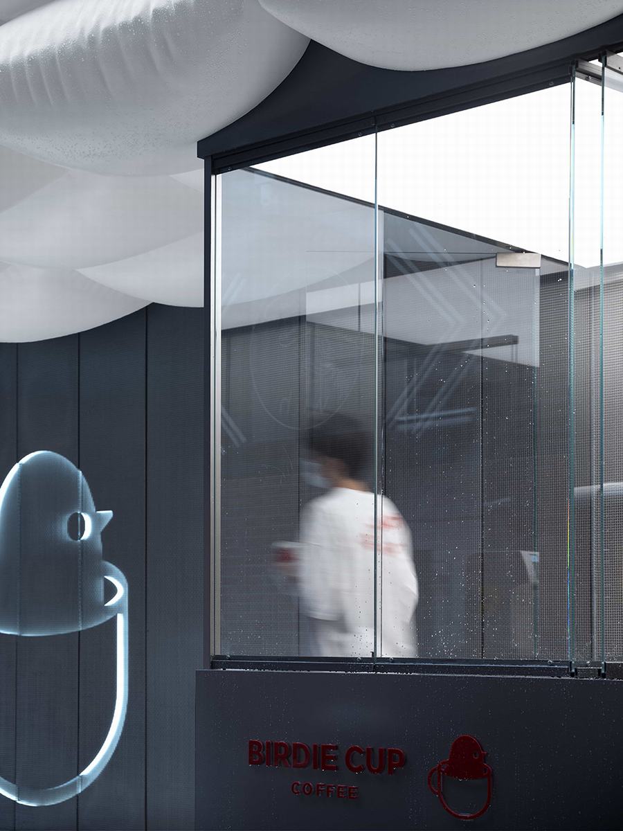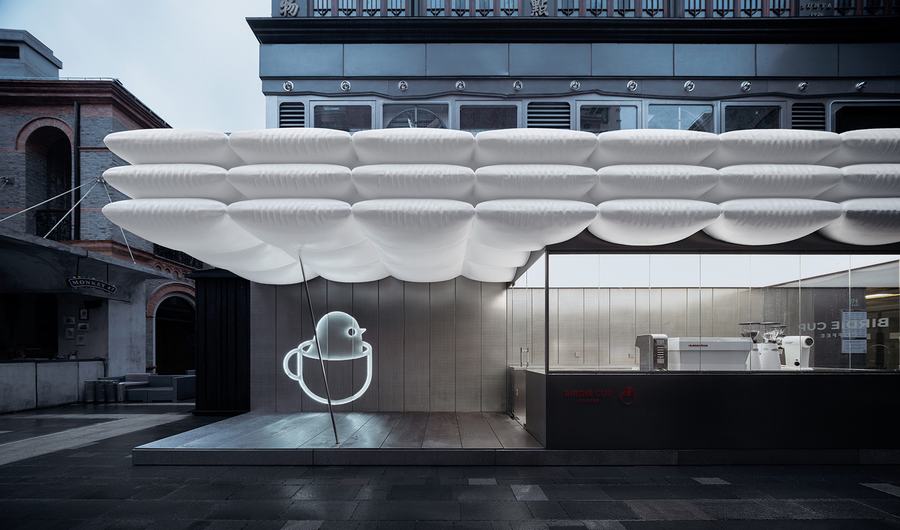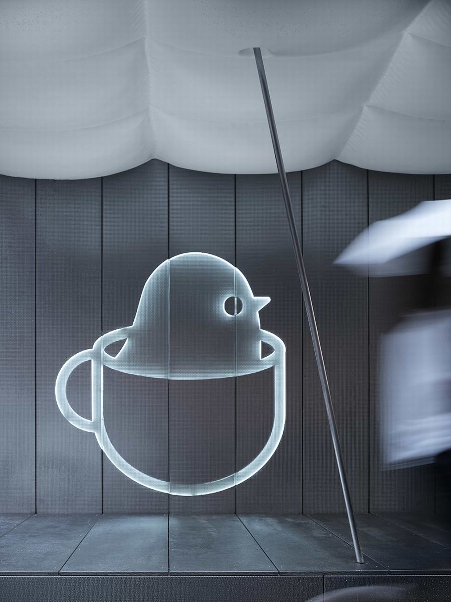 云朵、枕头、气球或宇宙飞船——我们避免将屋顶与任何一个意象联系在一起,从而鼓励人们想象自己与这个空间的自发联系。就像咖啡可以消除疲劳一样,我们也希望这些“飞蚊”能帮助人们放松一下。在其他可能性中,云意象在品牌名称中形成了“小鸟”的话语,暗示了互联网时代的一切都被重新定位到云,生活与数字交织在一起。