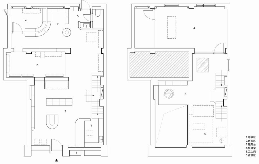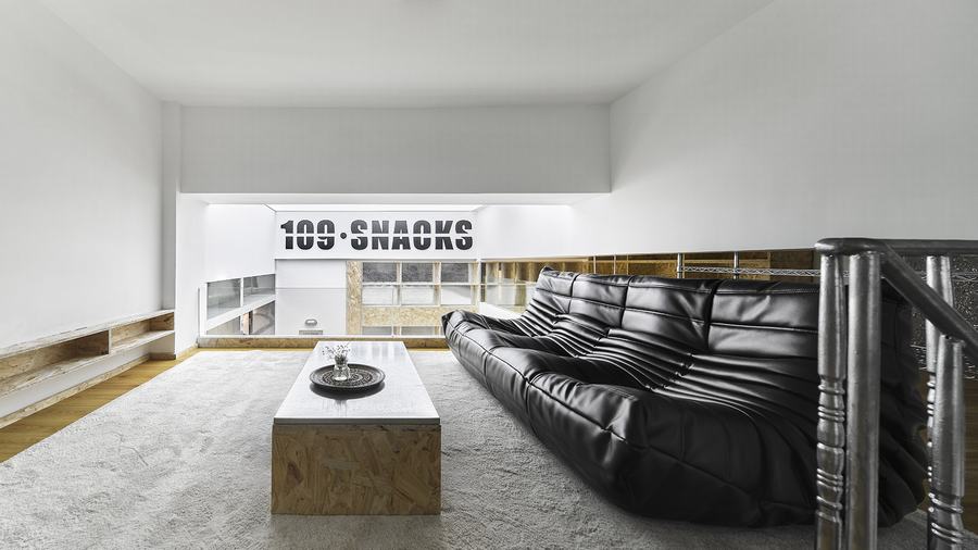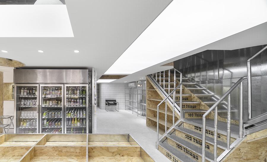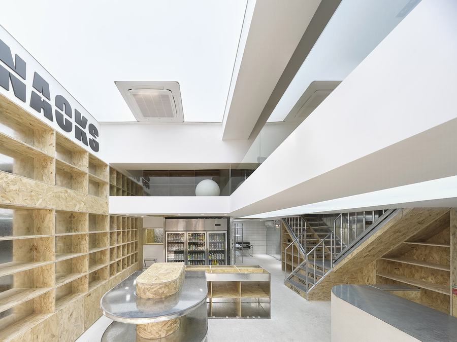 原有内部钢结构夹层保留。夹层上方和下方的空间高度在一个人的手臂可以触及的范围内。整个空间包括一个三段阶梯空间和一个贯穿的通道。最让人印象深刻的是在三部分空间中,两面墙上的两个大小不同的方形窗户。人们可以透过这两扇窗户,斜着看整个空间。使用保守的方法来创建这个地方,内部订单将基于三种类型的产品建立。