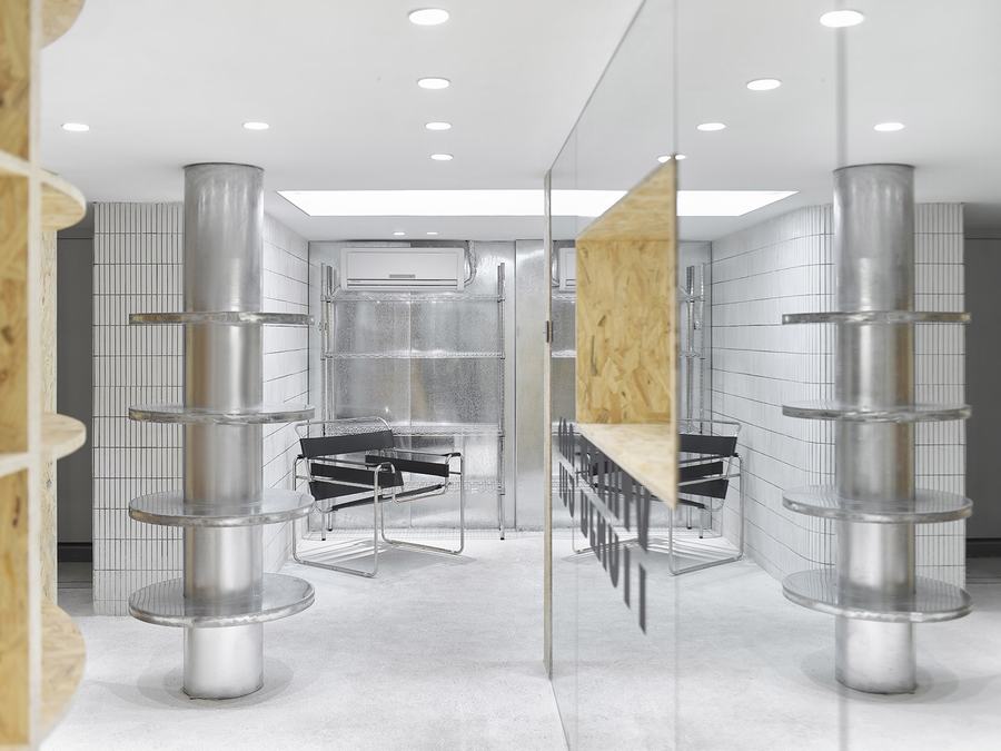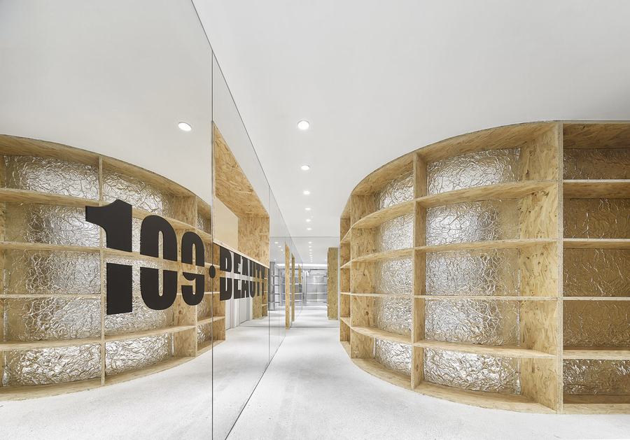 部分墙壁和展示柜以锡箔摩擦和折叠。镀锌板和锡箔具有不同程度的漫反射特性,使产品具有反射性纺织品的抽象感。手工折叠的锡箔,机械镀锌板和刨花板为立面创造了节奏的变化。
