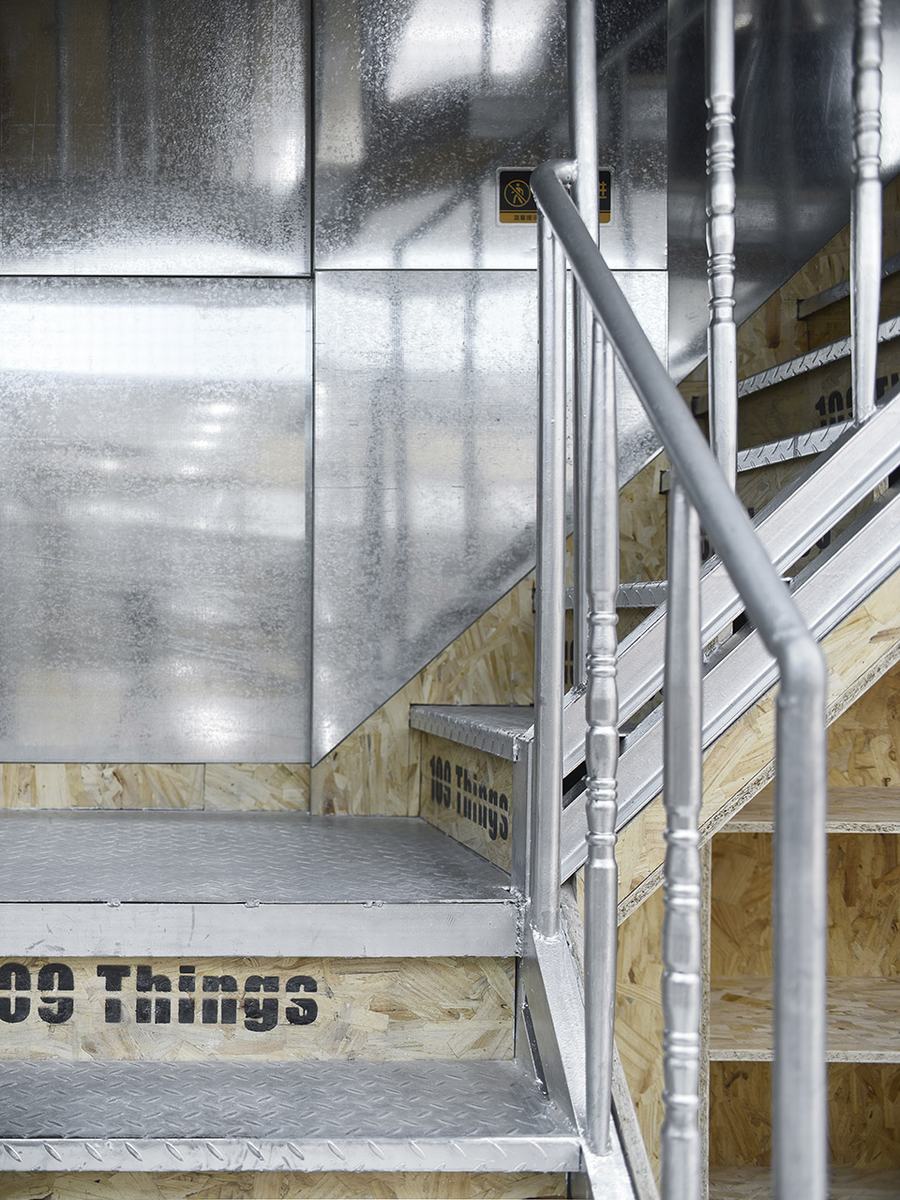 刨花板、镀锌板、水洗石作为空间设计的材料语言。三种产品的展示区域同时被材料隔离和连接。入口处加了一扇窗户。游客通过三层的窗户观看内部,只能看到局部区域,并发现内部由一根绳子连接的三个“盒子”。内部所有橱柜、机架、木板、盒子等容器均以刨花板为基材。刨花板表面的粒状片段和镀锌板表面的雪花状图案增添了空间的立体感。水洗石材地板也给人留下自然朴素的印象。水洗过的石头覆盖了所有的内部地板区域,模糊了边界。