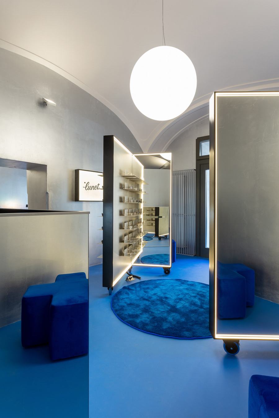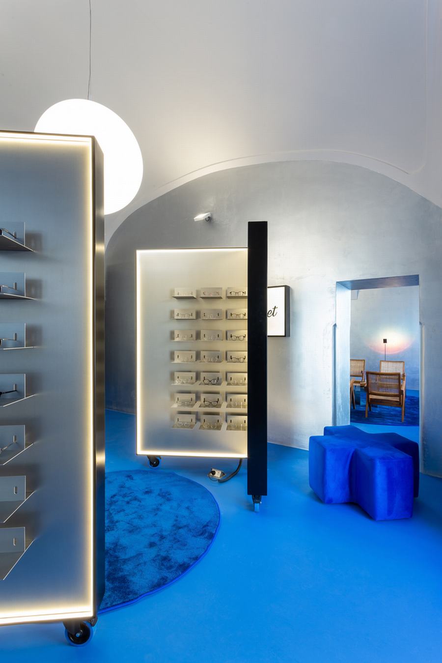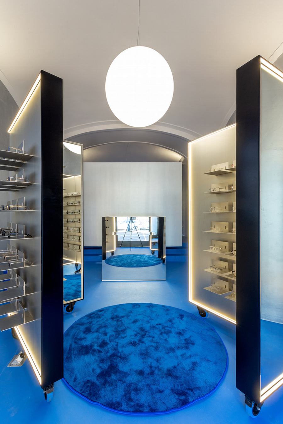 最重要的元素是眼镜展示,有相同的形状的第一家店创造了亲密的试镜站,可以让多个顾客同时试戴眼镜,并拥有一个有足够个人空间的私人区域,增加了 量身定制的,以客户为中心的体验。新设计中融入的第二个元素是银色的墙壁,这是对原始金属窗帘的重新诠释,作为鲜艳的蓝色地板和乳白色天花板拱门之间的渐变表面。
