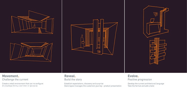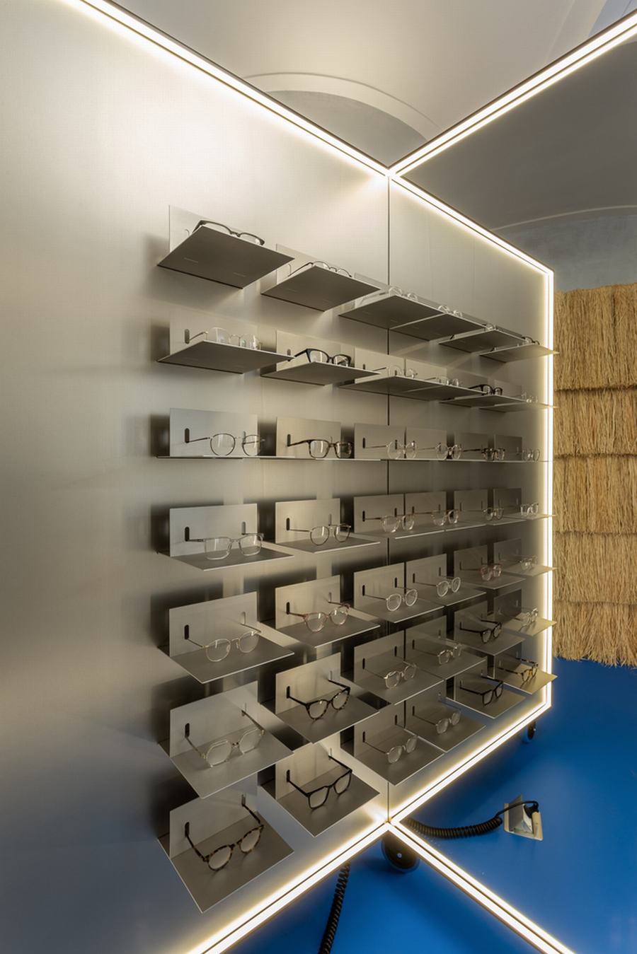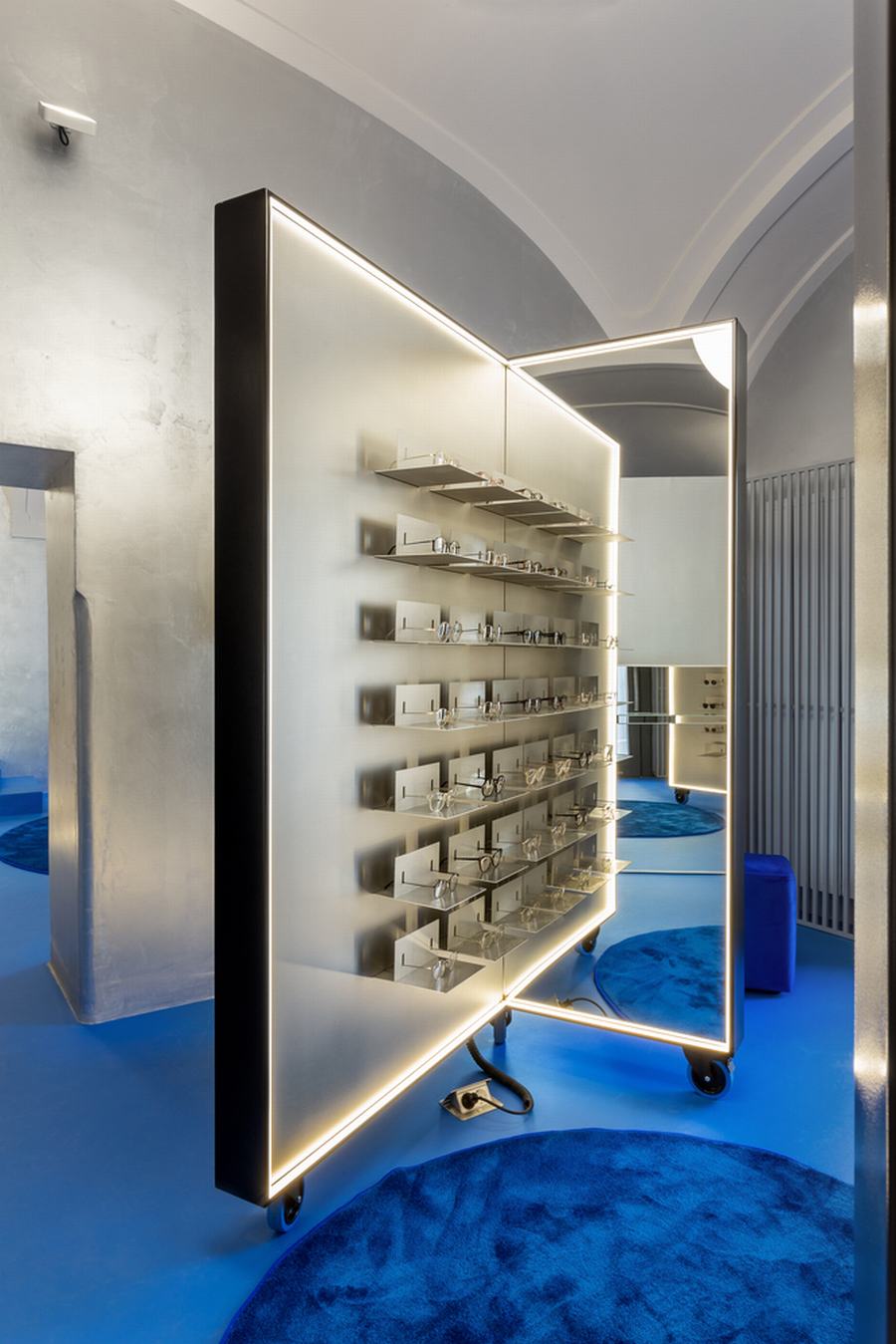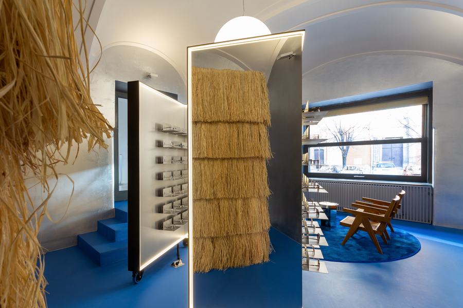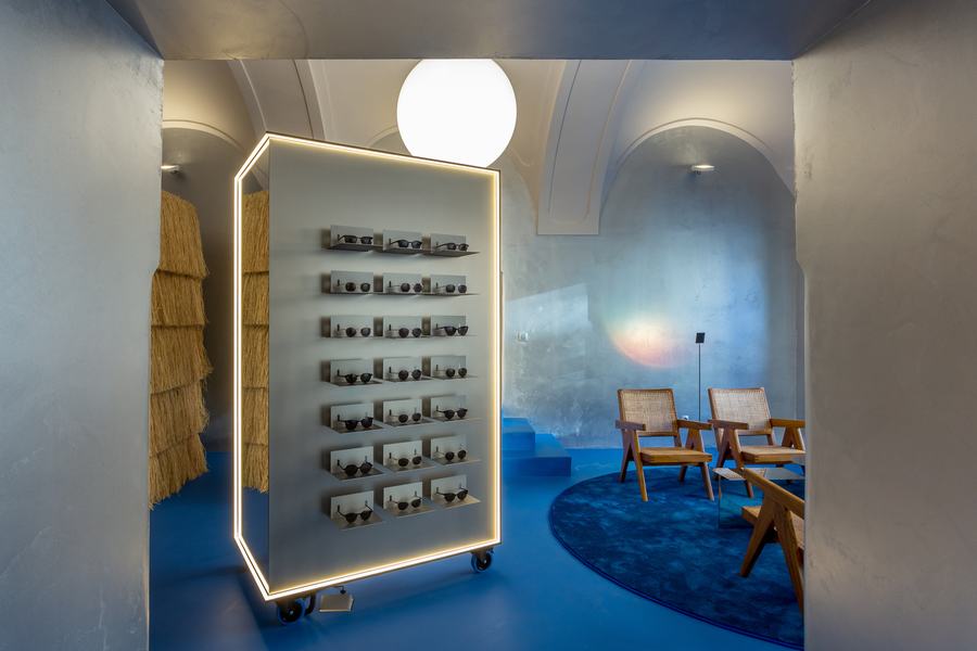 最重要的元素是眼镜展示,有相同的形状的第一家店创造了亲密的试镜站,可以让多个顾客同时试戴眼镜,并拥有一个有足够个人空间的私人区域,增加了 量身定制的,以客户为中心的体验。新设计中融入的第二个元素是银色的墙壁,这是对原始金属窗帘的重新诠释,作为鲜艳的蓝色地板和乳白色天花板拱门之间的渐变表面。