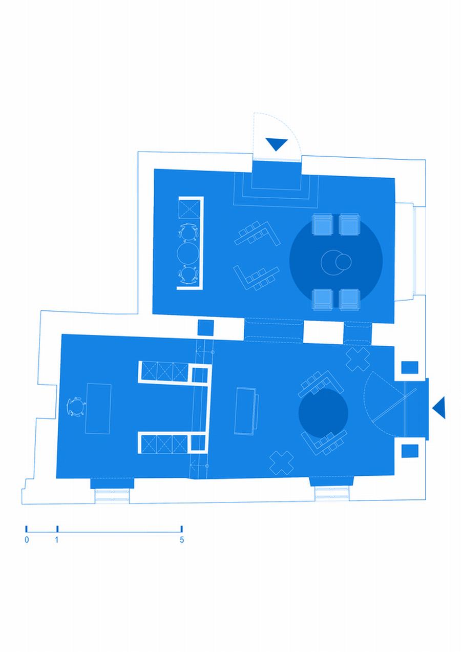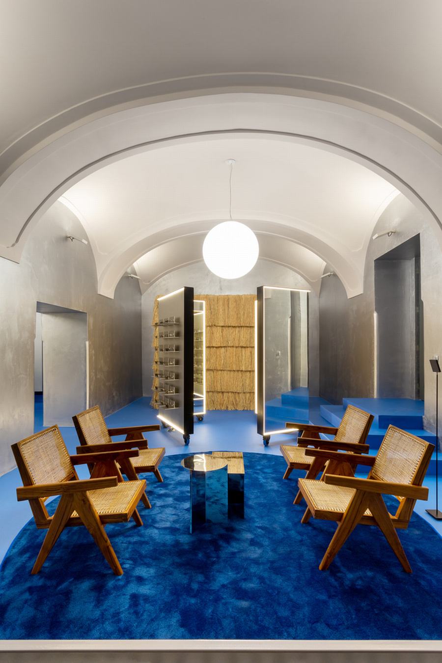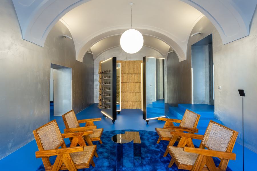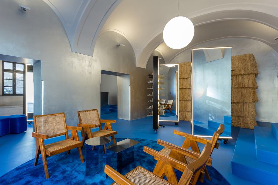 空间被强烈的地板颜色所主导,这是对马瑞尔蓝的参考和致敬,在我们的道路上创造一个感觉良好的情感绿洲。强烈的,充满活力的蓝色在环氧树脂到郁郁葱葱的地毯的各种纹理中重现,为所有银金属元素提供完美的背景,也为自然,有时原始插入的纹理。该商店位于一座18世纪的历史建筑中,设计为新旧之间的对话,旨在用当代美学来缓和近三百年的历史。