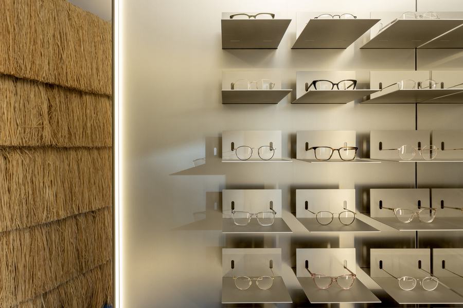 金属银色的墙壁,几乎像来自未来的宇宙飞船,增强了尖锐的铝眼镜显示,与自然材料的使用平衡,如拉菲亚,包围了展厅的操作区域的墙壁。酒椰树被连续排列,并参照传统的芦苇屋顶进行修剪,休息区由柚木和编织藤条制成的椅子将其四舍五入。Lunet保持了他们空间的优良传统,总是为伟大的设计提供一个节点,这次使用了瑞士建筑师Pierre Jeanneret设计的Easy Chair,与丹麦品牌Hay设计的镜子型Slit桌子完美地搭配并并在一起。光线对于消费者如何感知产品和空间起着至关重要的作用。