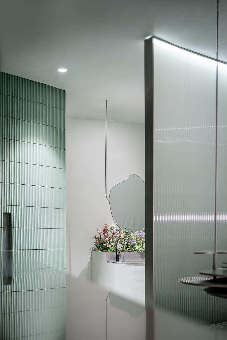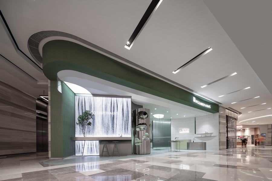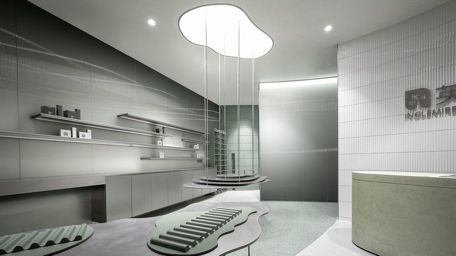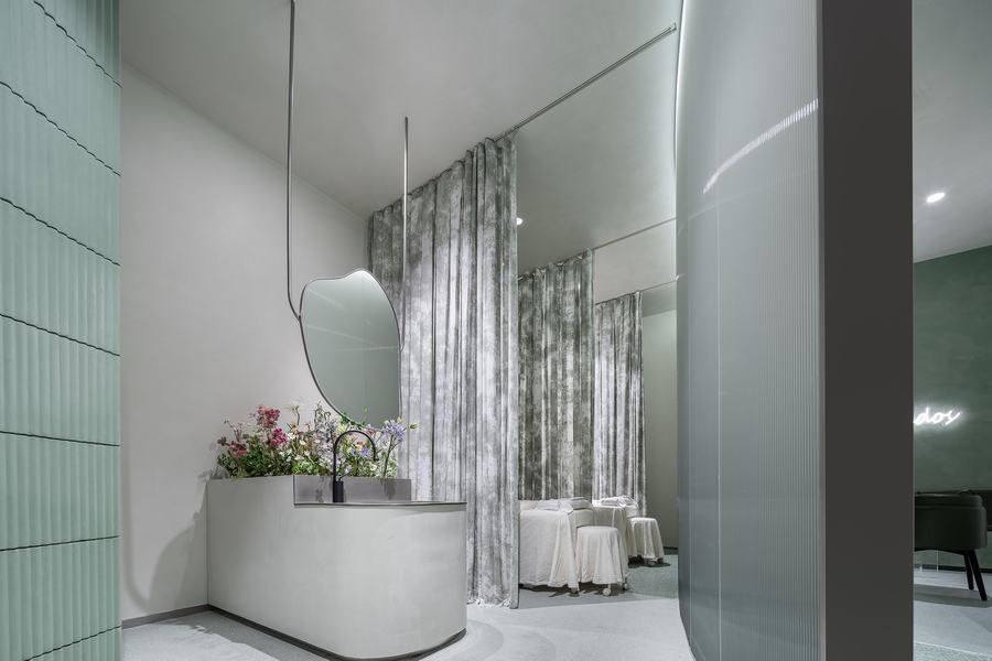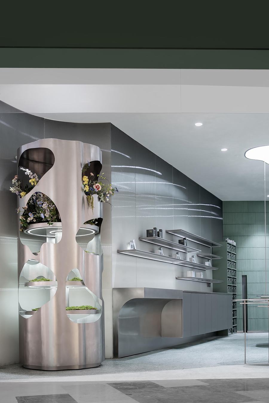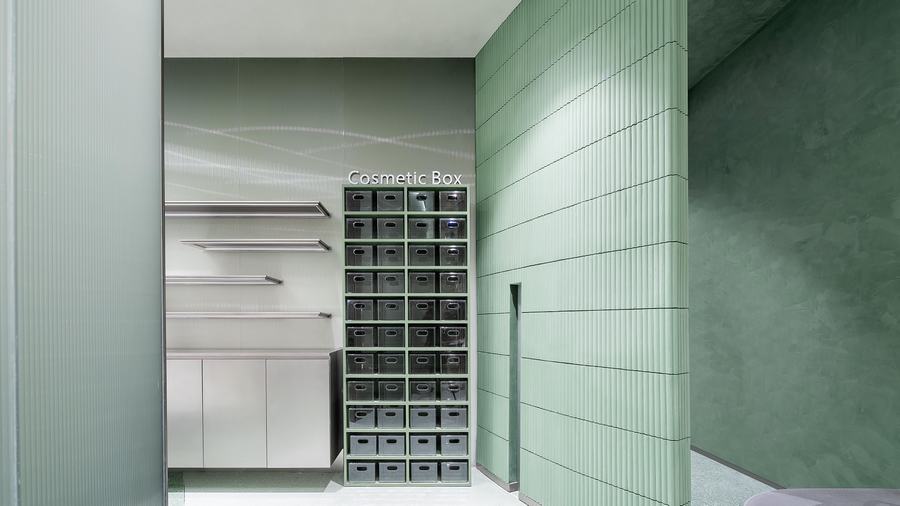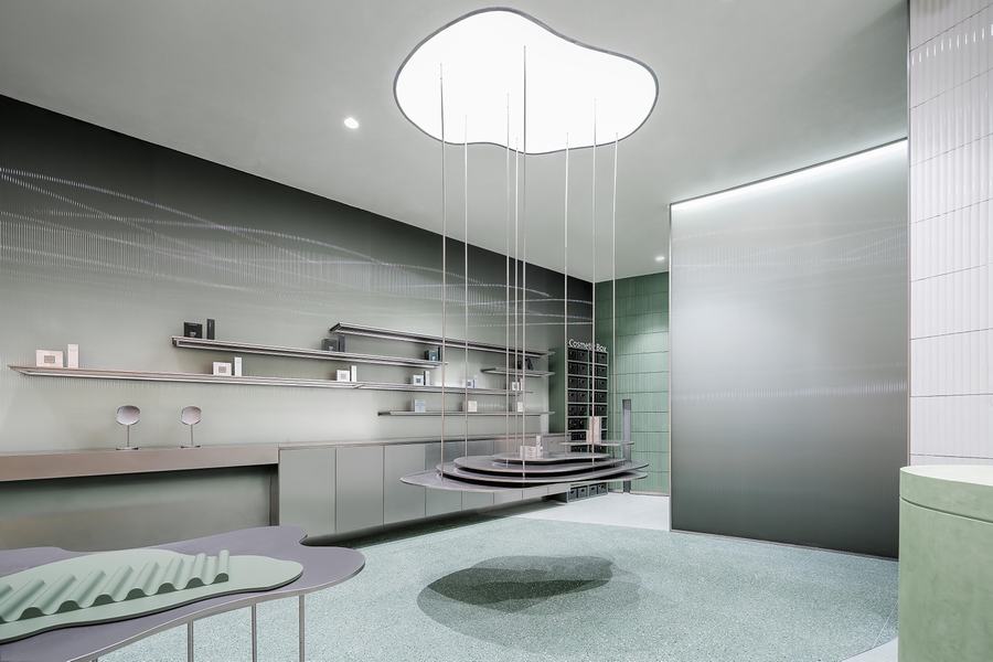 设计师摒弃使用普通砖,手工瓷砖与玻璃质感形成材料铺设的粗犷感,增强整个空间的自然简约感。从零售区到护肤品区,我们采用弧形墙面和地面材质分隔线进行视觉引导,给消费者一个更加舒适放松的体验,让他们沉浸在空间氛围中,享受关于品牌的一切。