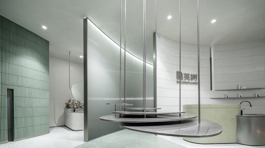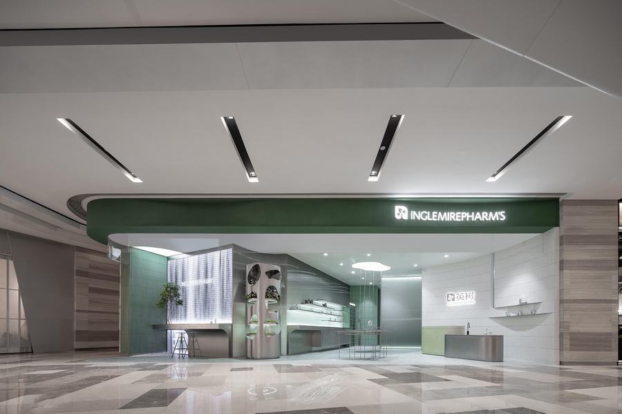 这是INGLEMIREPHARM’S 英树品牌的最新旗舰店,设计师通过对“树”意象的诠释,赋予空间灵活的感觉。人类天生热爱自然,贴近绿色,拥抱树木,在繁忙的城市生活中享受片刻放松。在钢筋水泥的城市森林中,构筑出一片充满“树”意象的绿洲。