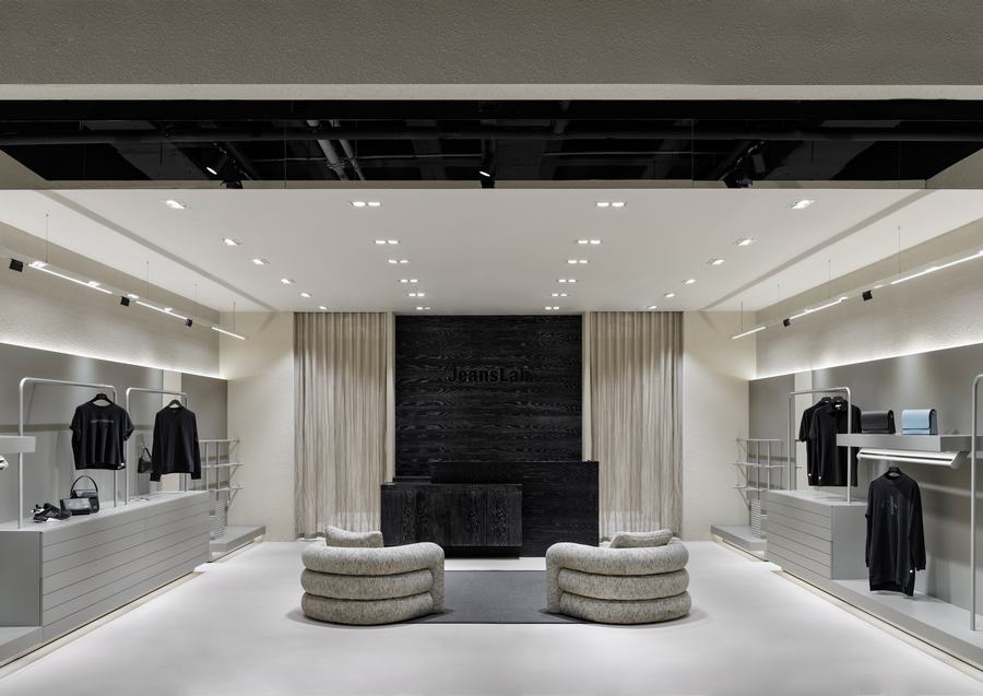 旗舰店的原始的建筑线条被勾画出来,用大弧线分割,从而将空间划分为不同的功能区域。不同材质的墙面和空间线条呈现出不同的质感,带来空间视觉张力和色彩层次,堆砌出树的朦胧意蕴。