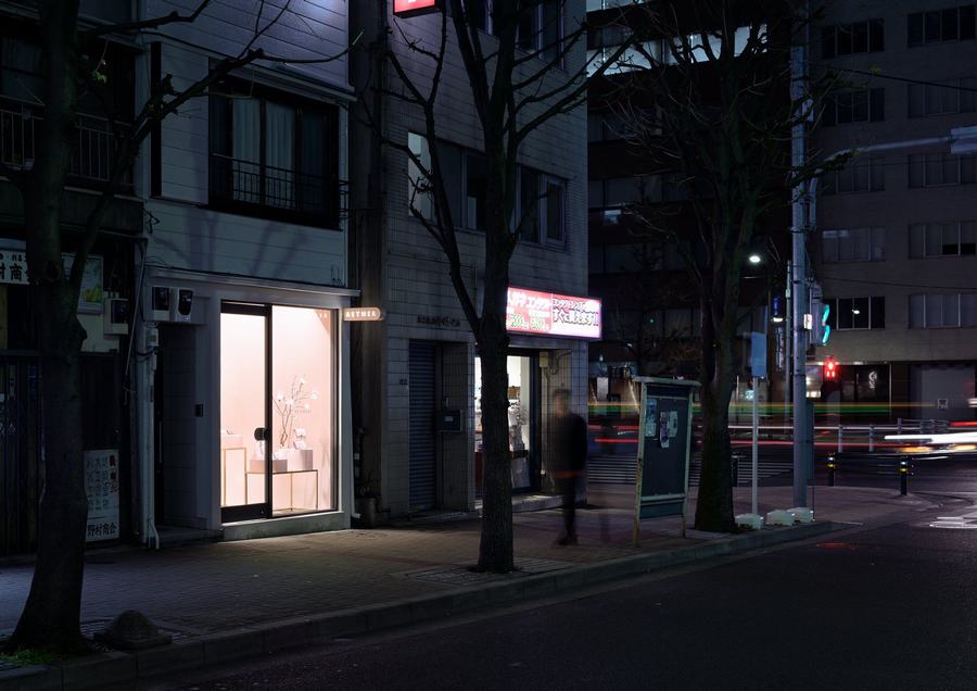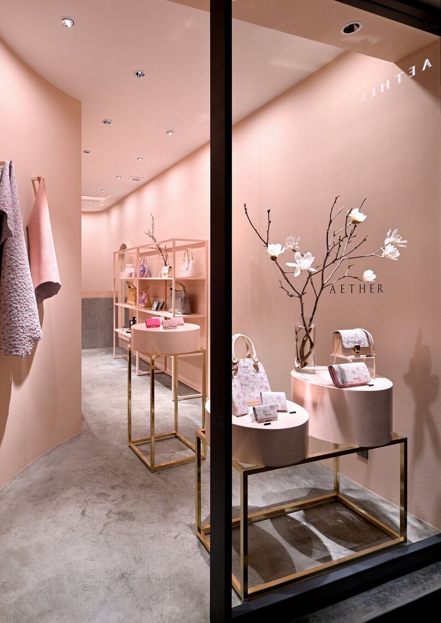 橙红色的墙壁上饰有花瓣细节,尽管店内空间紧凑,但 r 形曲线营造出柔和的流线。看到银座街景中出现的粉红色对比吸引行人的注意力也很有趣。