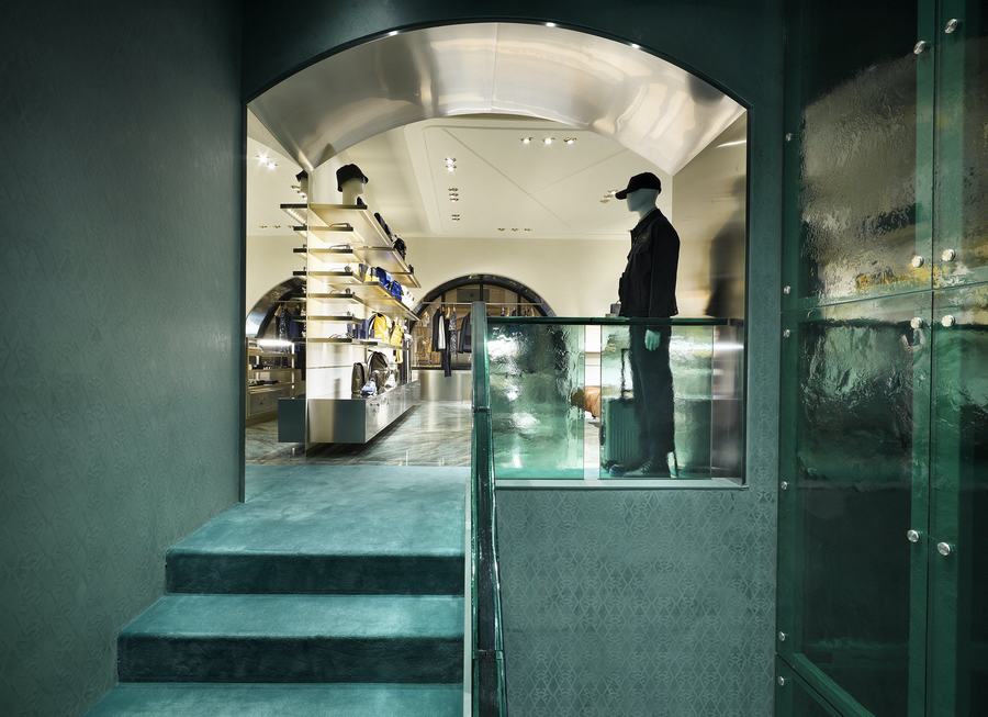 再现他们的场景特征、独特的装饰、几何图案、多色大理石和建筑场景的震荡,贯穿精品店的主要青绿色让人想起米兰和 20 年代罗马建筑使用的色调。