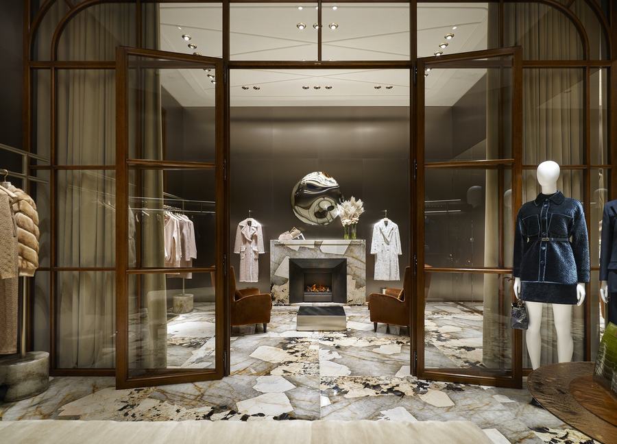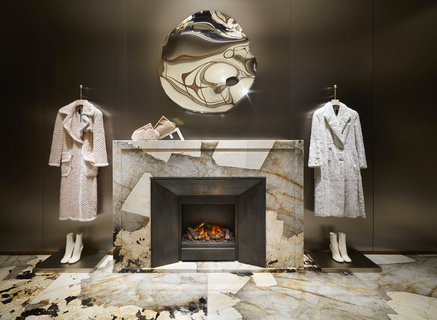 二楼紫藤色的金属板墙摆放着女装成衣和皮草系列。黑色和白色的巴塔哥尼亚大理石地板和壁炉为客人提供亲密的现代客厅的感觉。在试衣间使用金属、丝绸和毛皮饰面,奢华元素贯穿整个空间。精心挑选的定制家具和设计作品,如 Gio Ponti 的天鹅绒扶手椅和琥珀色玻璃融合桌以及 Kiko Lopes 的银色和玻璃艺术品,也装饰了商店,增添了独特的艺术气息。