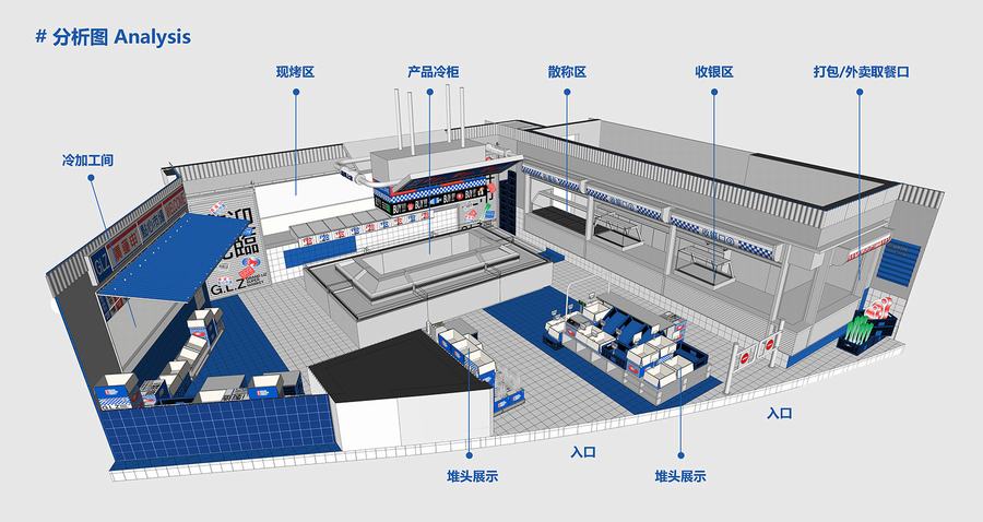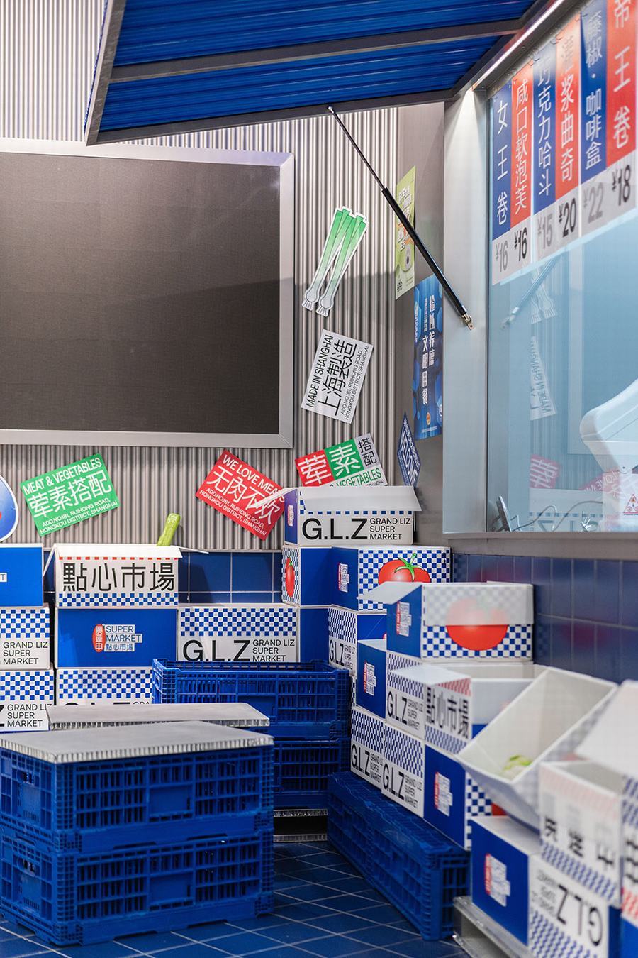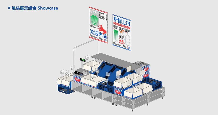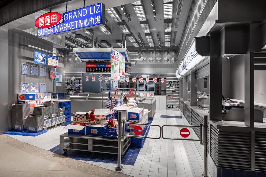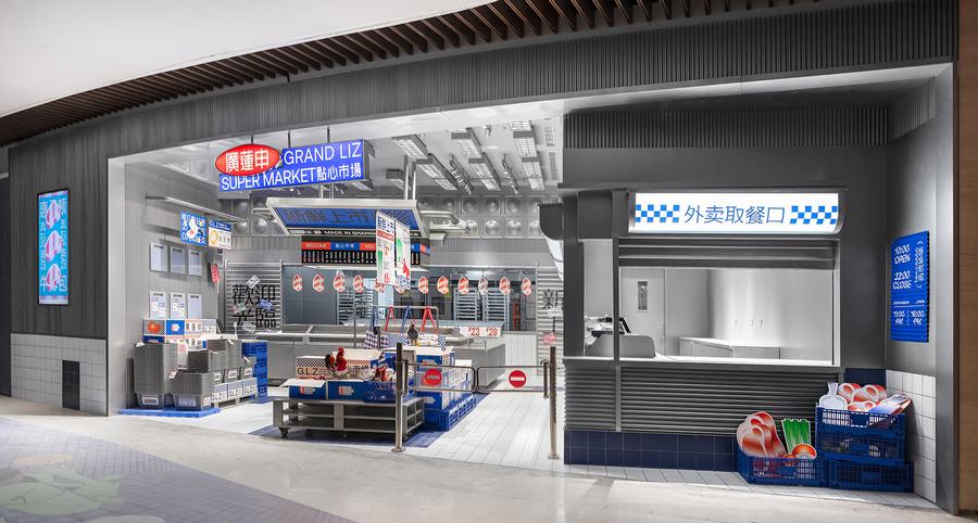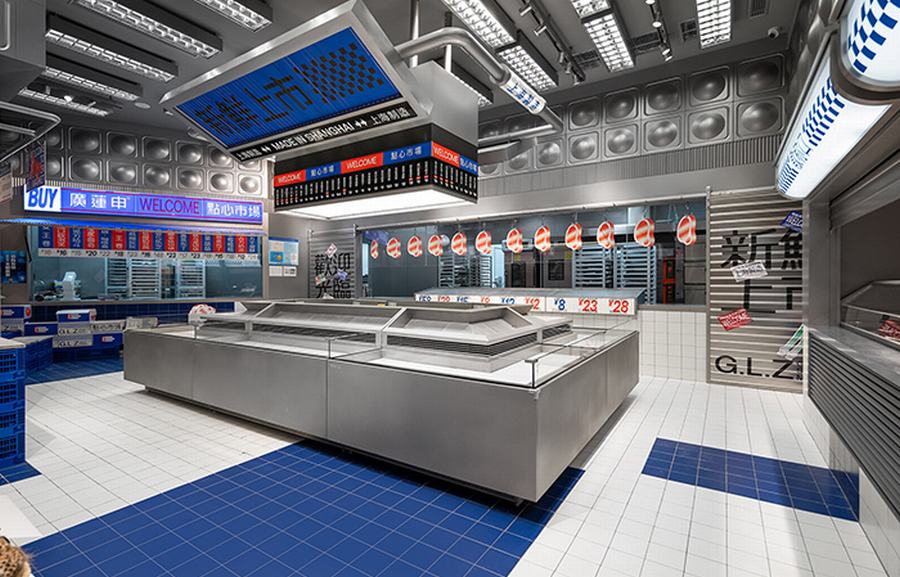 点心市集是廣莲申第一家真正意义上的主题店。我们将把销售和生产融入到市场氛围中。此外,材料和颜色空间中提取最具代表性的元素市场,如金属隔板,白色的小瓷砖,配色的蓝色和红色塑料感,“牛皮癣”到处张贴的小广告,堆积如山的货物混乱但充满民间智慧。所有的细节都“恢复”了市场应有的面貌。同时,通过巧妙的设计、重组和升级,呈现出“超市的日常场景”。我们力求呈现一个充满年轻元素、热点话题、分享欲望的时尚新零售空间。市场上的摊主总是会用手边的任何东西为自己创造一个舒适的休息角落。例如,下面的一个是堆叠两个篮子,然后放置一块木头,这是一个小长椅——座位区。