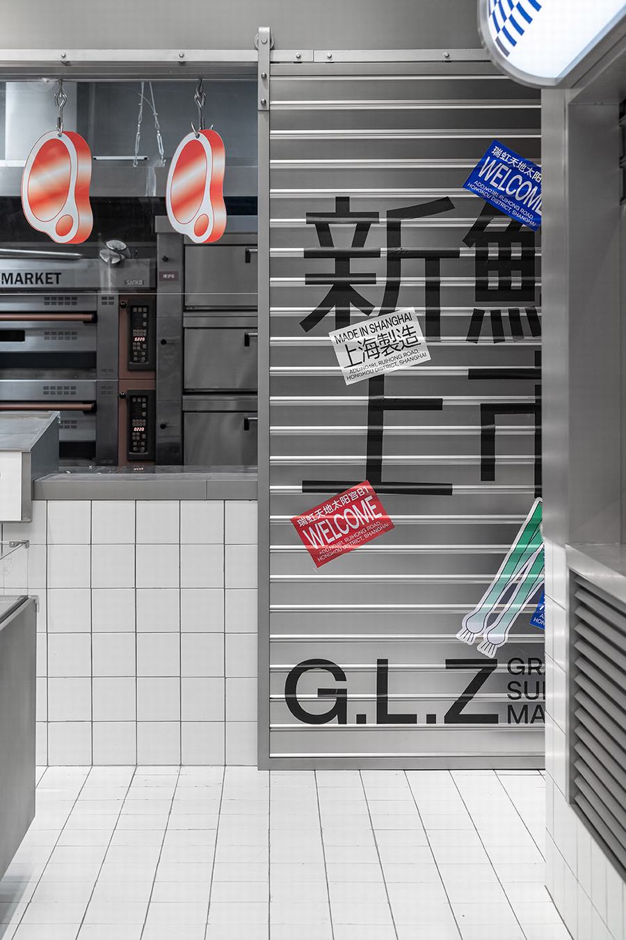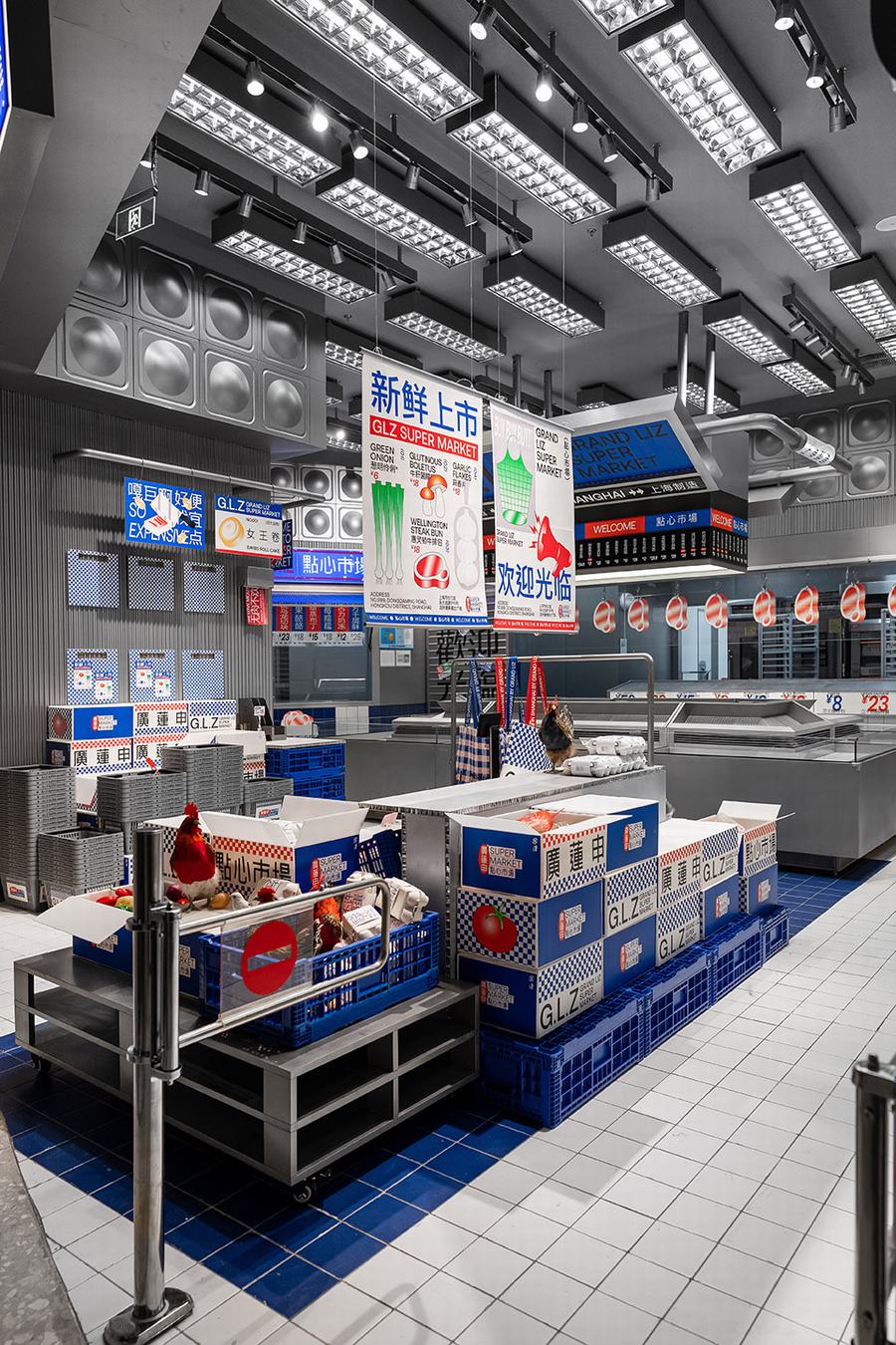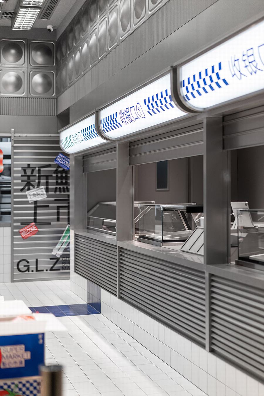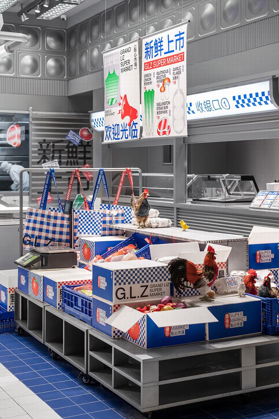 点心市集是廣莲申第一家真正意义上的主题店。我们将把销售和生产融入到市场氛围中。此外,材料和颜色空间中提取最具代表性的元素市场,如金属隔板,白色的小瓷砖,配色的蓝色和红色塑料感,“牛皮癣”到处张贴的小广告,堆积如山的货物混乱但充满民间智慧。所有的细节都“恢复”了市场应有的面貌。同时,通过巧妙的设计、重组和升级,呈现出“超市的日常场景”。我们力求呈现一个充满年轻元素、热点话题、分享欲望的时尚新零售空间。市场上的摊主总是会用手边的任何东西为自己创造一个舒适的休息角落。例如,下面的一个是堆叠两个篮子,然后放置一块木头,这是一个小长椅——座位区。