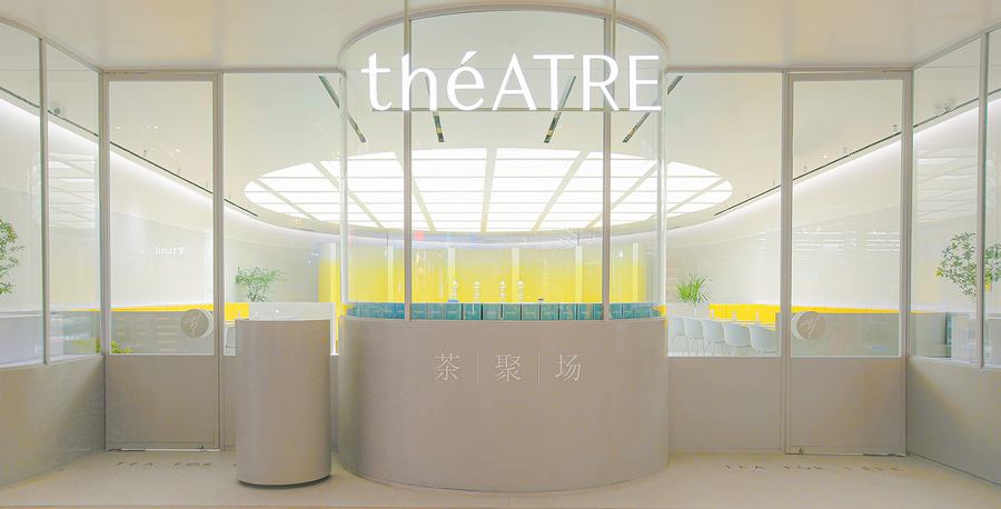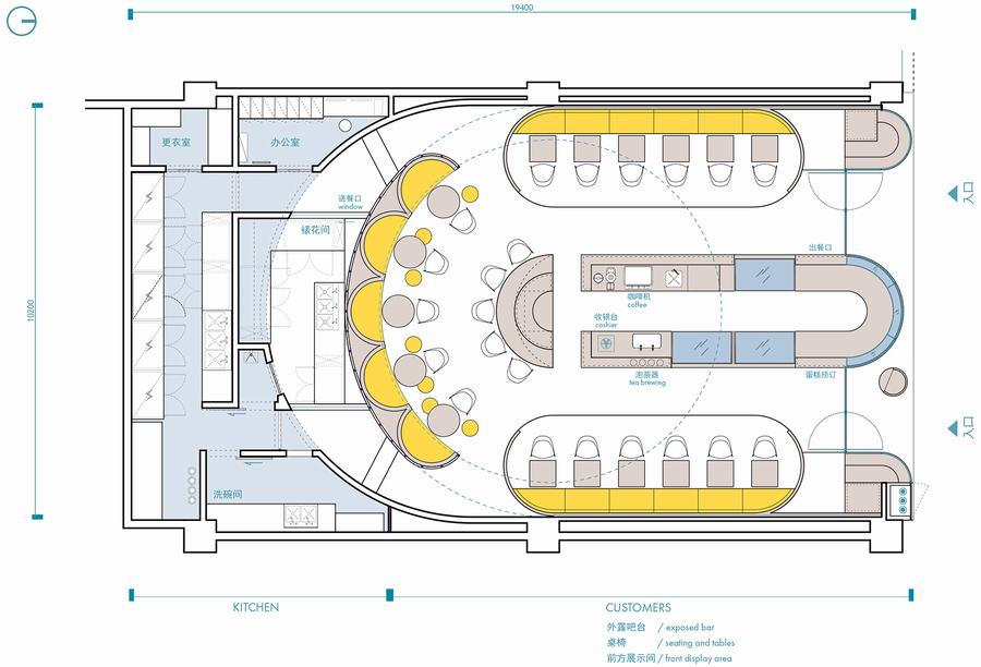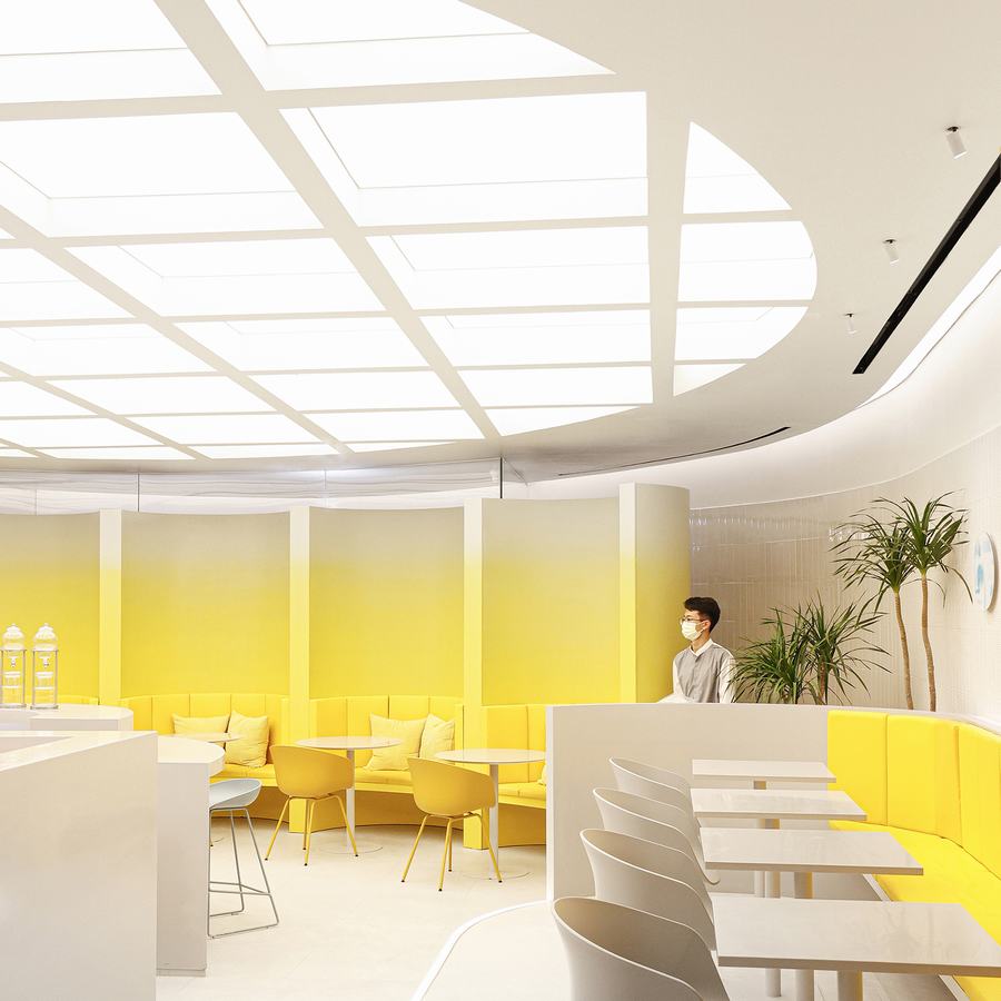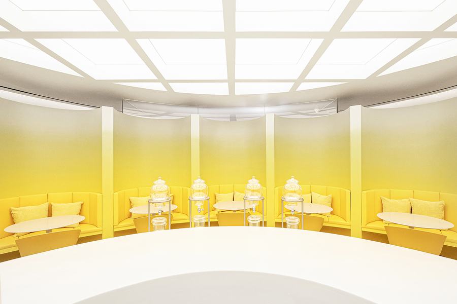 三里屯太古里théATRE茶点项目的布局灵感来源于传统戏曲剧场。每个功能和展示都遵循空间的中心轴线。酒吧位于房间的中间,扮演着主要的表演舞台,吸引着周围所有顾客的注意力。整个场景的背景是黄色的曲线墙,它被设想成一个窗帘,后面是“技术”室:主厨房和蛋糕实验室。弯曲的墙壁的左右两侧有两个入口,服务员可以从这里进出,就像演员穿过剧场舞台一样。透视效果被轻微倾斜的天花板所强调,天花板中心被一个圆形的背光天窗所主导,给人一种置身于天空穹窿之下的感觉。