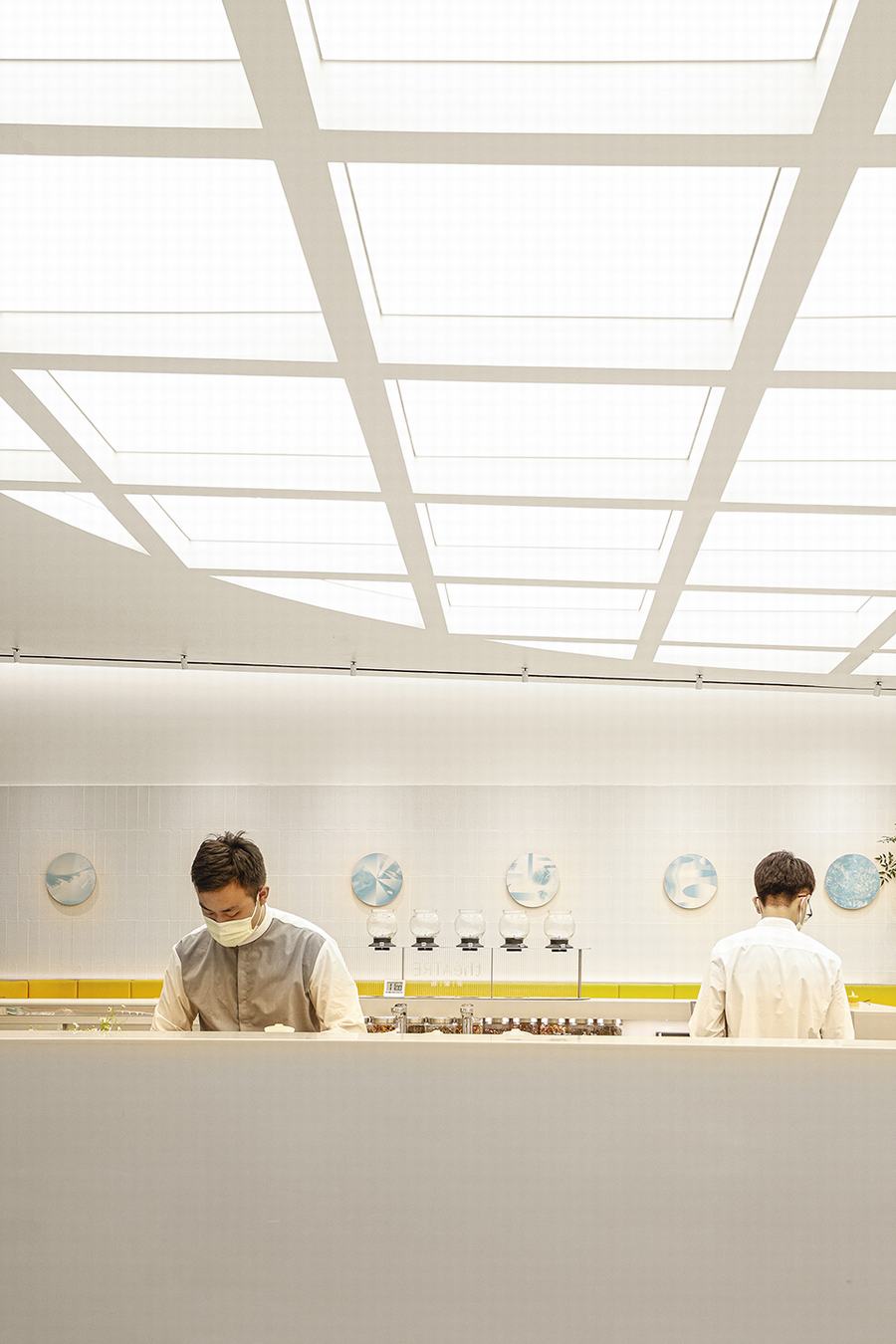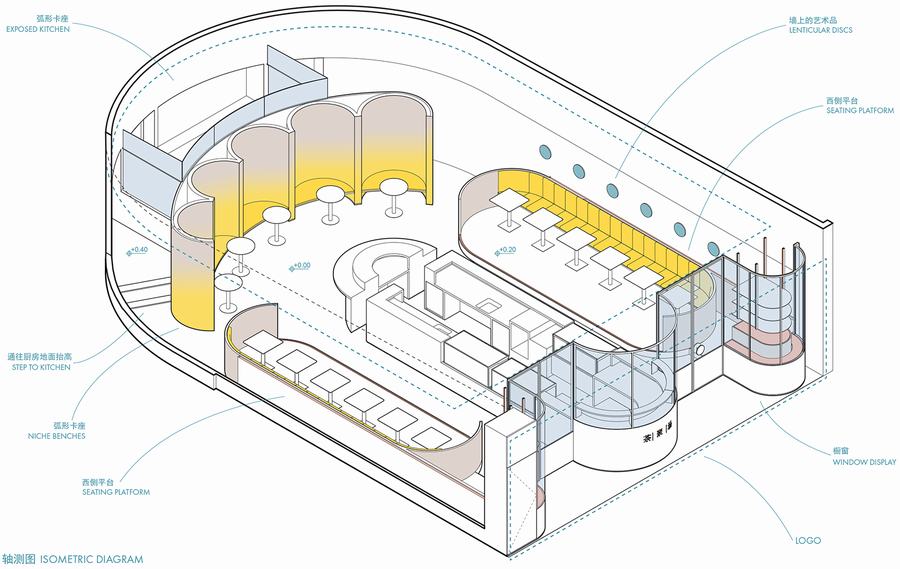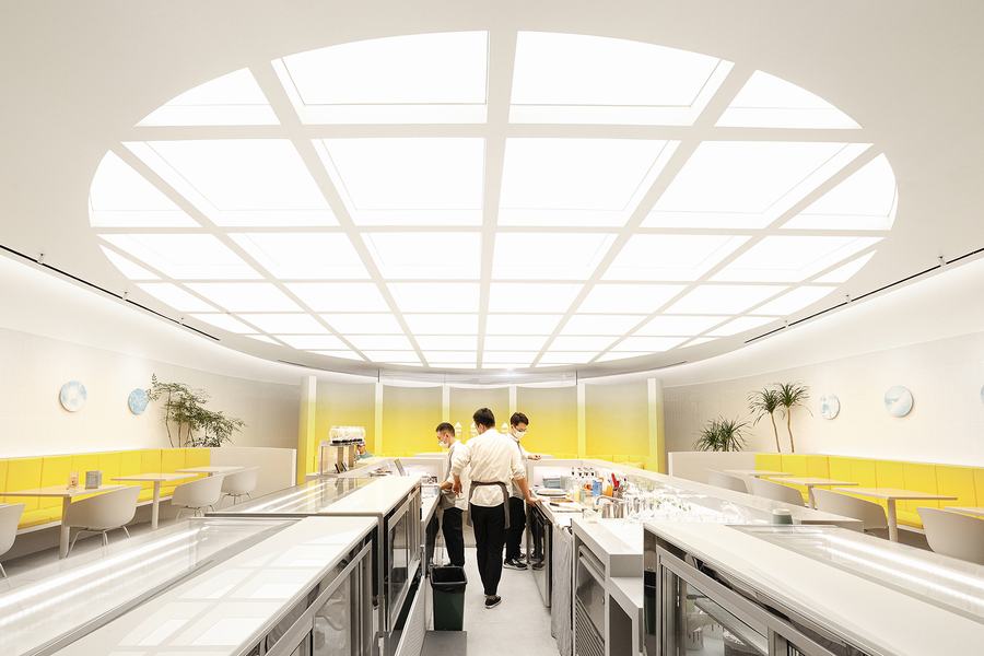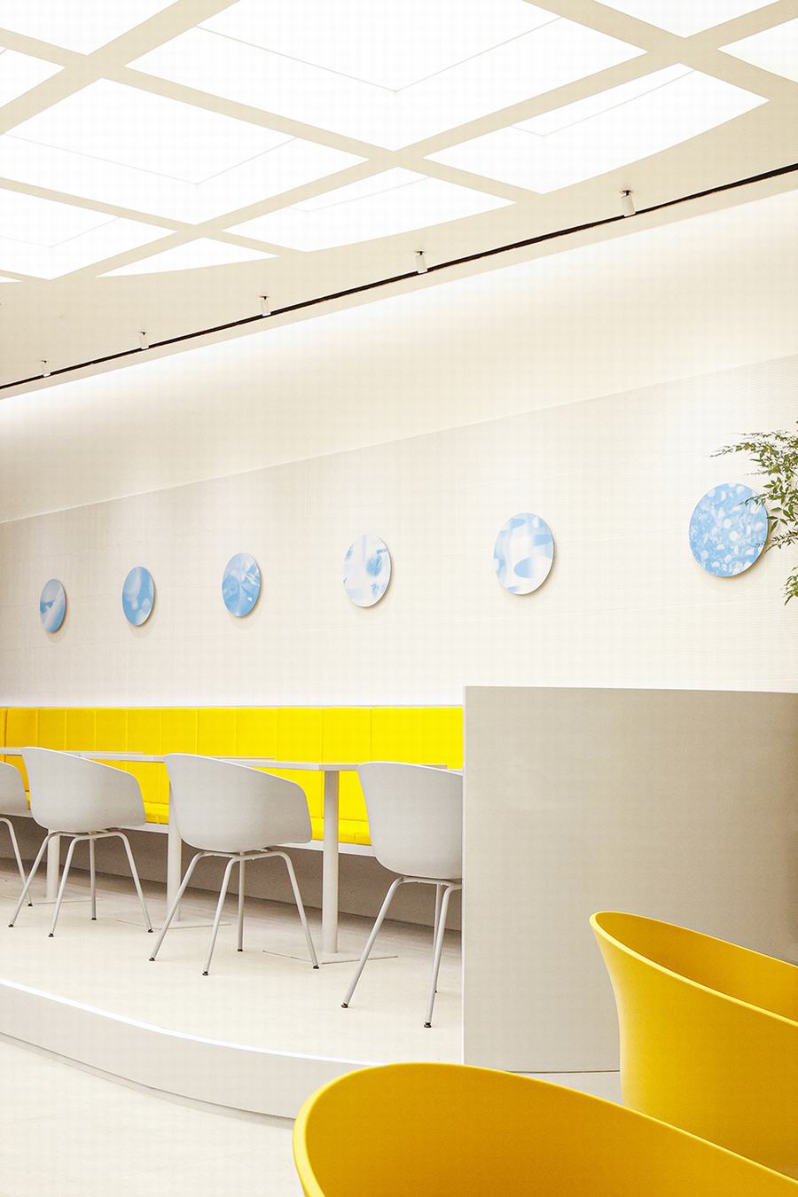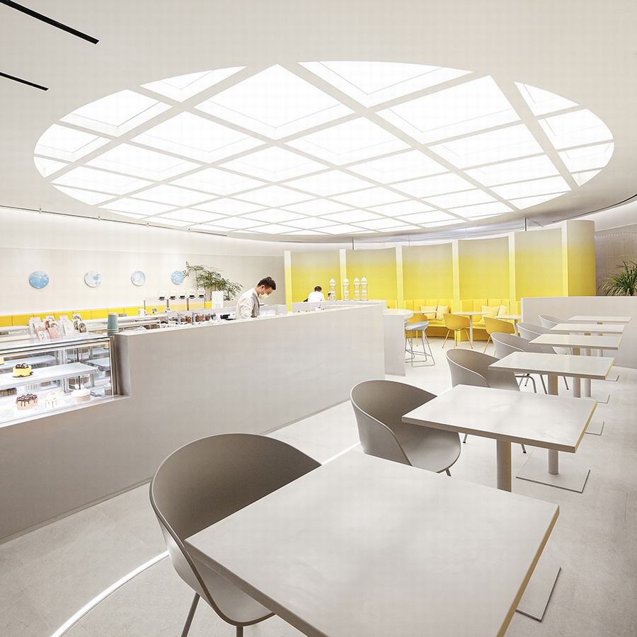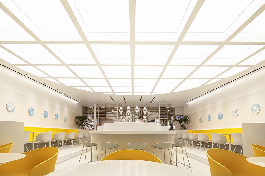 沿着侧壁,在凸起的平台上的两个座位区唤起了剧院座位的想法。所有定制的嵌入式长椅都使用了黄色皮革,而HAY的宽松的椅子和凳子则与灰黄色和白色的整体配色方案相匹配。在主墙上,覆盖着白色光滑的意大利品牌IMOLA的三维气泡凹凸瓷砖,悬挂着由INSTANT HUTONG设计的一系列或12件透镜状的艺术品,灵感来自théATRE图案,类似于俯瞰天空的圆形蓝色舷窗。一个由灰色人造石制成的长柜台包含了吧台的所有主要功能和暴露的显示屏,并有多种新鲜糕点供顾客选择。在吧台的尽头,在天窗的正下方有一张圆桌,用来举办鸡尾酒会和茶道。