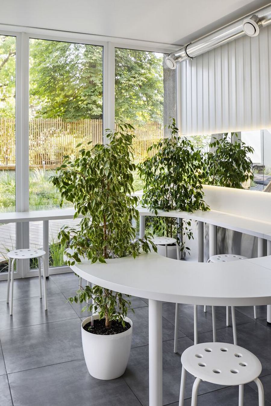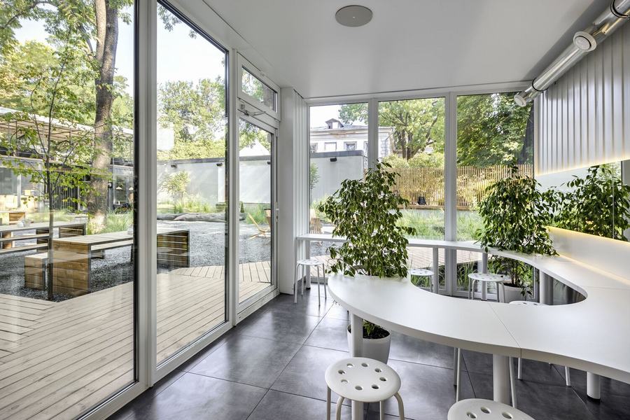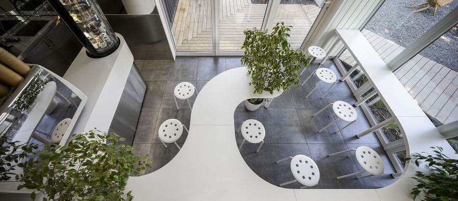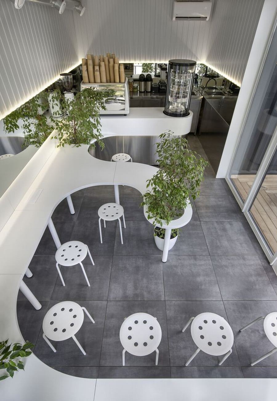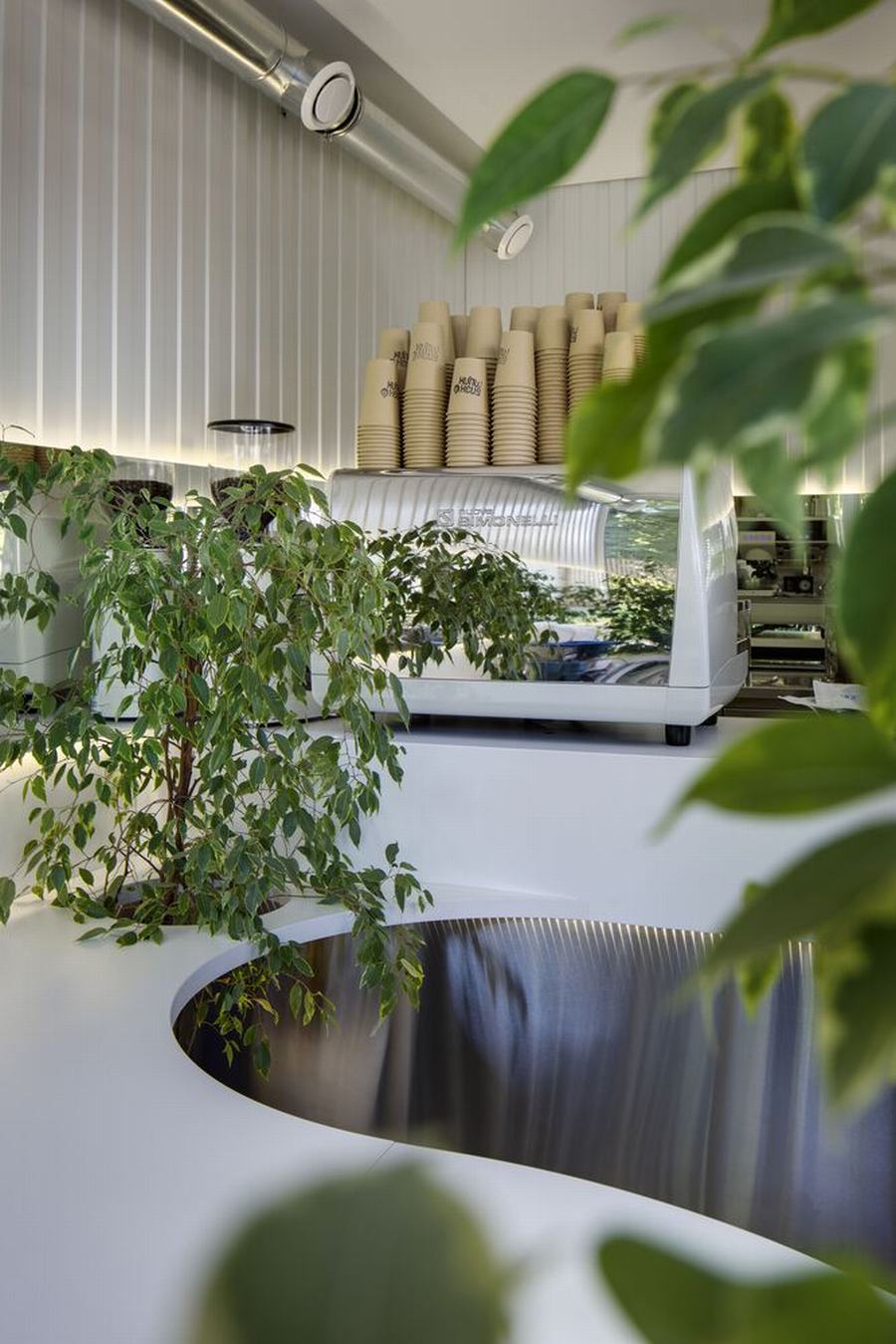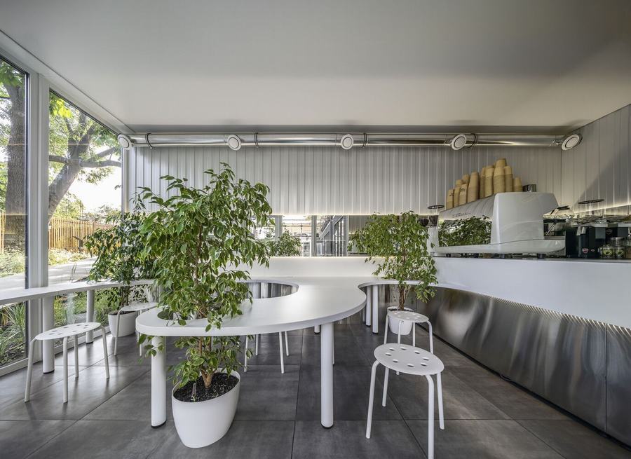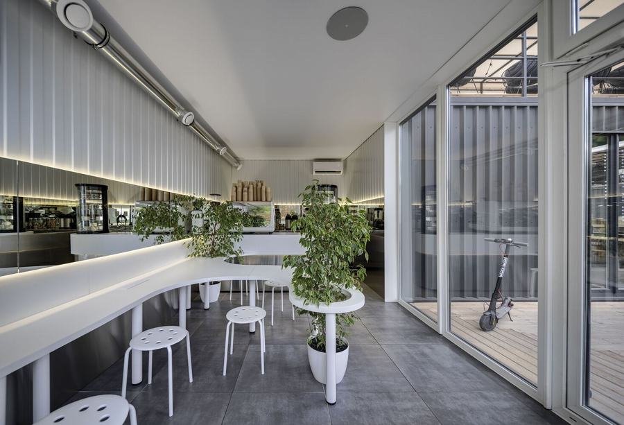 在这里,严格的几何形状(黑色)与粗心、光滑和白色(牛奶)结合在一起,咖啡师和不锈钢强化专业的主题,并围绕这一切形成社区。在酒吧里,你可以坐在哪里,在哪里,你可能不小心开始对话,因为你坐在同一张桌子上,渗透到整个空间。