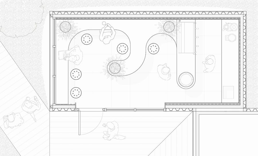 它的布局是这样的,排队买咖啡的人可以聚集在容器里,情侣可以坐在一起,还有可以俯瞰窗户的地方,以及一张桌子,让大家可以围成一圈。我们在镜子上做了一个凸出的带,上面有一个LED灯带,可以上下照射,成为咖啡厅的主灯。镜子已经特别降低了平均头部水平,以允许人们做无脸照片。选好桌子的高度,让落地轻松,人在桌子上被遮住。桌子的高度便于喝咖啡和在笔记本电脑上工作。