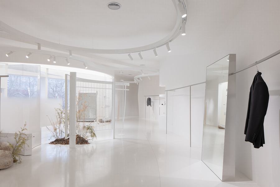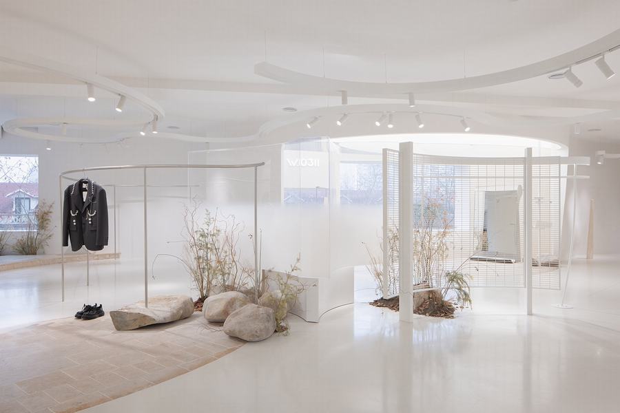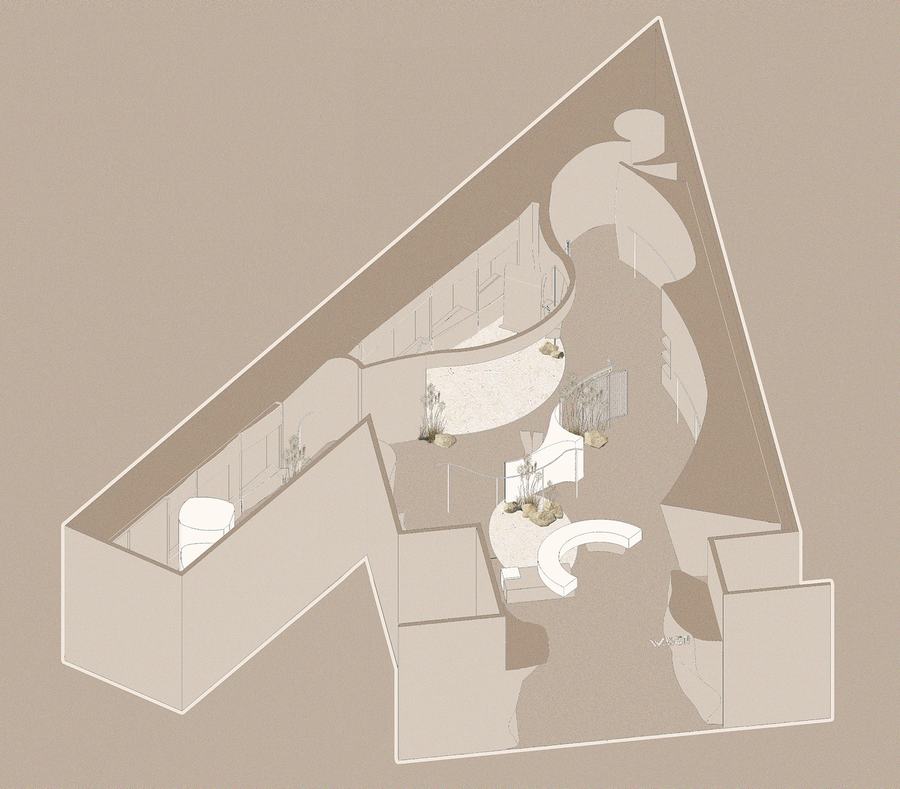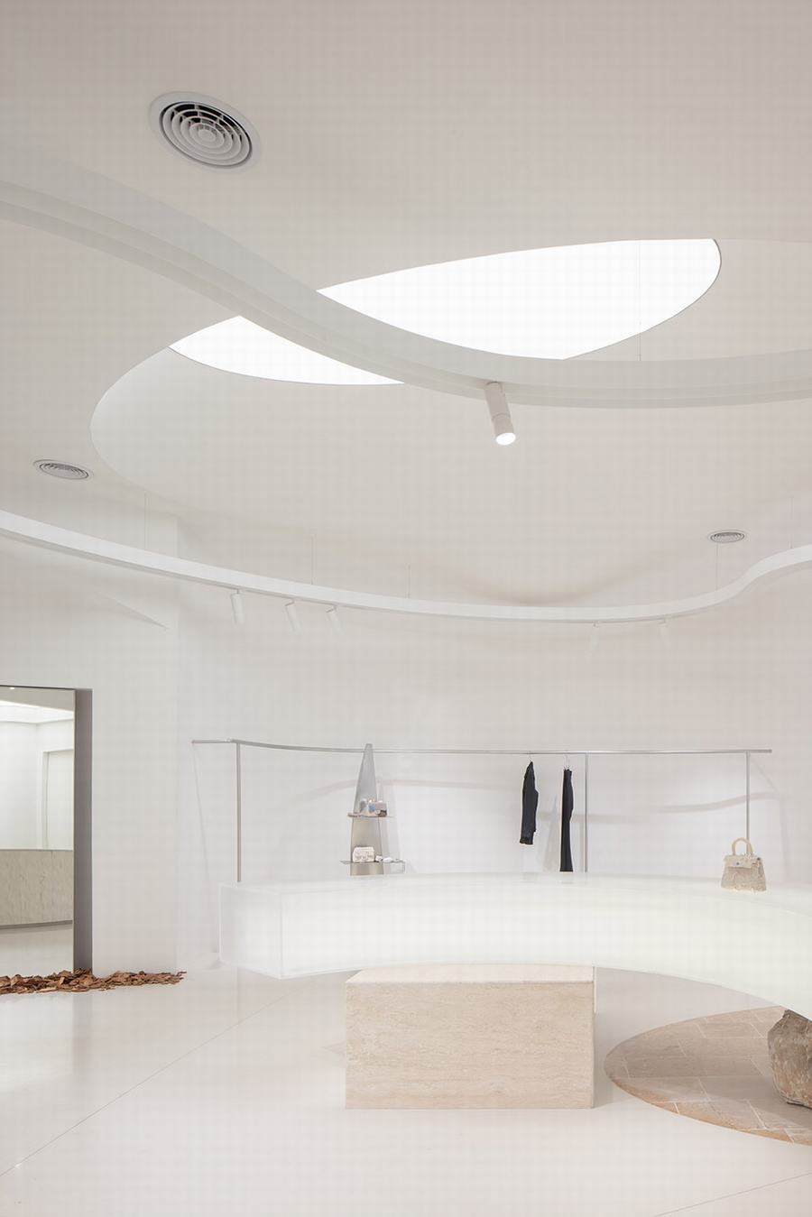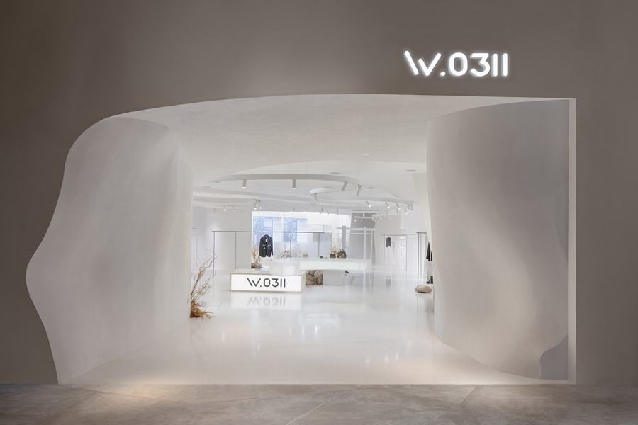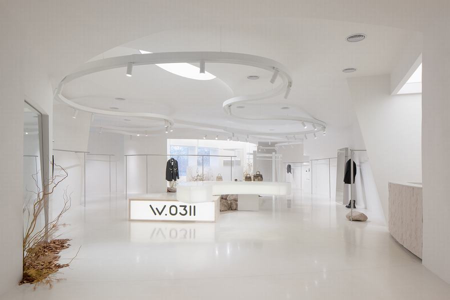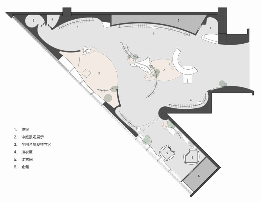 项目原建筑场地为三角形区域,面积约300m²,边缘锐角明显。结合品牌定位,我们设计干预措施以及建立区域内的站点的固有形式,希望能消除平立面的边界和溶解锋利的感觉带到我们的原始帧通过不规则的波状形式在墙上。