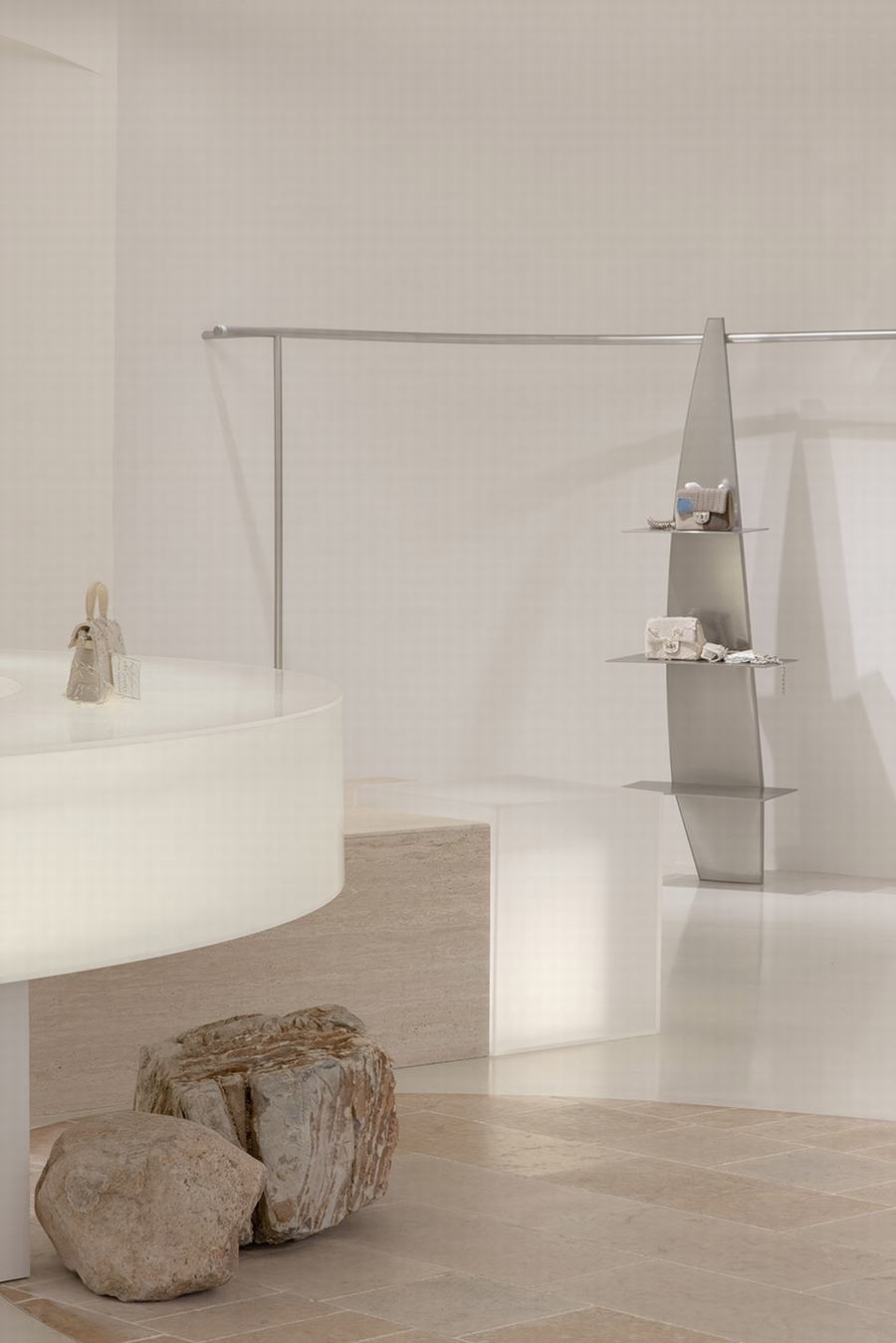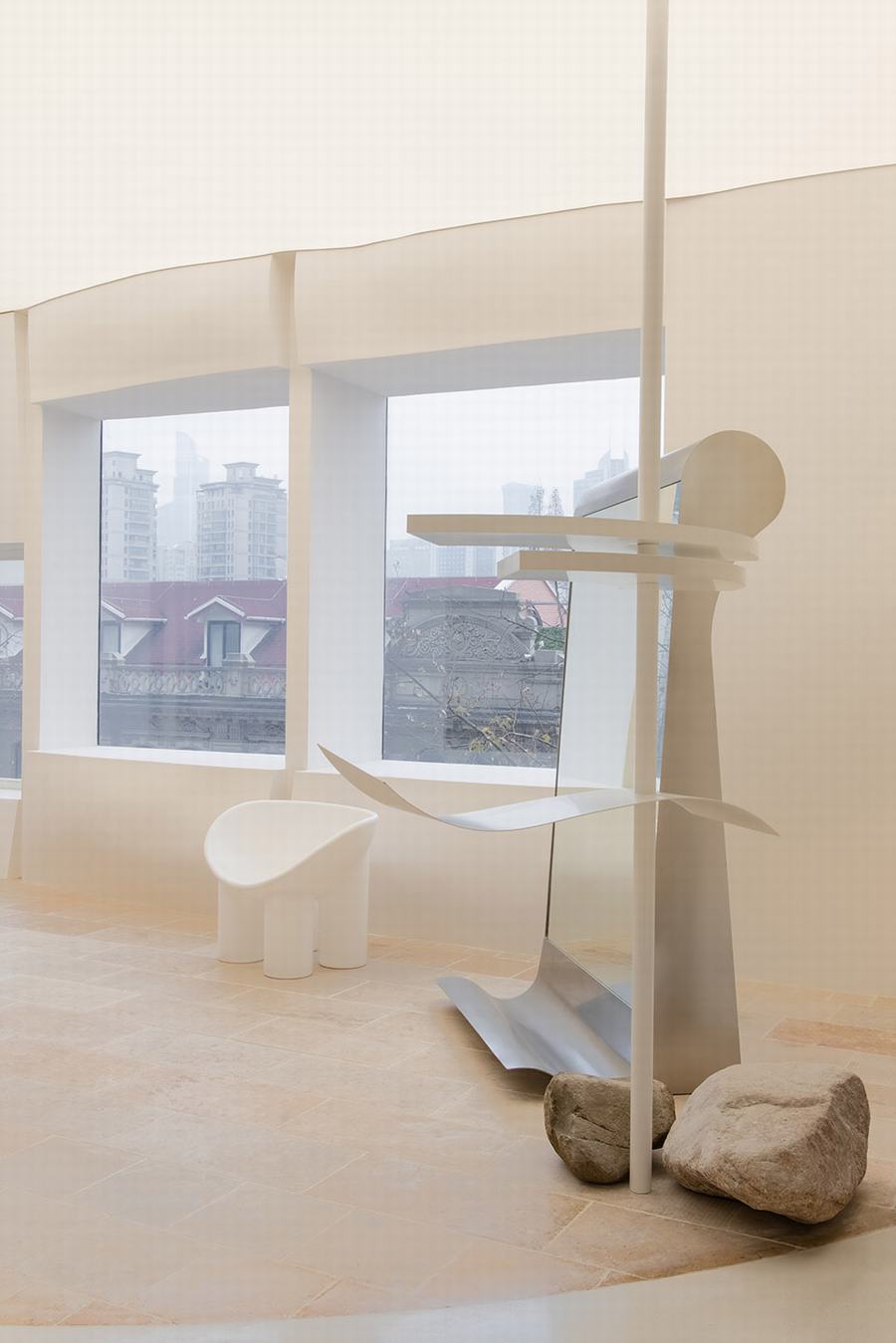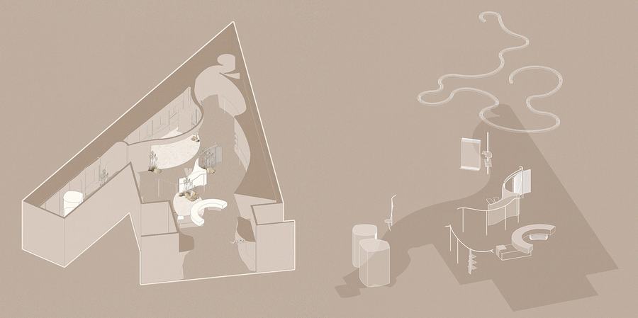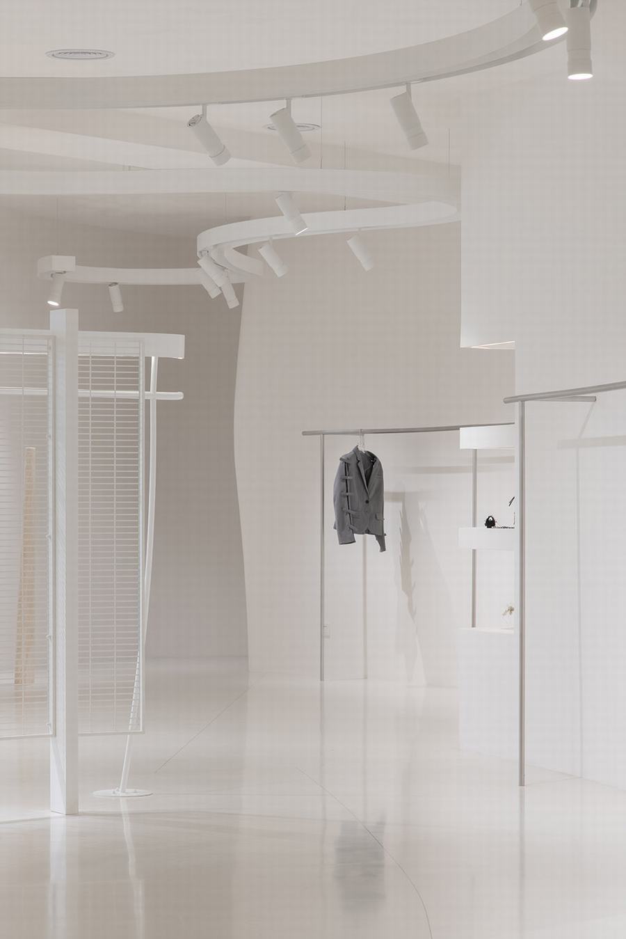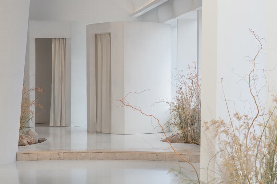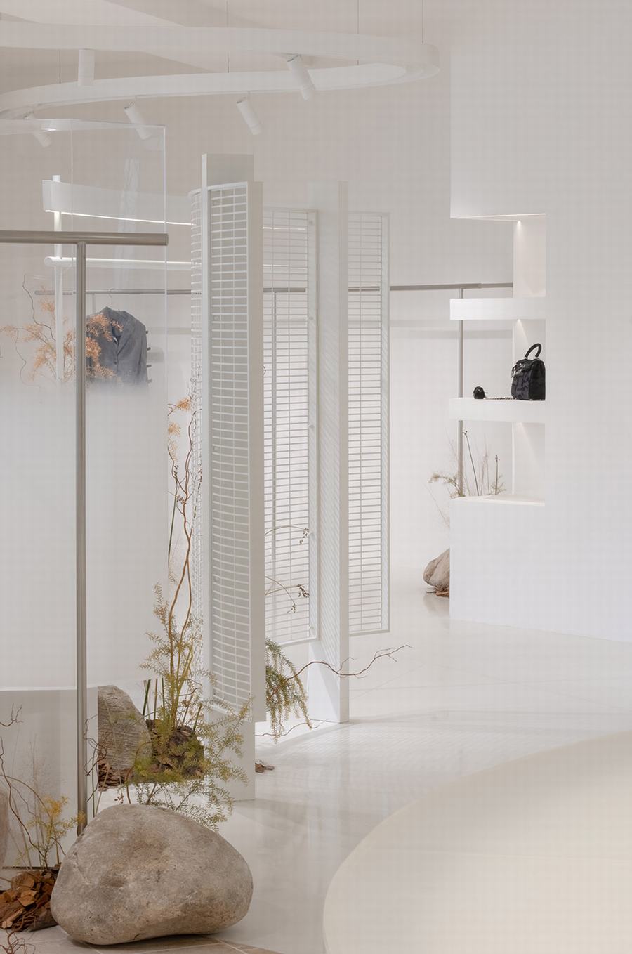 项目原建筑场地为三角形区域,面积约300m²,边缘锐角明显。结合品牌定位,我们设计干预措施以及建立区域内的站点的固有形式,希望能消除平立面的边界和溶解锋利的感觉带到我们的原始帧通过不规则的波状形式在墙上。