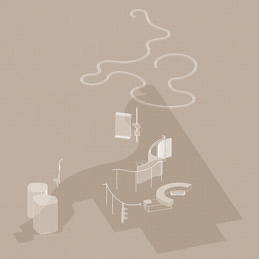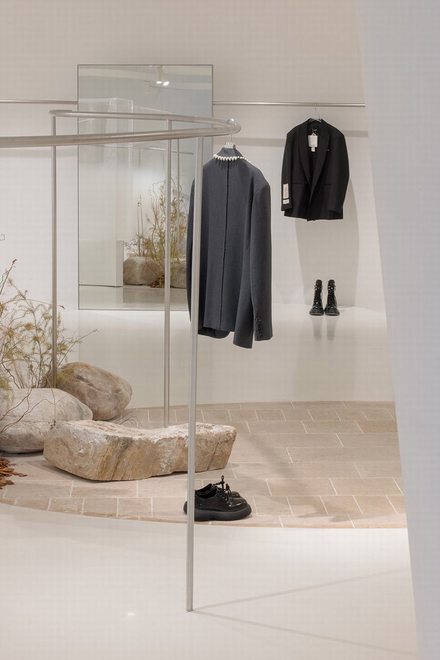 在区域之间,我们用不同的地面材料划分边界,正面和背面可以无缝连接。屋顶上的造型组件将场景串联起来,利用弯曲组件的行进路线对灯光进行配置,从而解决显示的灯光需求。