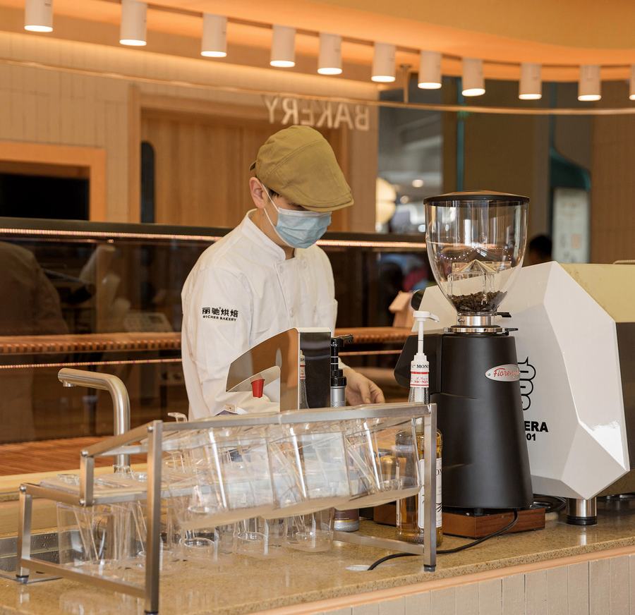 位于青岛马赛克广场的RICHER BAKERY,包括现场制作的烘焙区和结合餐饮空间的零售区。动态步行线以中心岛为中心,向四周延伸。