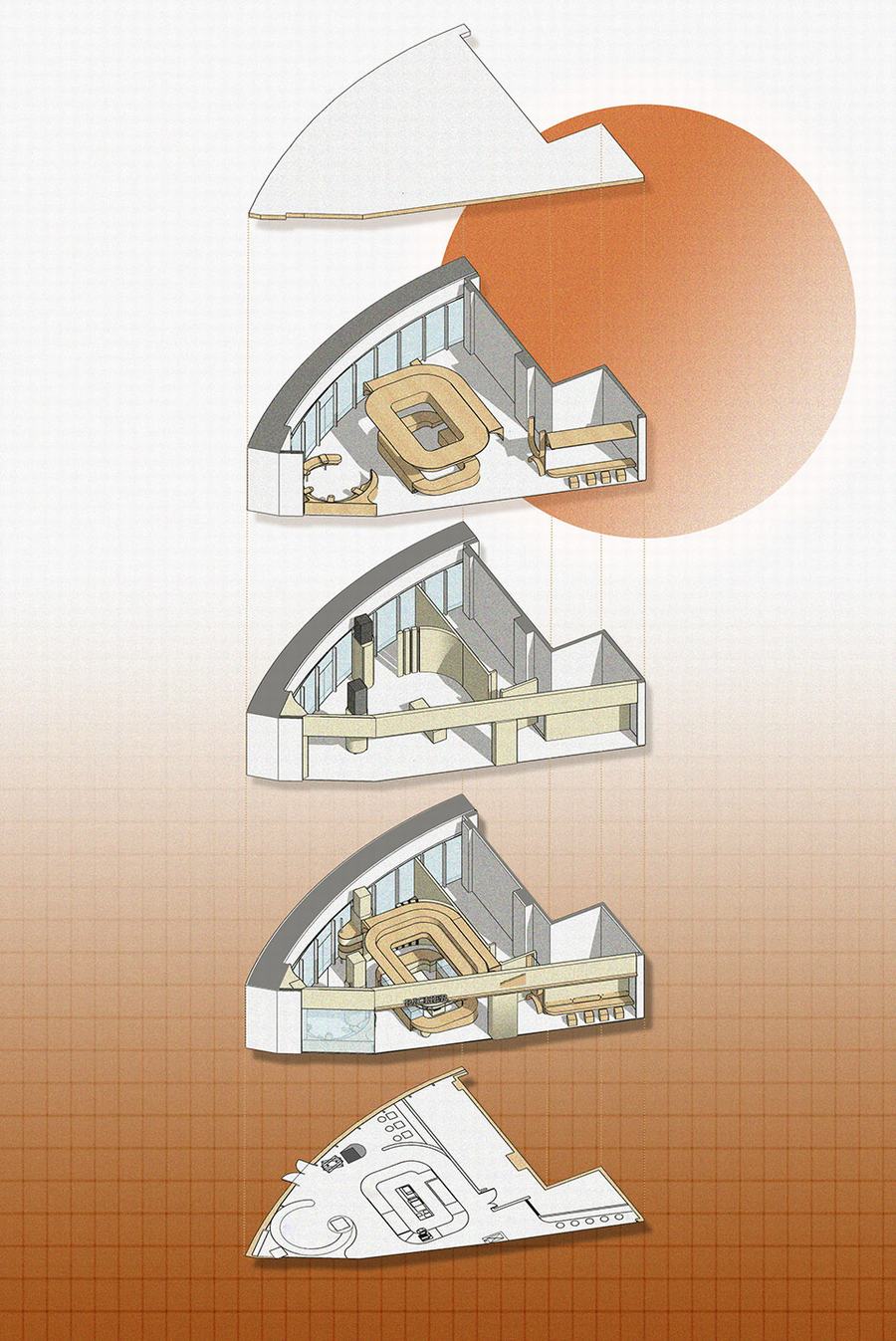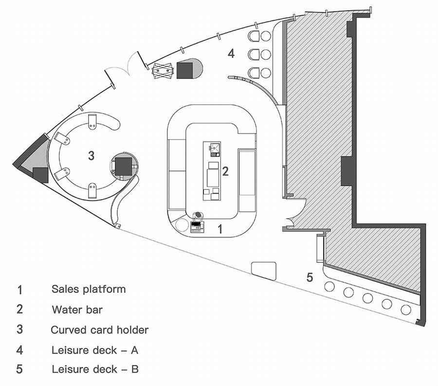 空间中柱子周围有一圈弧形的展位,不同于传统的坐姿。客户肩并肩的坐着,定制的展台和餐桌成为人与人之间的“纽带”,彼此之间形成了亲密的关系。