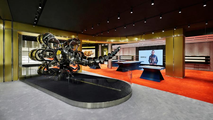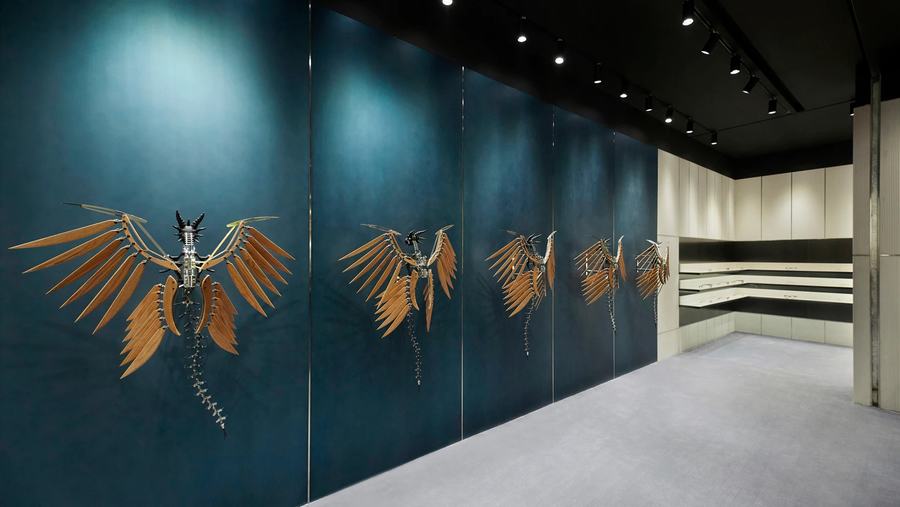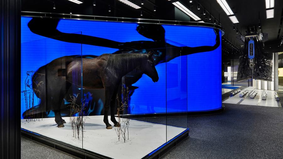 在店铺入口处的两座巨大环型屏幕和机械艺术装置,这些装置巧妙地为空间创造了神秘的氛围,给来访者提供了一种全新的情绪体验。 在楼层之间形态各异的机械装置通过其大幅度的反复推动,以一种抽象的方式展现了动物在自然界中,远超出人类的独特感知力。