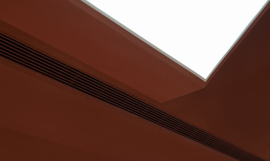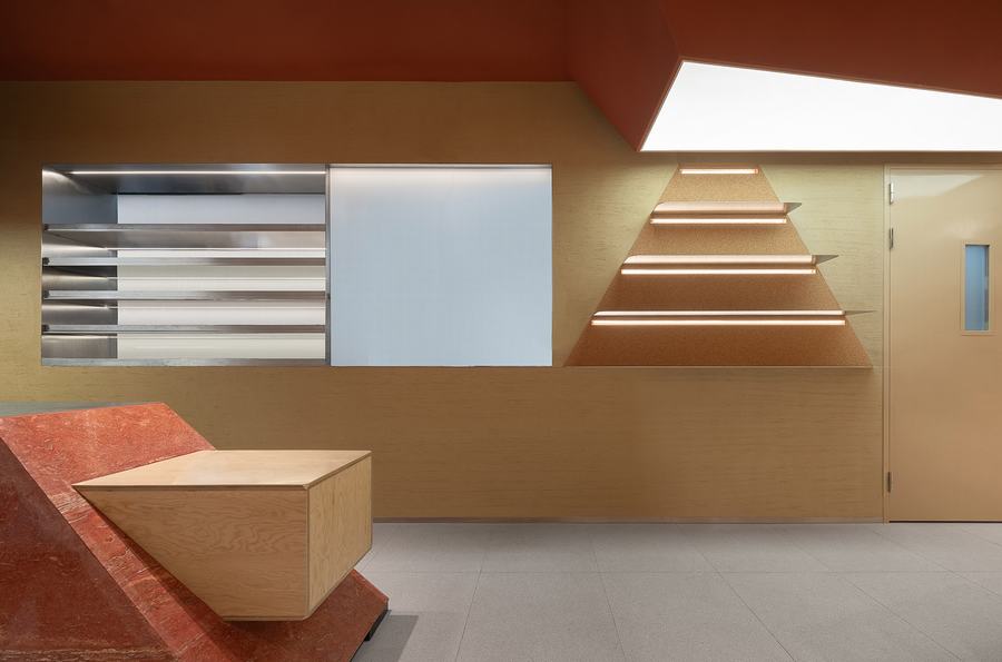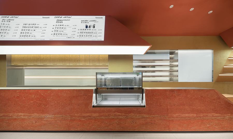 巨大的体量天花板和线条让整个空间更加干练简洁,收银吧台、桌椅、蛋糕柜都是受到山丘的启发。棒状建筑由抽象的山脉形状演变而来,我们切割并得到了两个块体。下面是红色石灰华的收银台,上面是海报展示。