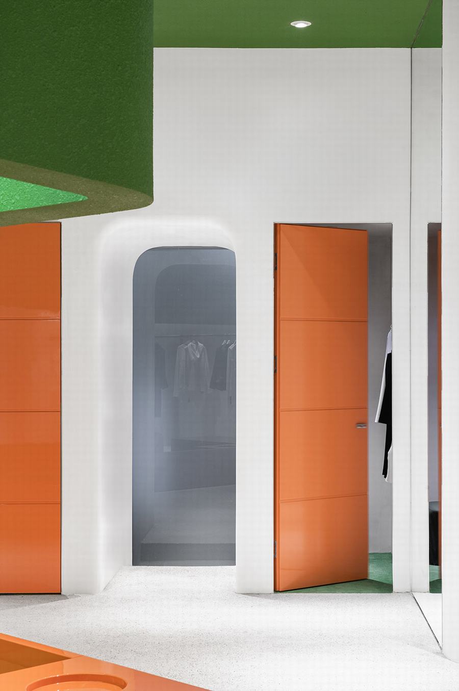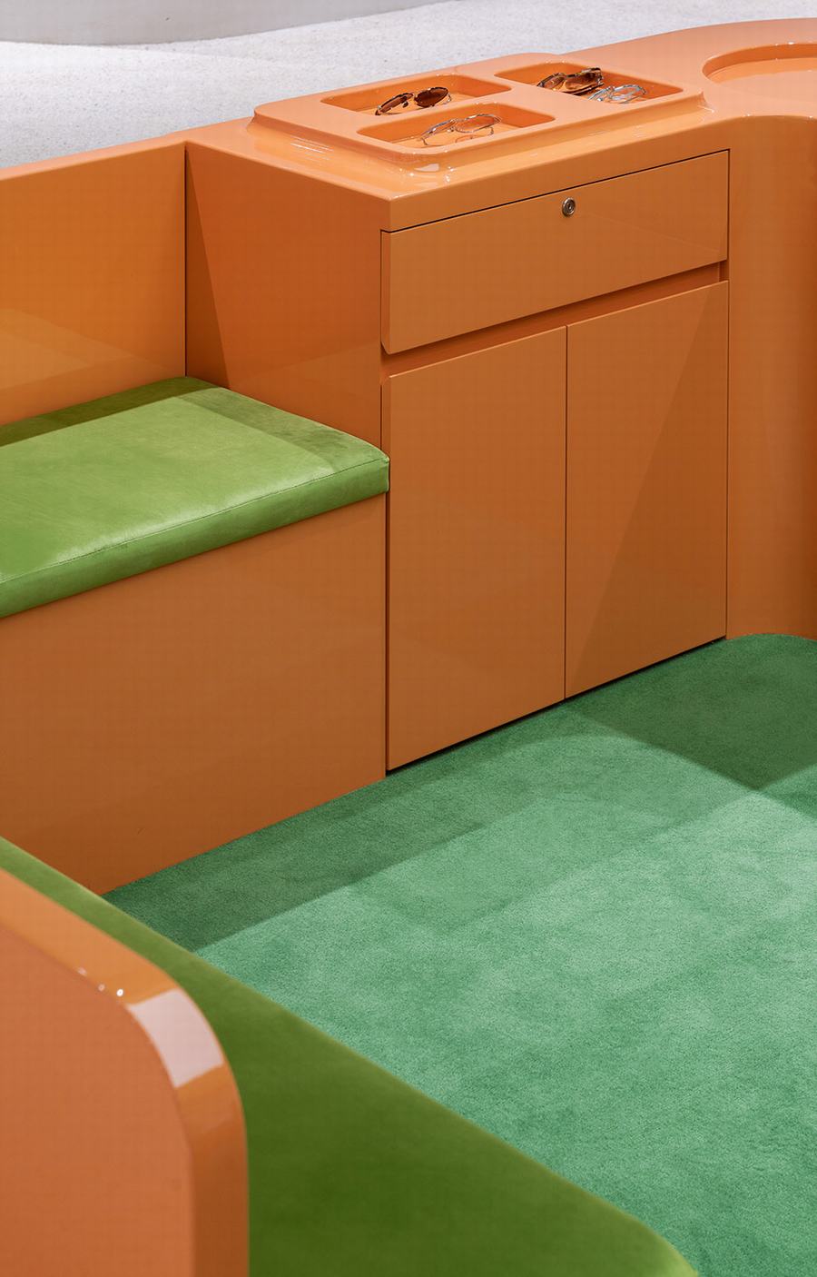 休息区的下沉空间,我们特别选择的大量饱和橙色与巨大的绿色天花板,希望这一领域将成为整个空间的视觉中心,同时我们也希望人们在下沉广场会有一些大的树下呆在户外的感觉。