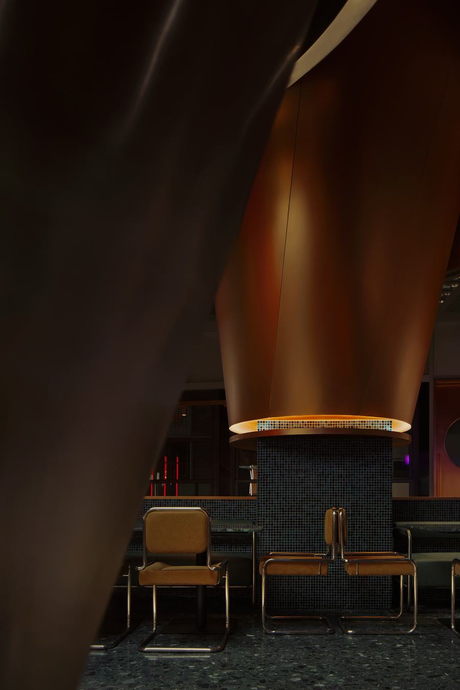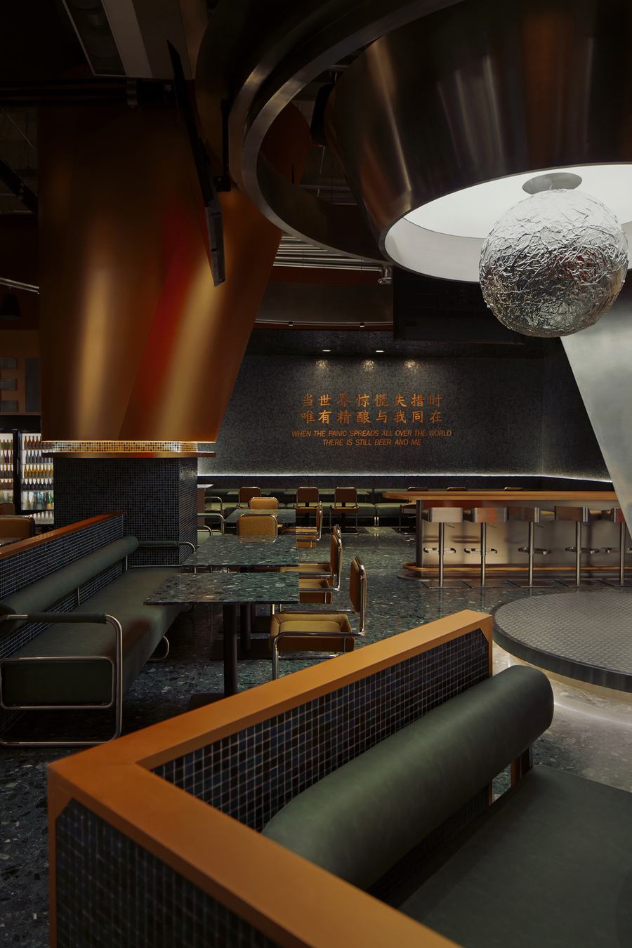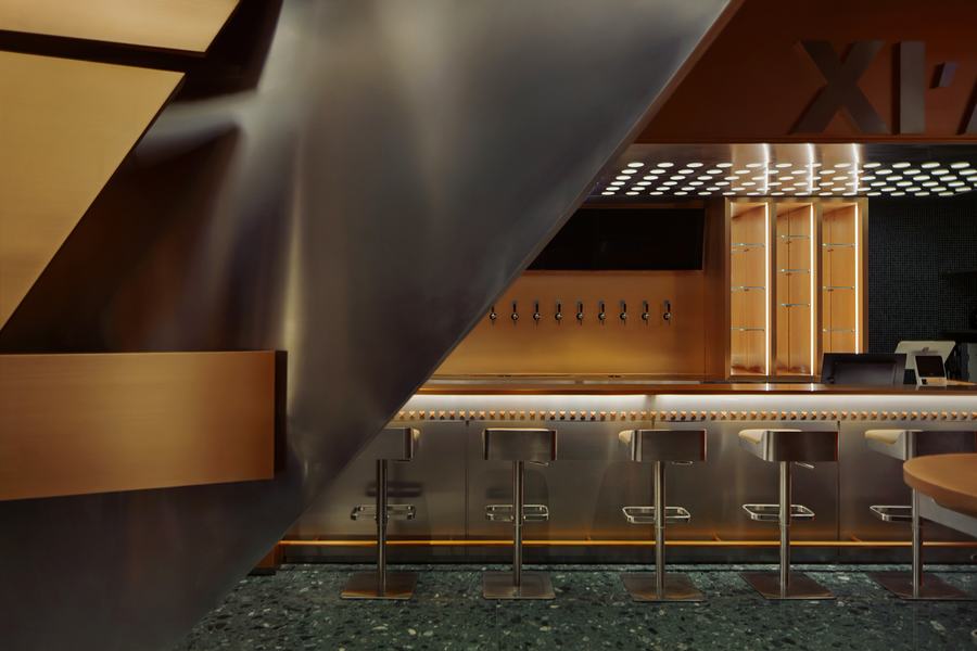 创意:比利时的修道院是世界一流精酿啤酒的故乡,也是项目设计的灵感来源。僧侣们向世俗世界出售啤酒,所得利润用于僧侣的日常开支和慈善事业。该项目提取了精酿啤酒的酿造精神,并将其转化为“棒”的概念,揭示了精酿啤酒的典型特征和文化。铜元素勾勒出啤酒特有的大气状态。在灯光的辅助下,垂直的红色“棒”成为视觉亮点,产生独特的氛围。