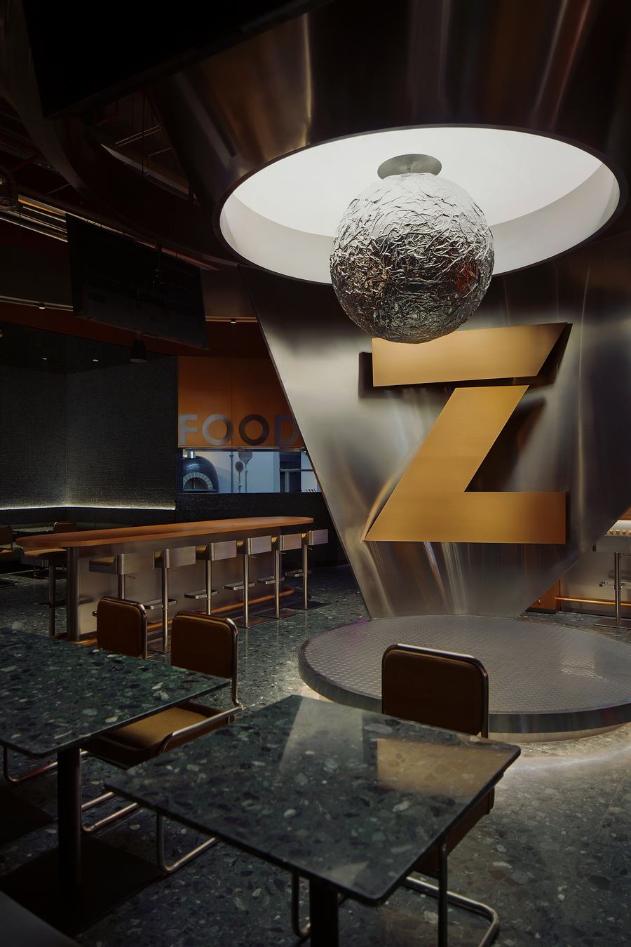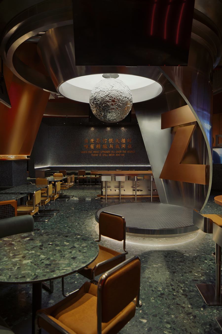 创新:中国“造”一词,拼写“zao”,指的是“手工工艺”,是客户的核心价值观。品牌专注于打造完全手工制作的产品,而不是加工市场上销售的半成品。受Dior秋展启发,将20世纪60年代流行的绿色水磨石、马赛克瓷砖、厚棕色皮革等复古风格材料带入空间,形成一种充满过去痕迹的经典空间场景。镜面和拉丝不锈钢赋予空间动态的节奏和未来感。银色球体表面的折痕唤起了时间流逝的感觉。在白色的灯光下,这个艺术装置以前卫的色彩和行星状的形状为特色,营造出一种具有未来感的“冥想”氛围。