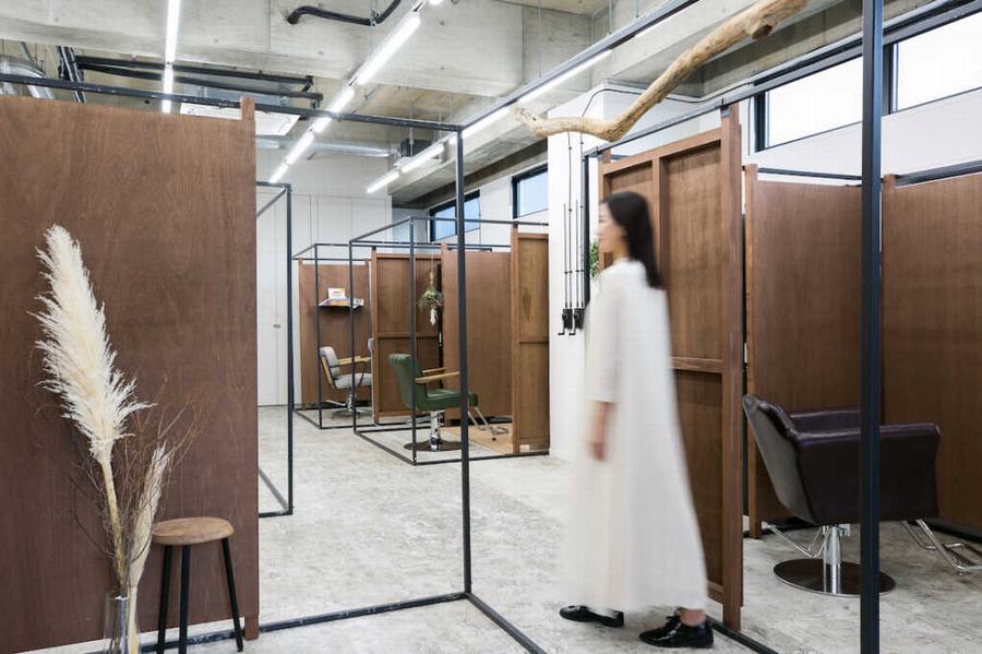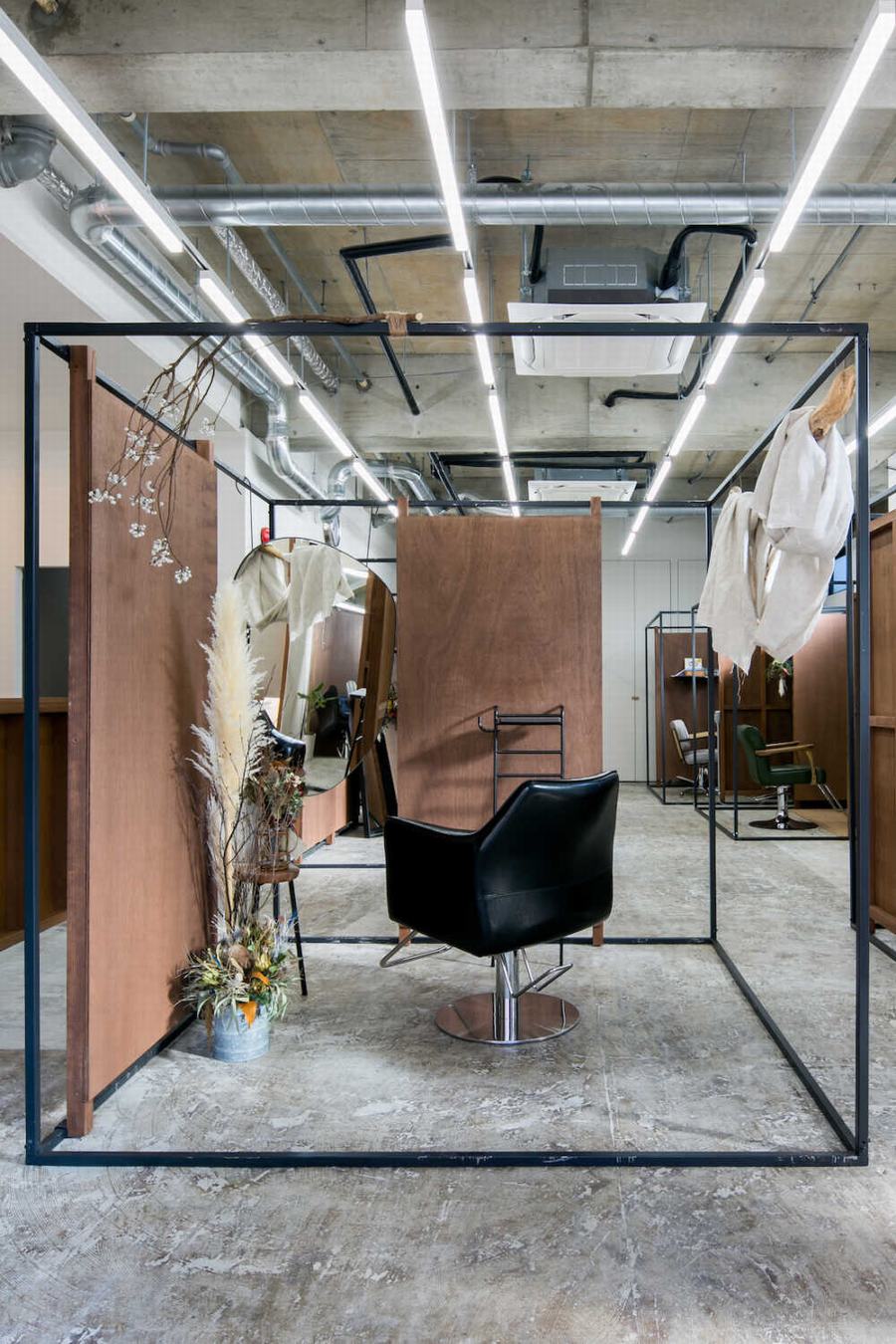 通过使用可移动的面板和镜子,可以以各种方式分隔空间,以便每个美容师都可以根据自己的个性安排空间。它由压制的黑色框架和彩色 lauan 胶合板组成,因此可以用作可以添加到空间中的小物品和杂物的背景。
