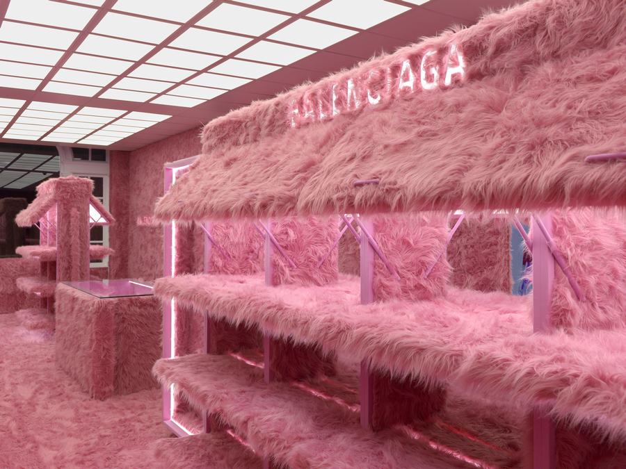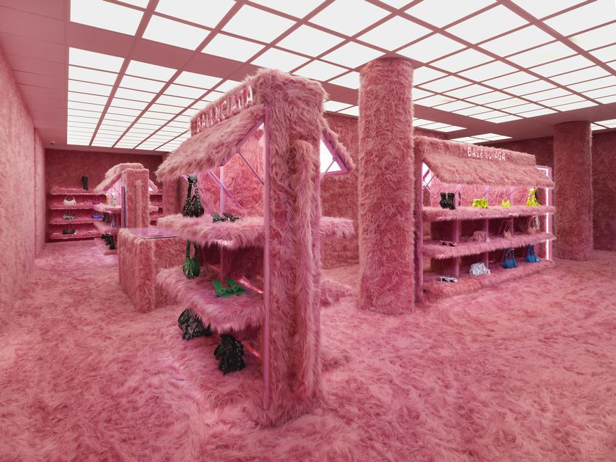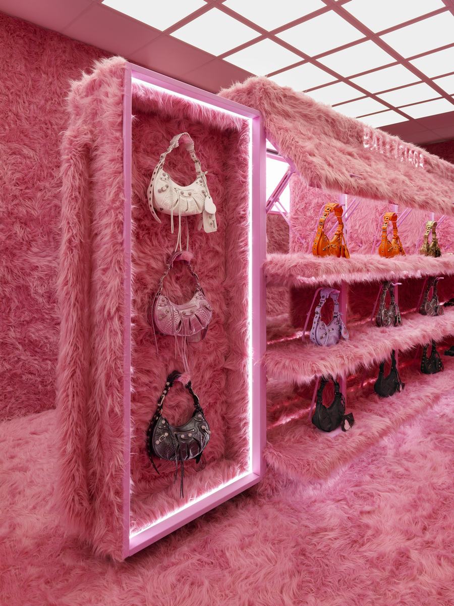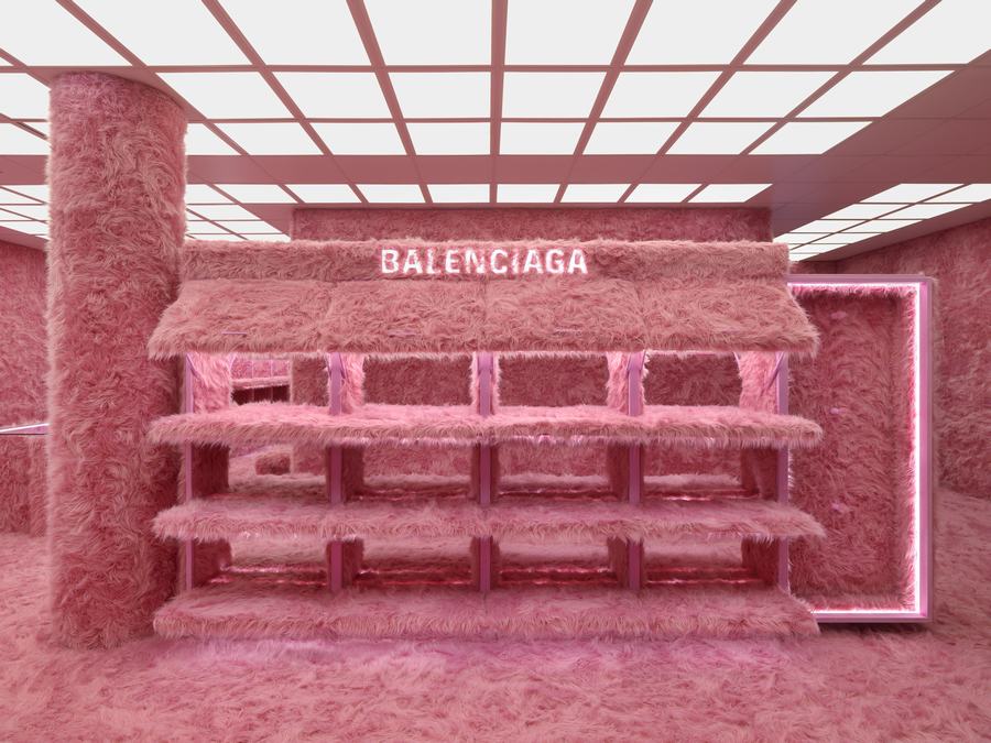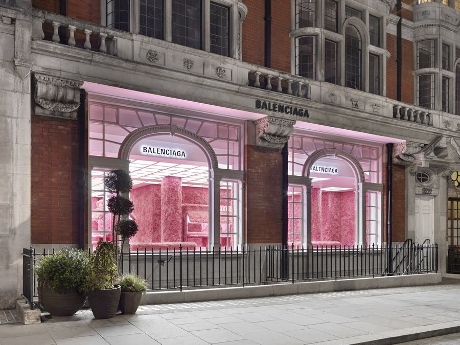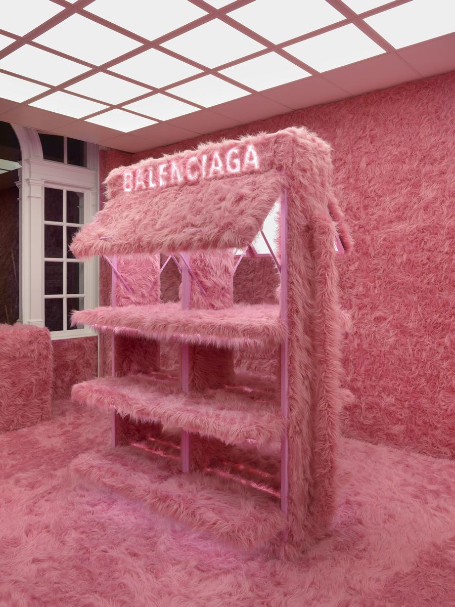 就在巴黎世家(Balenciaga)公布其位于新邦德街(New Bond Street)的豪华门店几周后,它又翻修了另一家伦敦门店。不过,这一次,零售环境的特点不是简约风格,而是亮粉色的人造皮草。地板、货架、陈列品、座位,甚至天花板的悬挂框架都覆盖着具有传奇色彩的材料。这个快闪店是为了庆祝该品牌的Le Cagole系列而设立的。设置了两种类型的零售装置——开放式的售货亭和户外广告。粉色毛皮衬里的盒子,结合了白色LED灯,暴露了启发了配饰系列的标志性手袋。