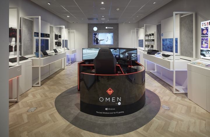 商店的墙壁计划覆盖一层哑光白色,象征着PS5主机的颜色,大约10%的墙壁和家具用蓝色装饰,代表着整合在所有部分的PlayStation,以创造强烈的记忆作为主要颜色。中央家具用不锈钢发丝作为次要颜色,以岛状的展示方式规划,自然地引导客户的移动路径,创造了一个漂浮空间的形象,通过墙壁间接照明的效果。