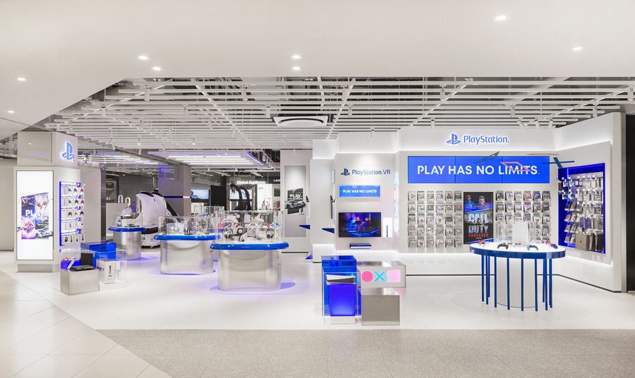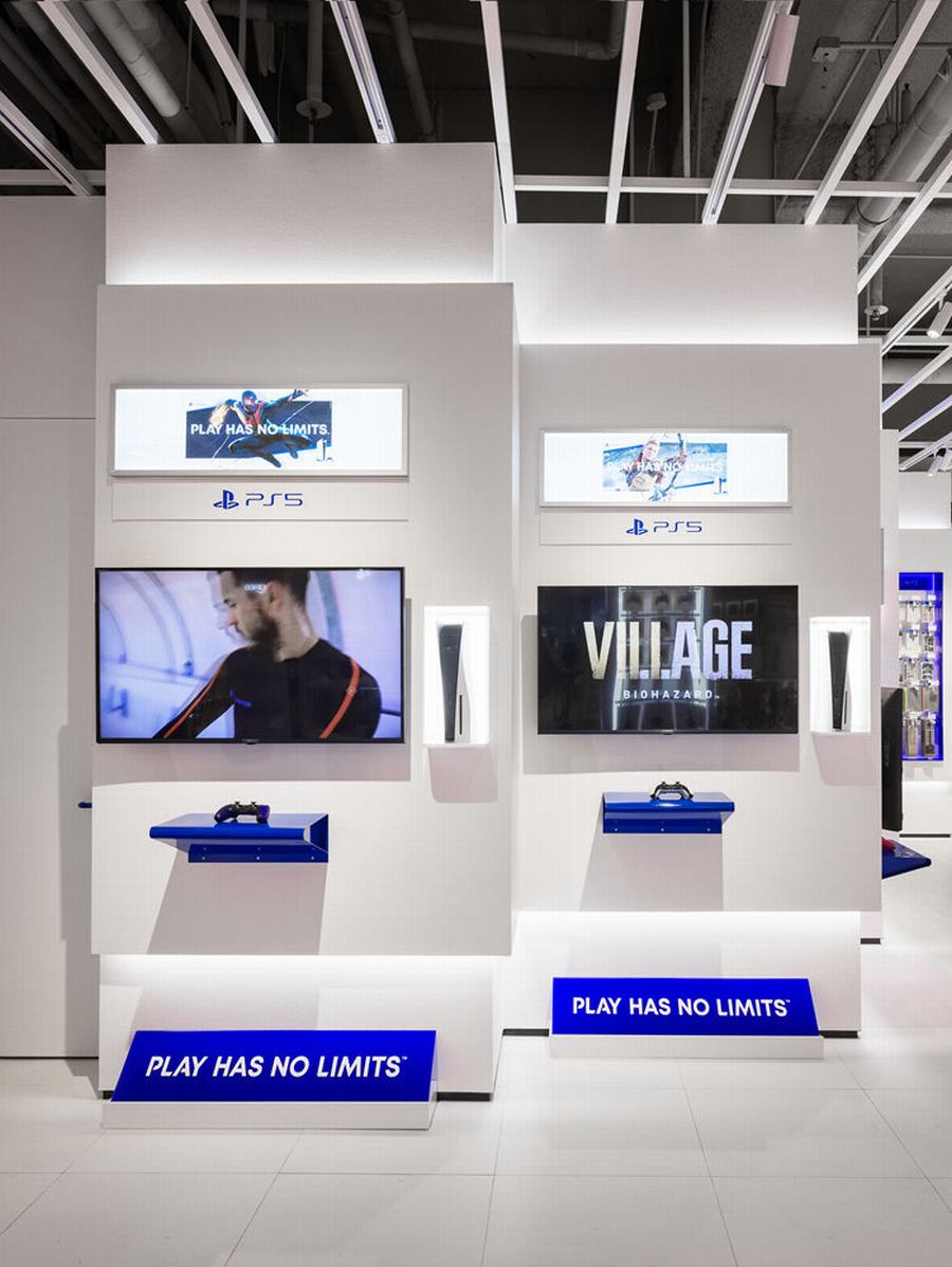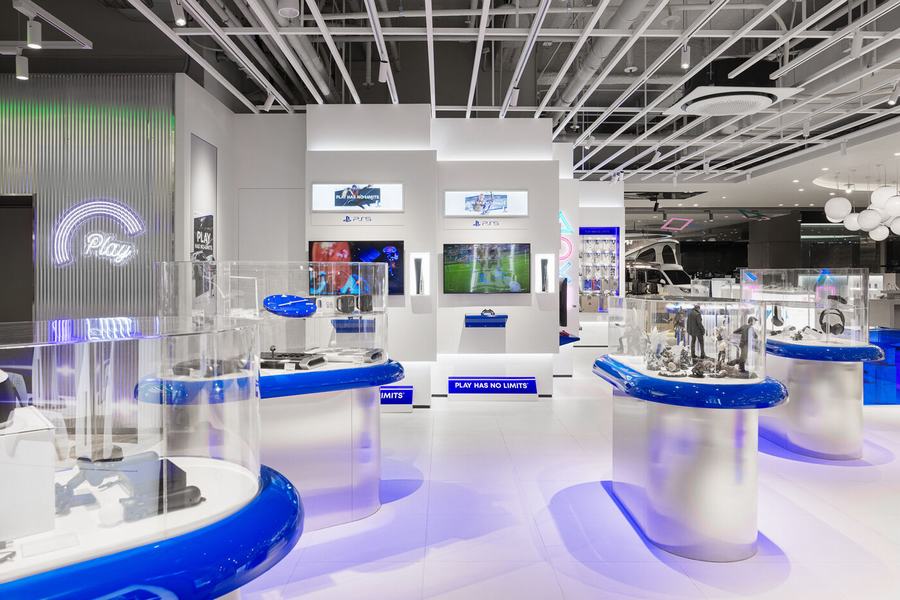 在规划PlayStation商店时,我考虑的最重要的因素是首先要准确传达品牌的新形象,之前版本的PlayStation的蓝色和使用比例在PS5发布时略有调整。我们的目标是通过改变展示方式,结合新的零售商店指南,形成一个亲密的体验站。