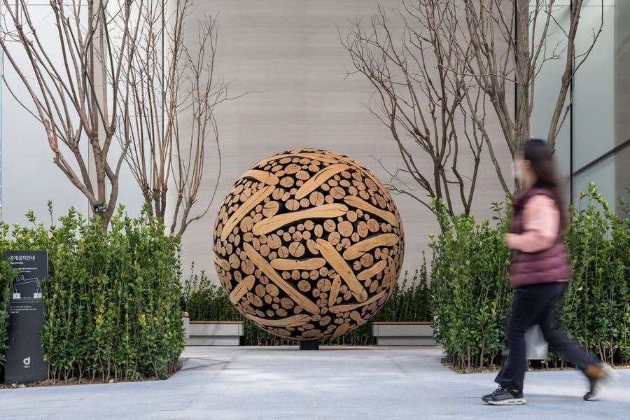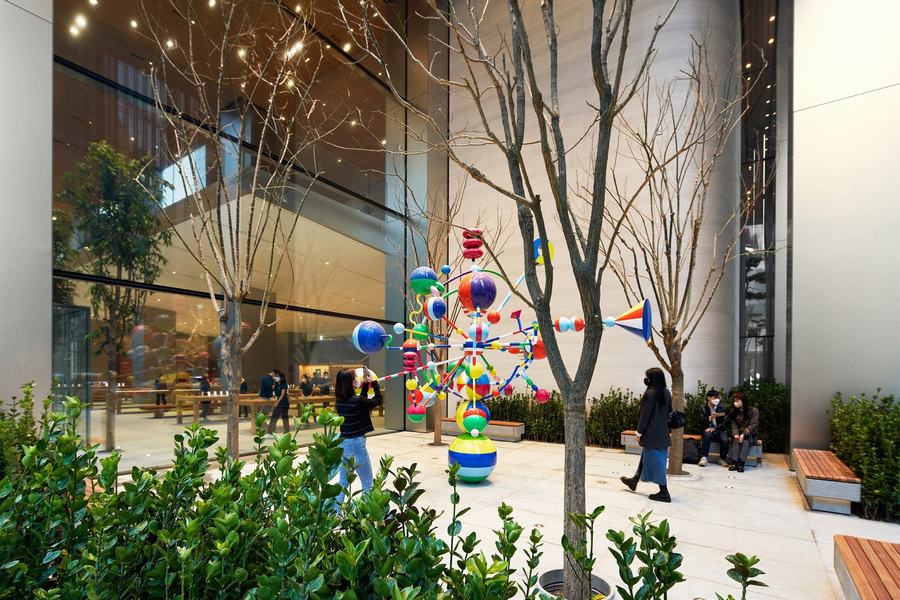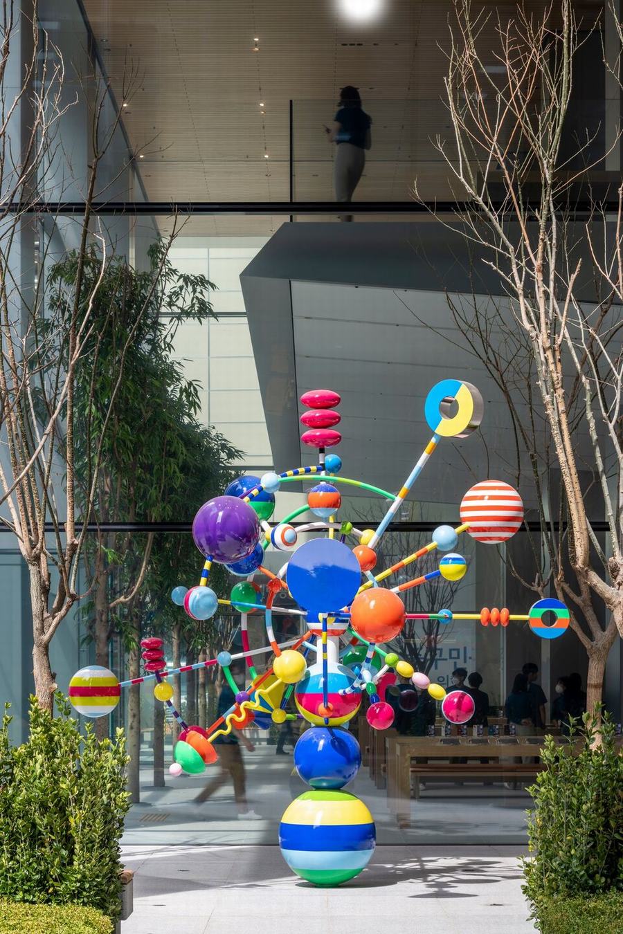 该商店的设计旨在无缝融入周围的城市肌理;地板饰面从内到外穿过玻璃外墙。景观也通过大中庭内的树荫林流入商店。此外,袖珍公园营造出宁静的小型避风港,让您远离繁忙的街道。韩国艺术家 Jaehyo Lee 和 Vakki 的雕塑增添了焦点,营造出宁静的环境。