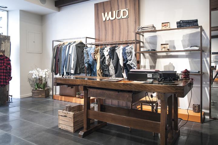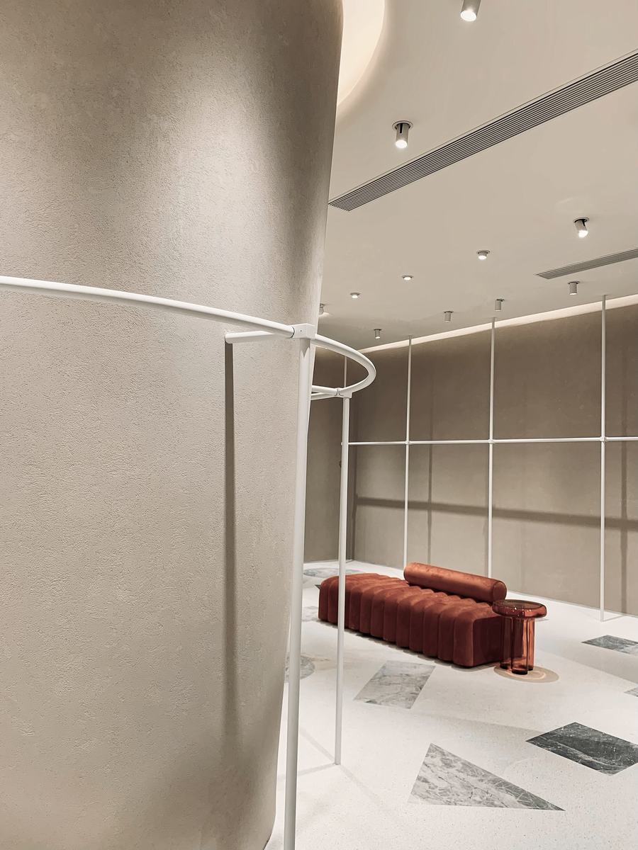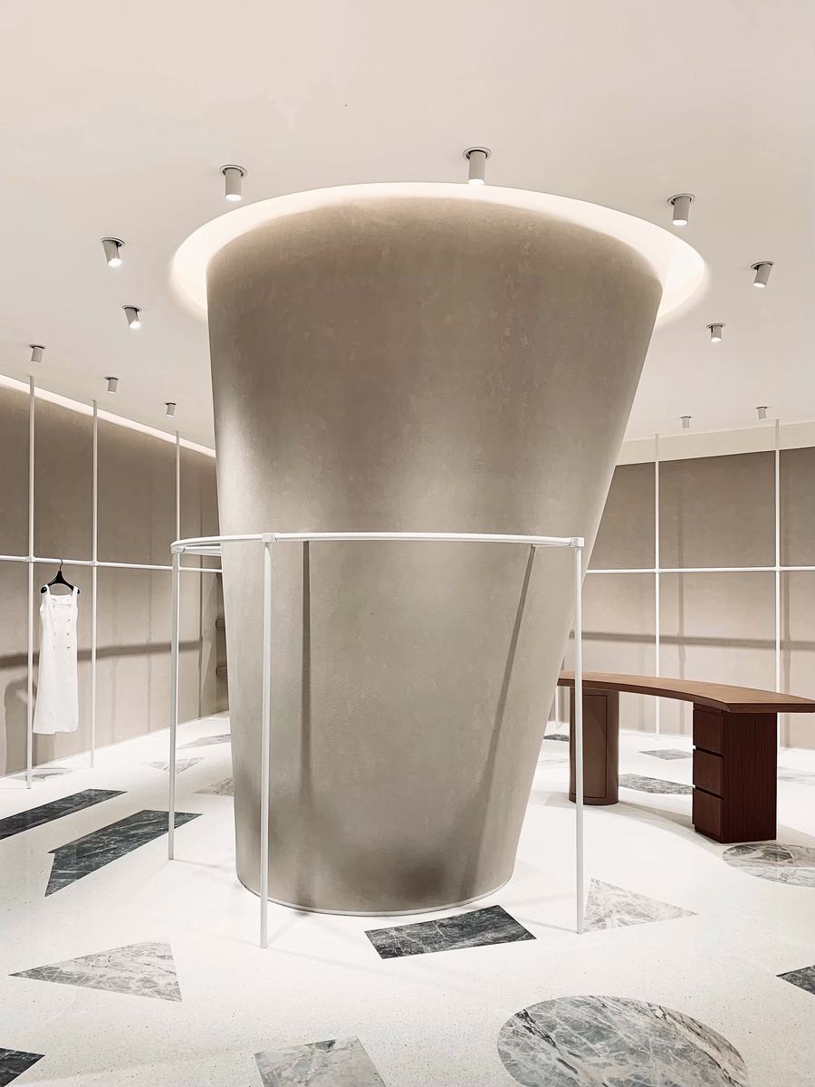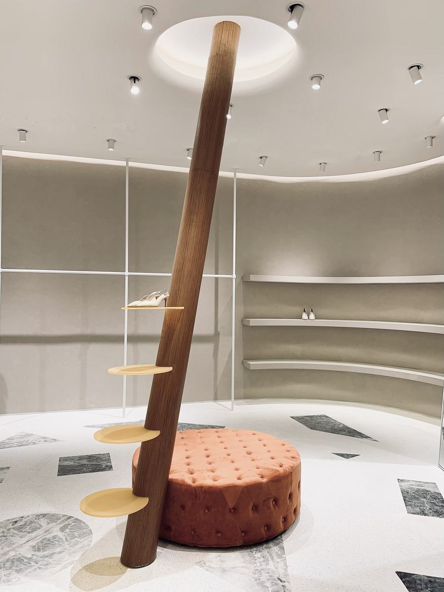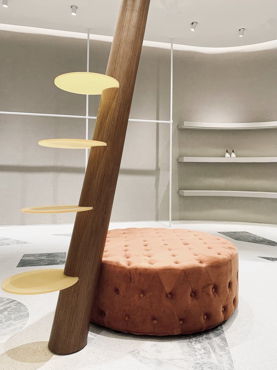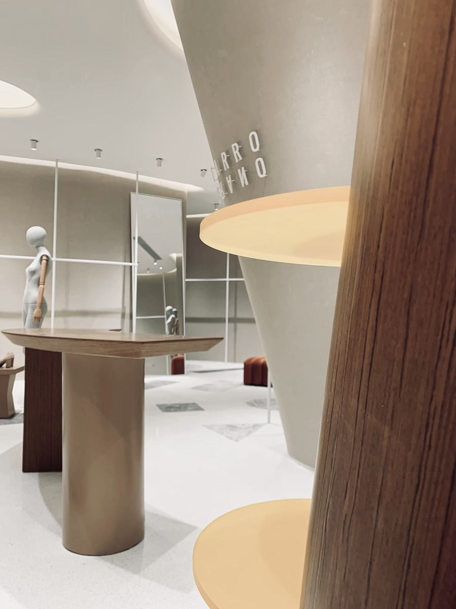 店面的墙面颜色为温和高级的土色,搭配不规则的射灯和简单的陈列架,散发出迷人的温馨典雅气质。店内精致时尚的道具和物品很好地点缀了店内的氛围。通向天花板的倾斜木柱与中间的大柱形成对比,给店铺带来独特的建筑美感。错落有致的倾斜角犹如一首交响乐,为空间注入无限活力