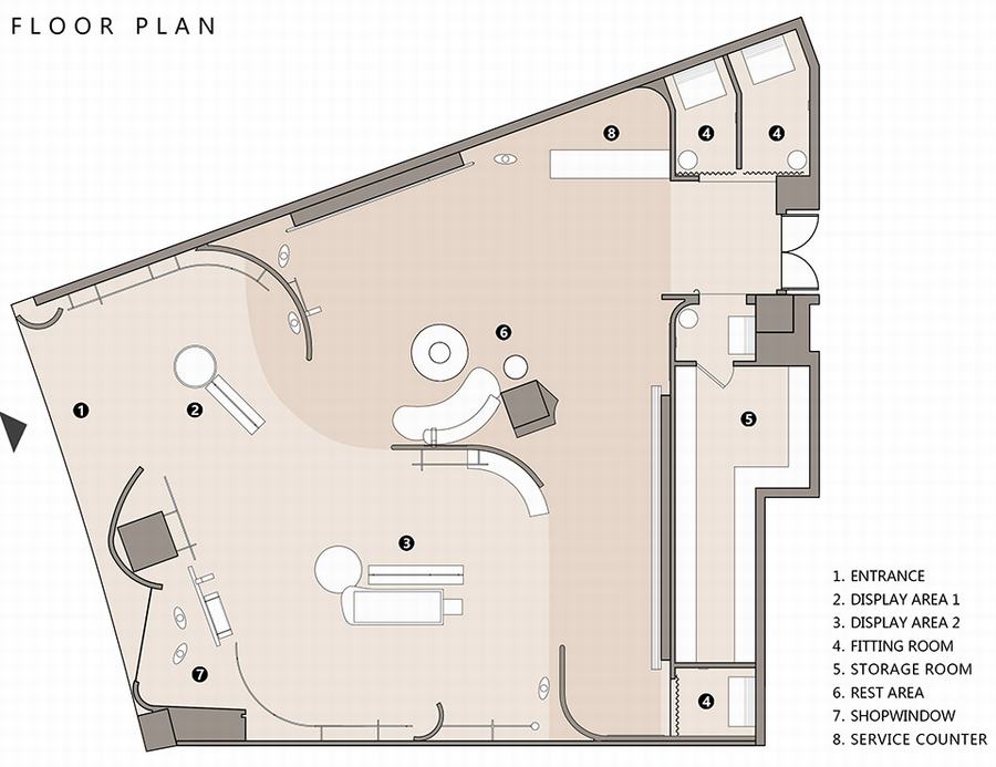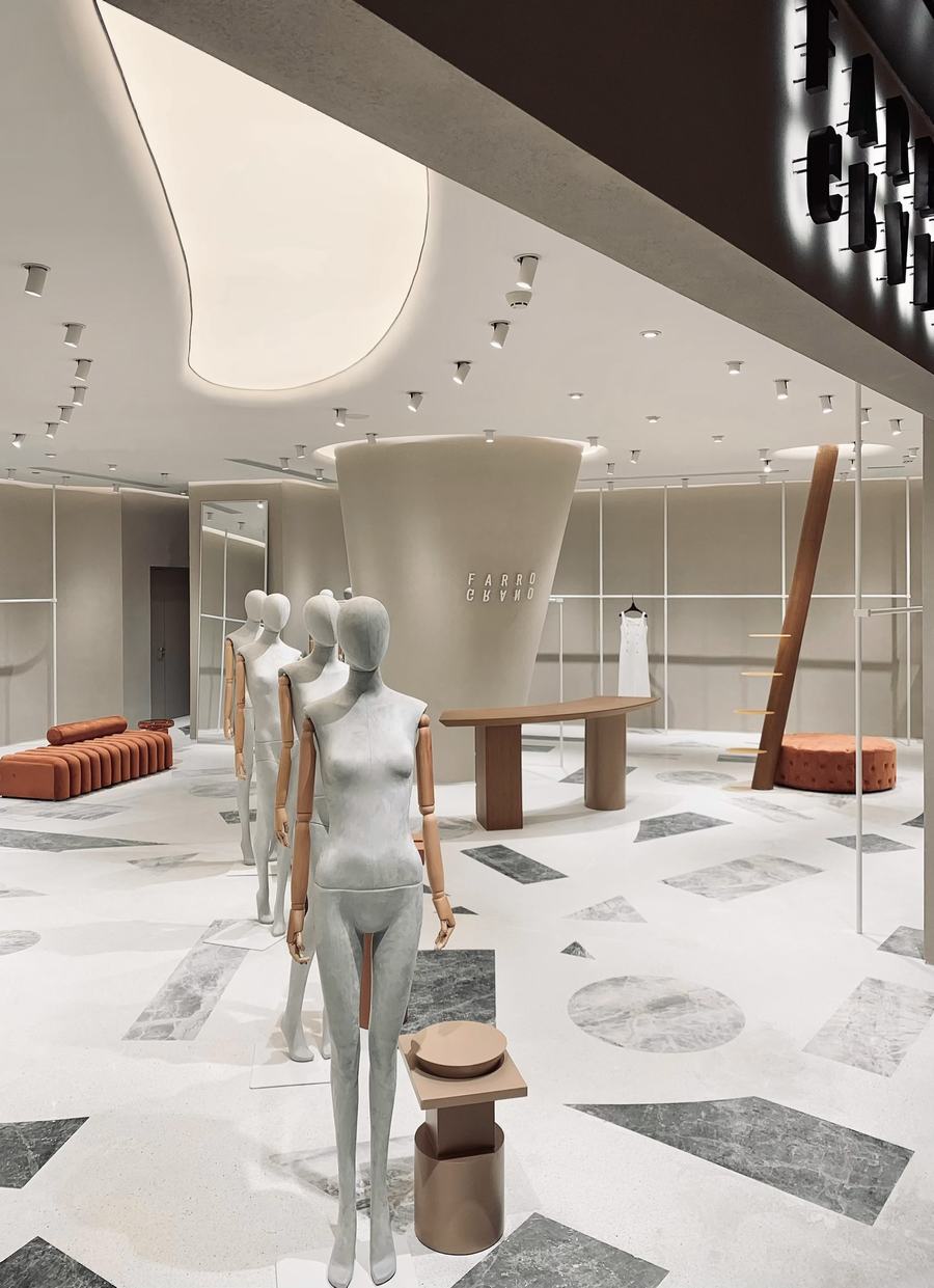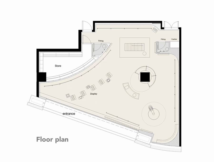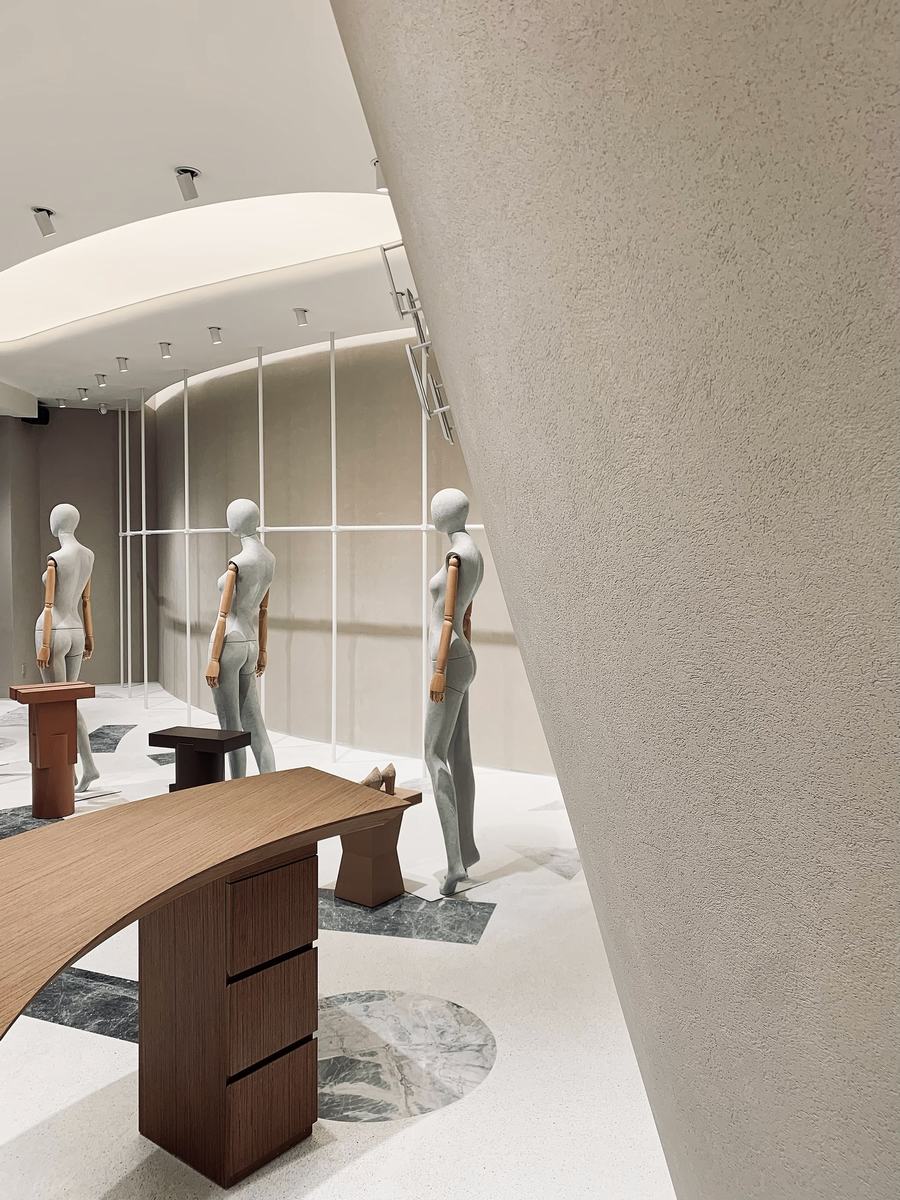 原有的店铺空间并不是等边三角形,最大限度地利用最长的边沿展示店面,近四米的大LED显示屏和开放式橱窗展示所有最具视觉冲击力的效果,使得进入店铺的客人首先捕捉FG传递的品牌信息,店面入口巧妙地与橱窗陈列结合在一起,带着秀场模特刷过去,将客人带入店内,让人身临其境地体验店铺。