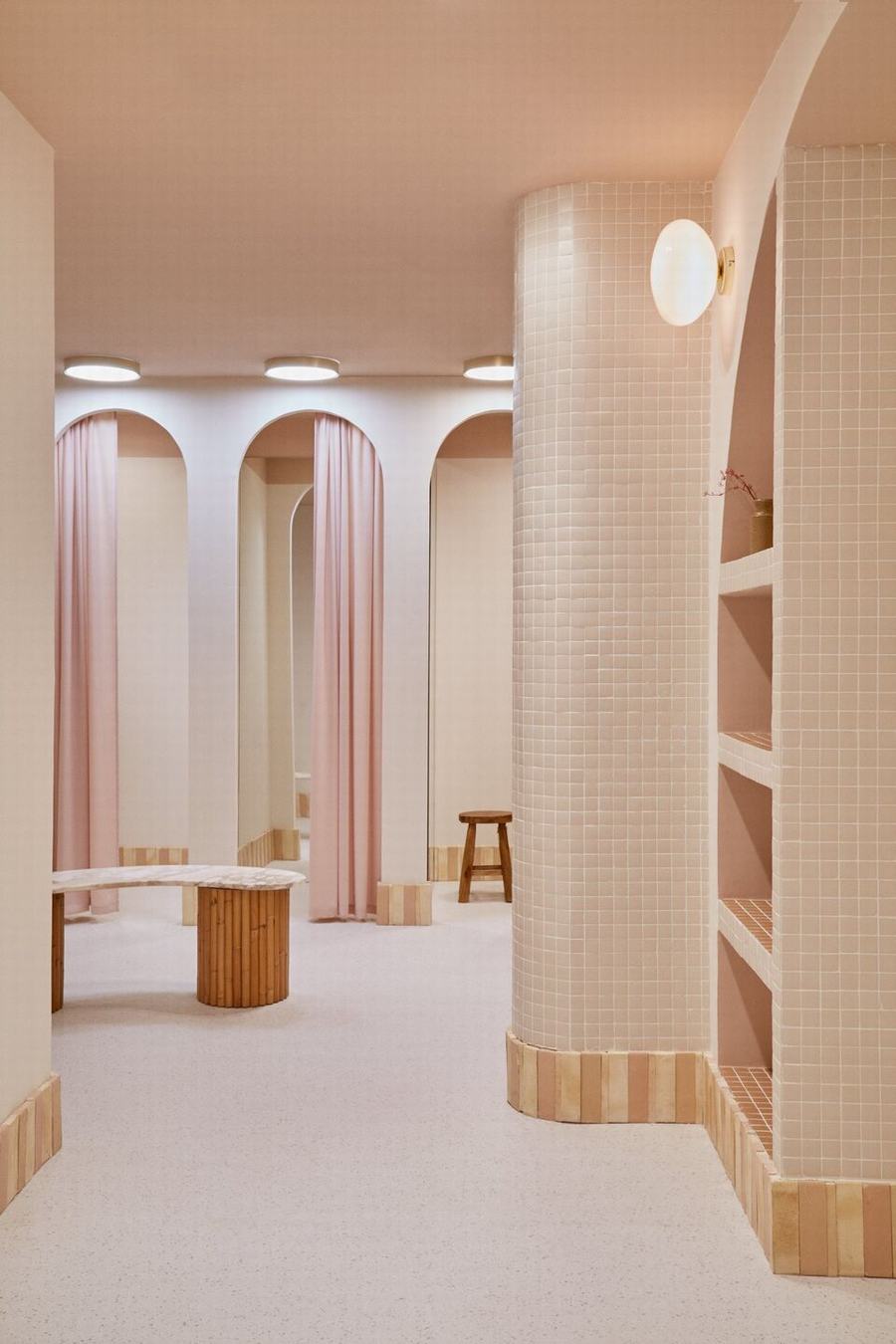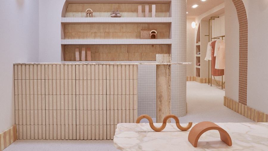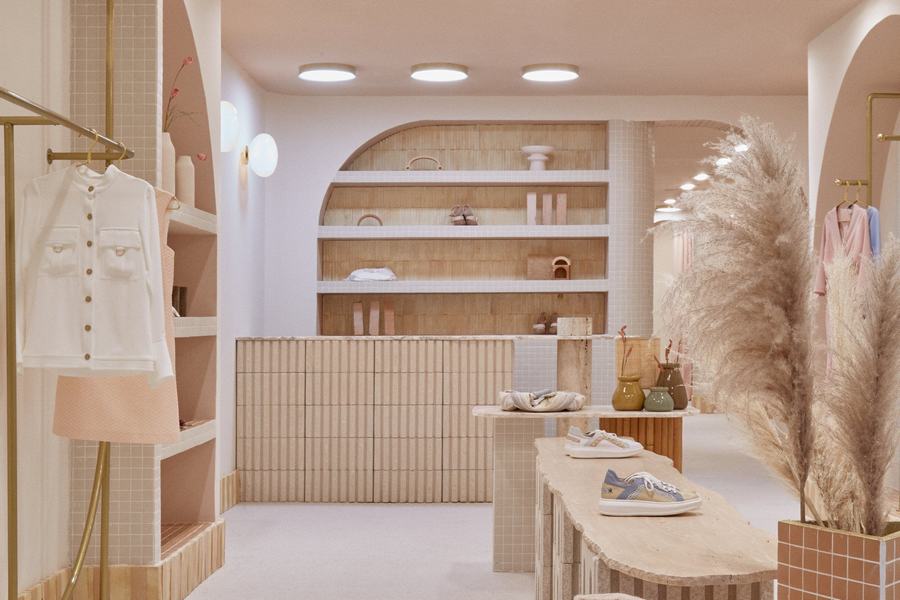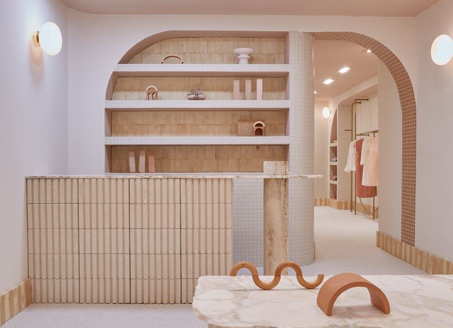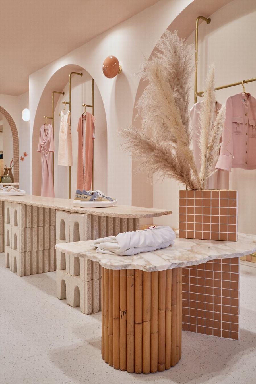 商店的家具选择了土的颜色,与天花板、拱门和踢脚板的边缘的暖色调形成对比。石灰华大理石与葡萄牙粉色大理石相结合,用于装配区的中央桌子、柜台和长凳。整个商店都是用不同色调的粘土块制作的踢脚板,并在整个商店里一块一块地放置。灯光的分布创造了温暖的氛围,尊重了服装的色调。