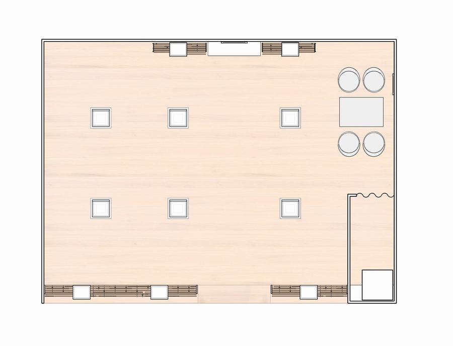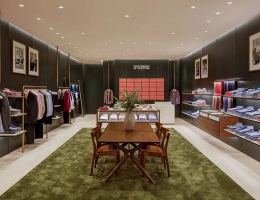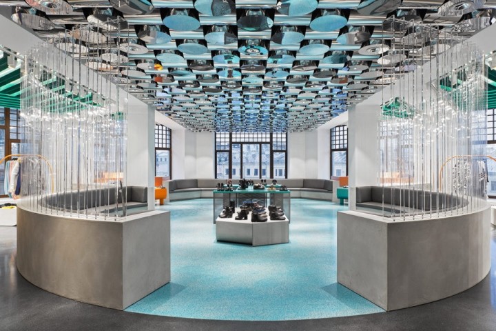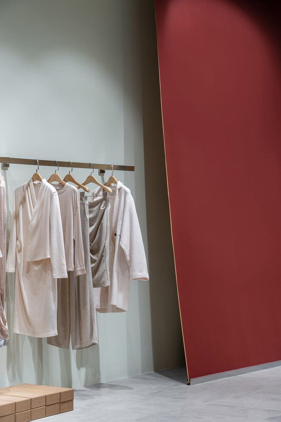 由于店铺是临时的,所以我们尽量使用原创的现成的材料和简单的结构来达到最大的效果。考虑到新的天花板和吊顶施工周期较长,我们保留了原有的天花板和吊顶。在空间划分上,选择了服装最常见的材质“面料”来塑造整个空间。