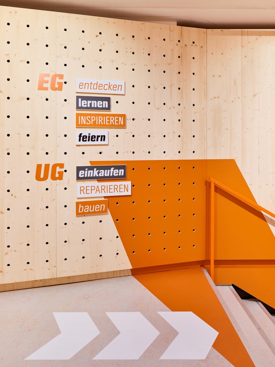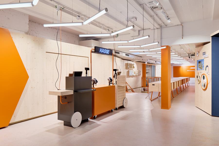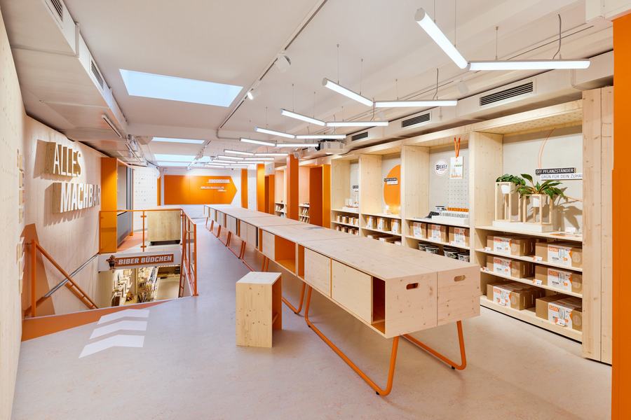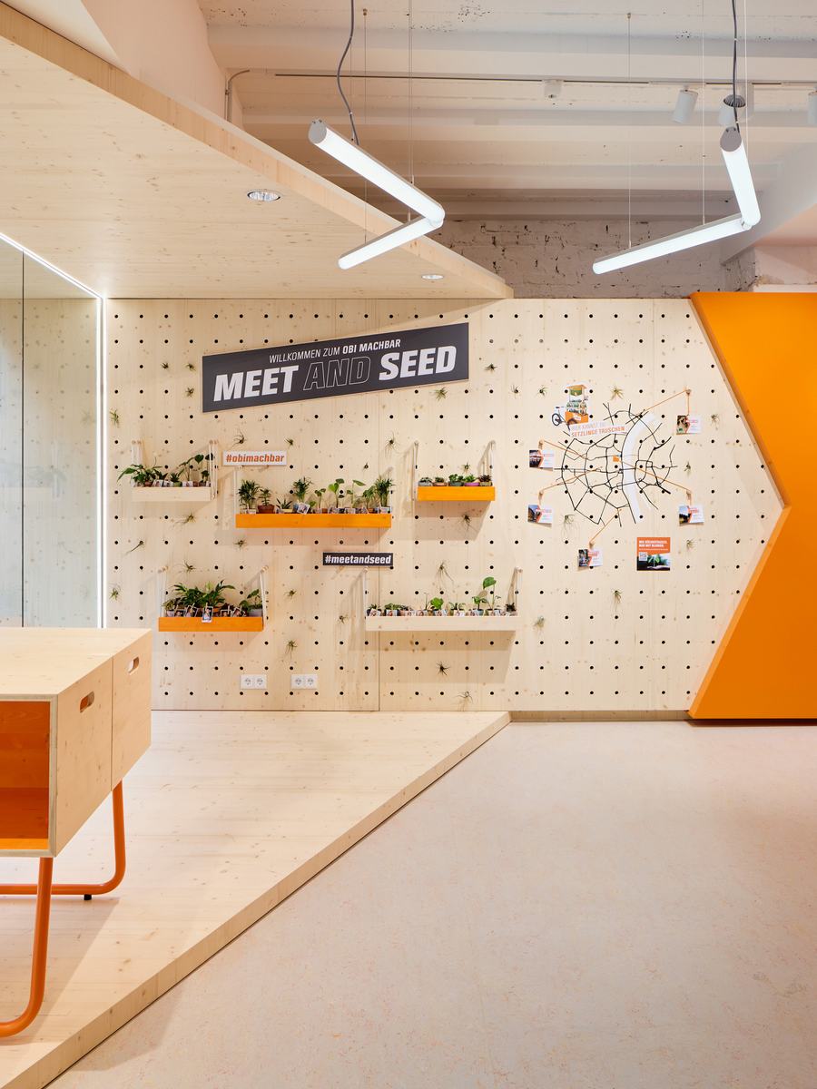因此,贯穿整个房间的工作台是由独立的模块组成的,它是多功能的——商店内部只是适应每个活动和DIY主题。所有天然松木家具、架子和穿孔墙都是由我们建造和规划的。就像OBI风格的混合器互动CREATE,将建筑材料与科技相结合。当然,所有的材料都可以在OBI的产品范围内找到,并且在选择材料时考虑到了可持续性。