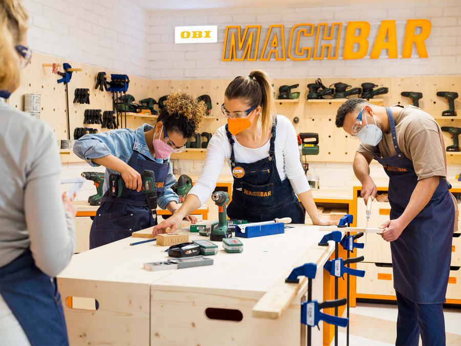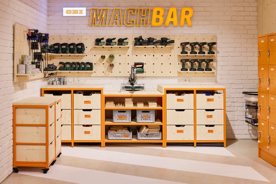 OBI MACHBAR /科隆迷你DIY店,灵感之源,工作坊和活动地点- OBI MACHBAR体现了目标群体的创造力,并在二维和三维空间中提供创意。全渠道战略Instagram、Youtube、抖音:DIY拥有数百万粉丝。OBI深知这一点,并将线上和线下的体验融合在一起,形成了一个独特的概念:OBI MachBar。