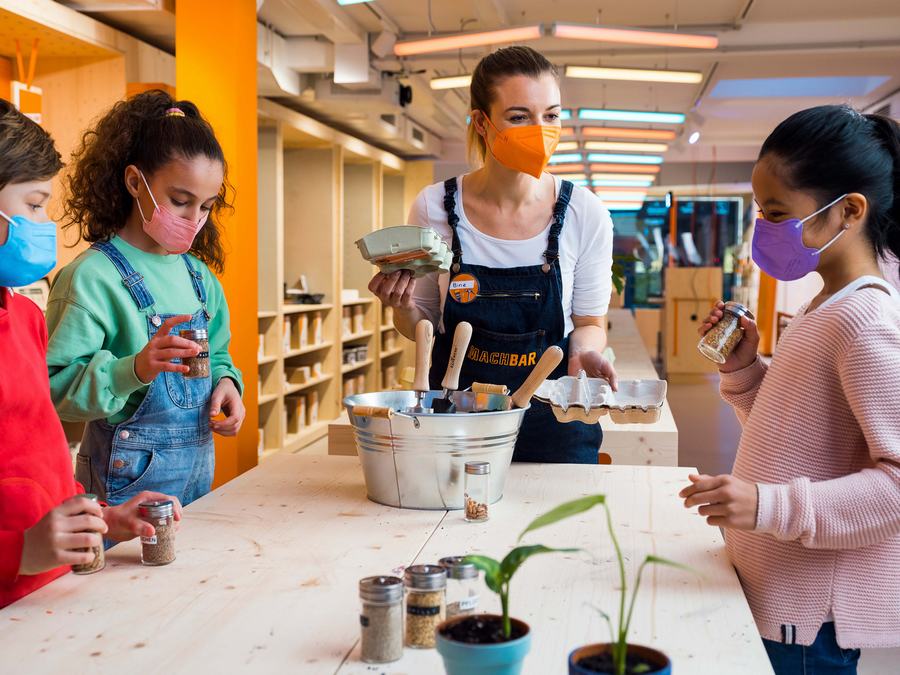 午饭休息时,下班后,或者购物时的偶然造访。主办研讨会是这一概念的核心。这为目标群体提供了一个机会,让他们已经在社交媒体上看到的季节性想法变成现实。这些材料在商店里都能买到。参与者一起在一个巨大的工作台上建造、敲打和绘画——这是社区精神的象征。