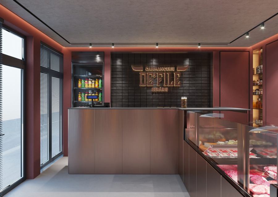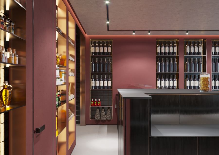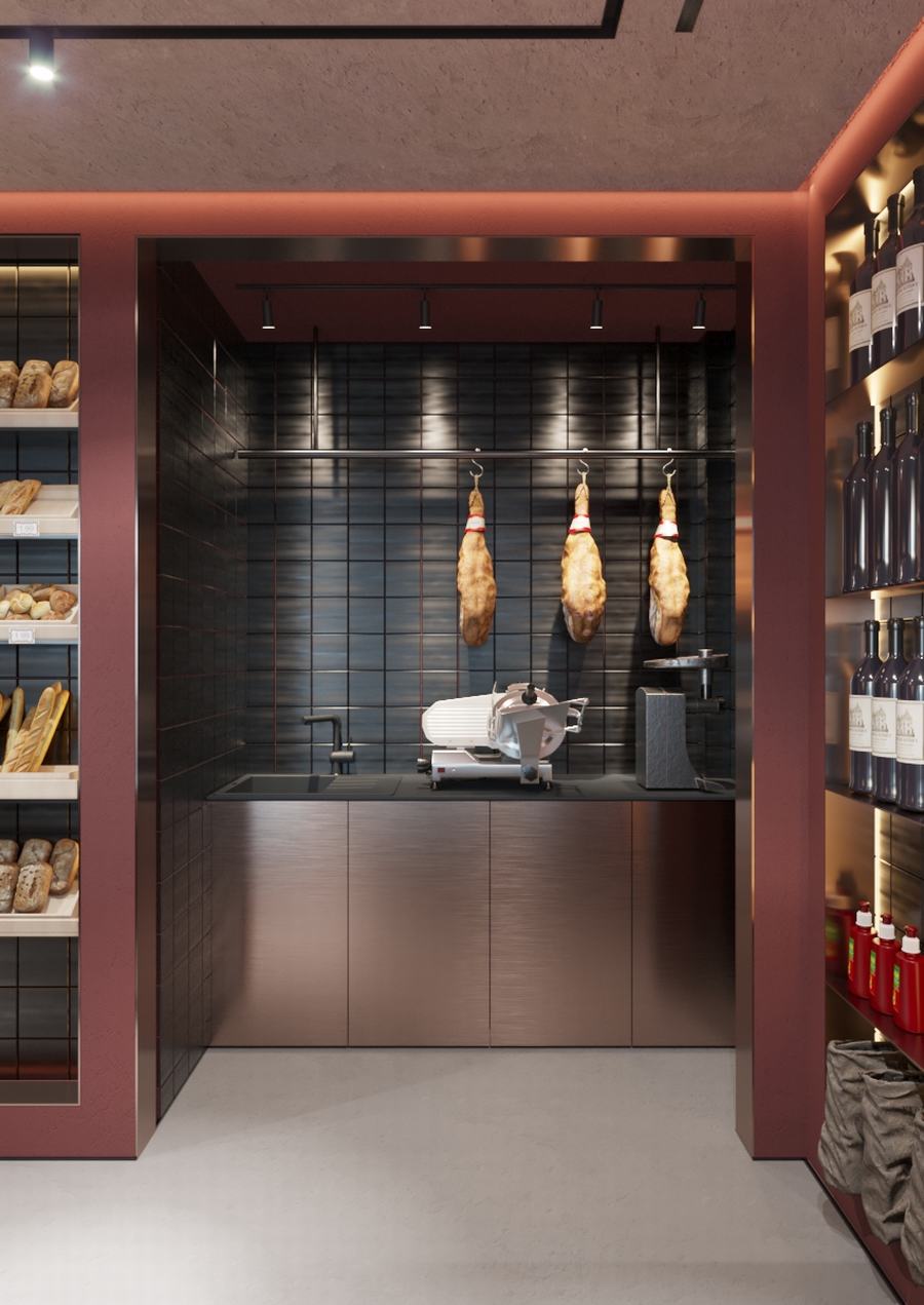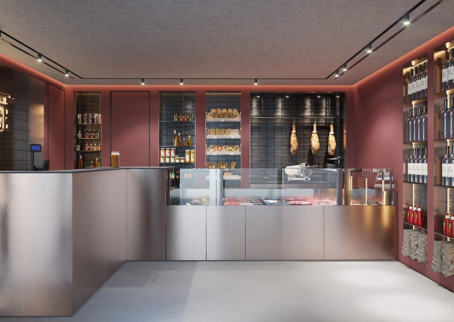 由于空间有限,我们放弃了装饰细节,将陈列柜布置在屠宰场周边,为参观者提供足够的走动空间。分区是该项目的主要挑战之一,但我们设法为每个产品类别创建了一个单独的空间。于是,我们把放着肉和香肠的陈列柜放在中间,左右两边都安排了卖葡萄酒和啤酒的区域。一切都是在简洁的线条和战略照明的帮助下创造出来的。