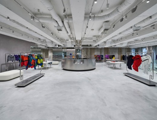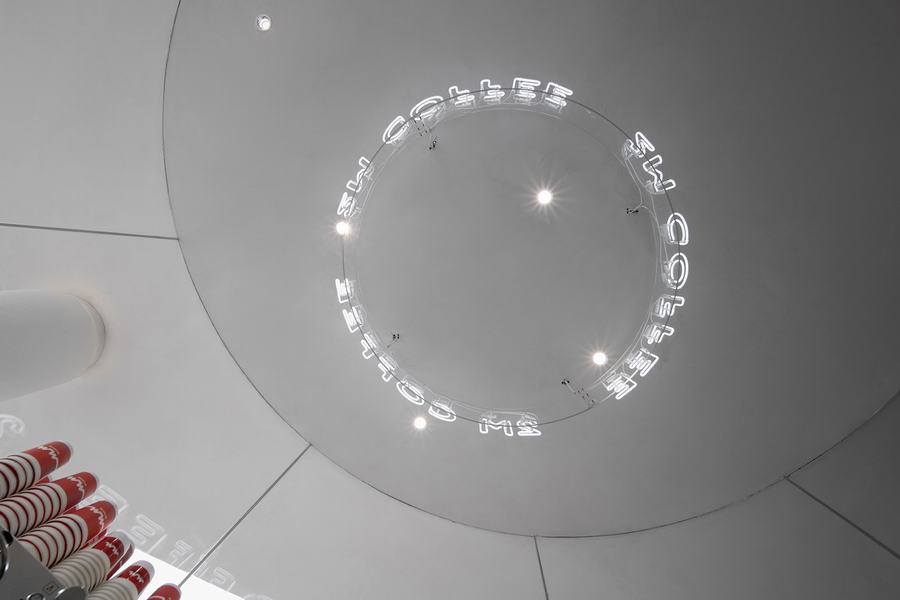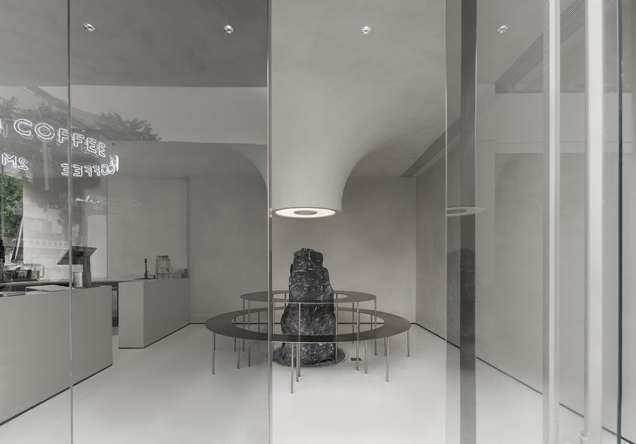 整个室内空间的色调和风格设计都以中间的黑色山石为重点。黑色的山石象征着2M坚如磐石的咖啡品质,不锈钢桌椅的两圈象征着产品品质所形成的声波,如同2M不断扩张的良好口碑。顶部的倒小号造型和不锈钢座椅与黑色山石形成的正小号造型,通过柔和的线条连接,将整个室内空间融合在一起,形成自然的内部结构,传达2M品牌自然朴实的态度。